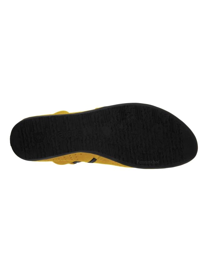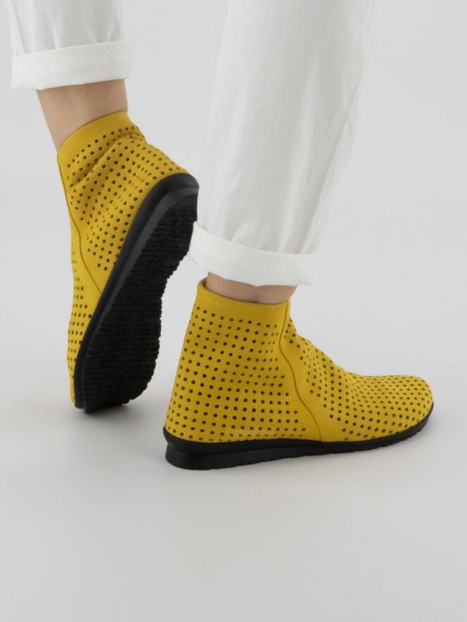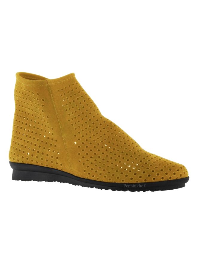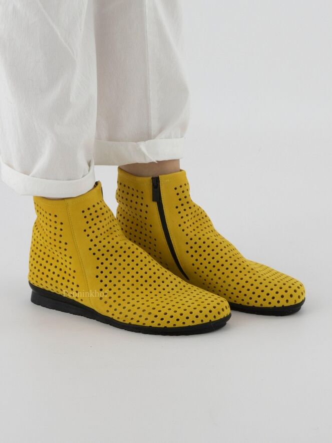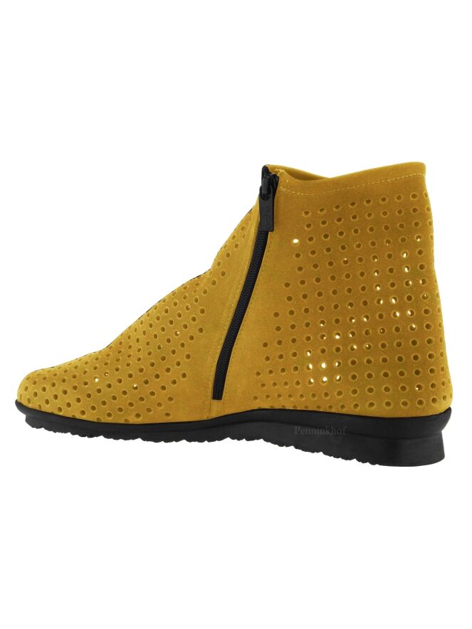 A short boot from Arche in the color yellow. The nubuck suede is finely perforated. There is a zipper on the inside and the boot has a round toe.