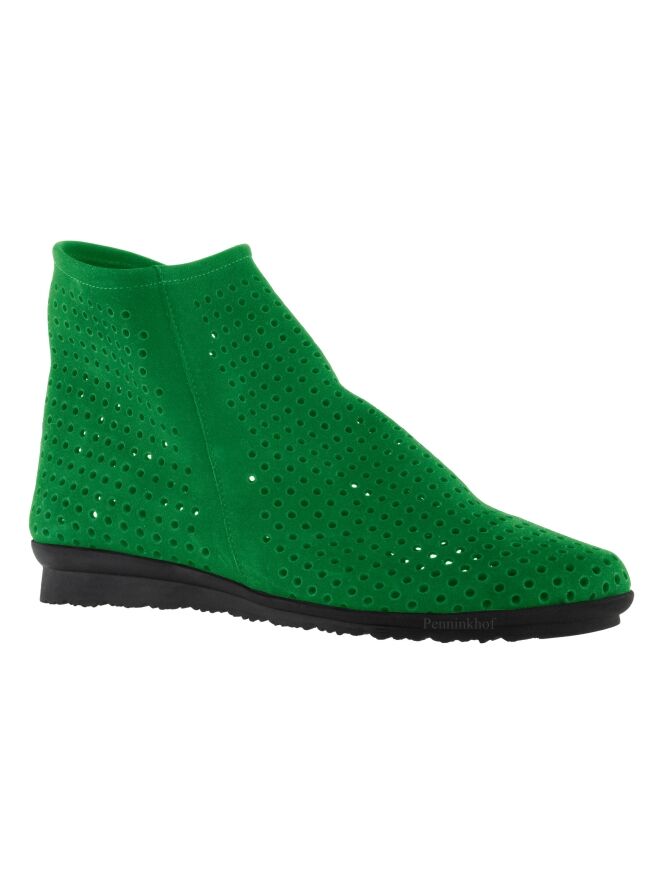 A short boot from Arche in the color green. The nubuck suede is finely perforated. There is a zipper on the inside and the boot has a round toe.