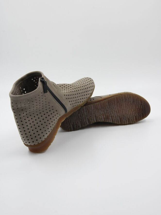 A short boot from Arche in colour taupe. The nubuck suede is finely perforated. There is a zip on the inside and the boot has a round toe.