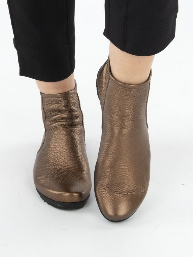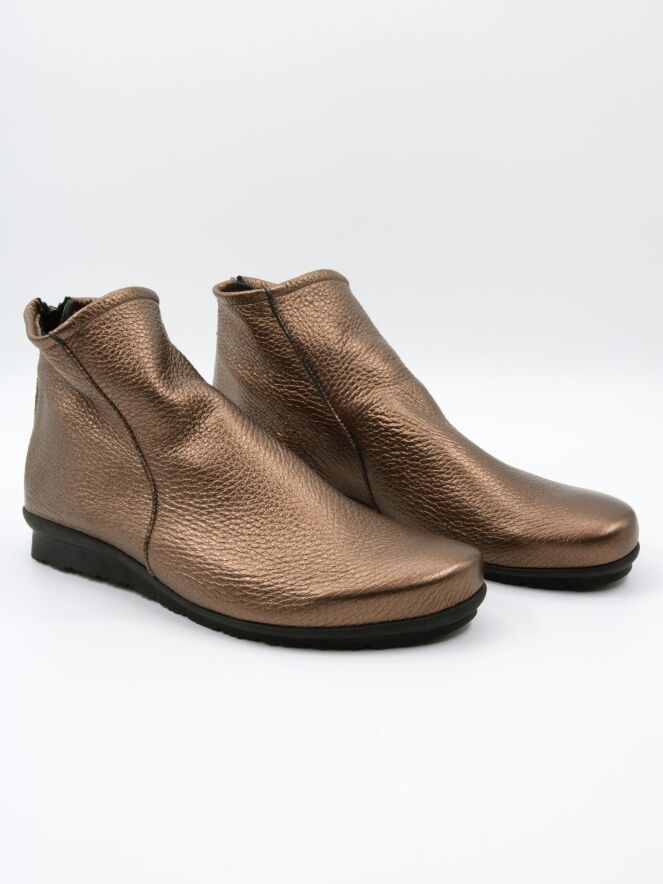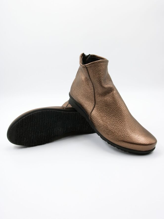 A short boot from the brand Arche in metallic copper color, with a zipper on the heel. The boot is made of very soft leather and is unlined on the inside. The sole is made of latex with a slight elevation at the back, enhancing the wearing comfort.