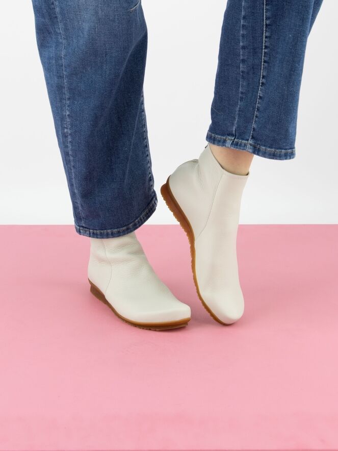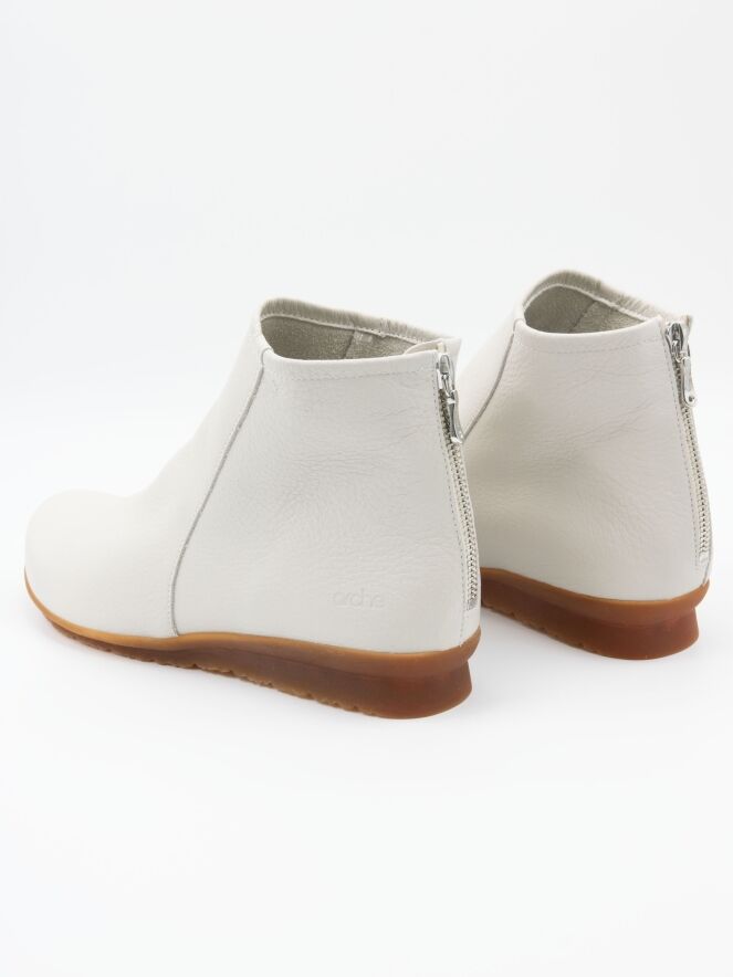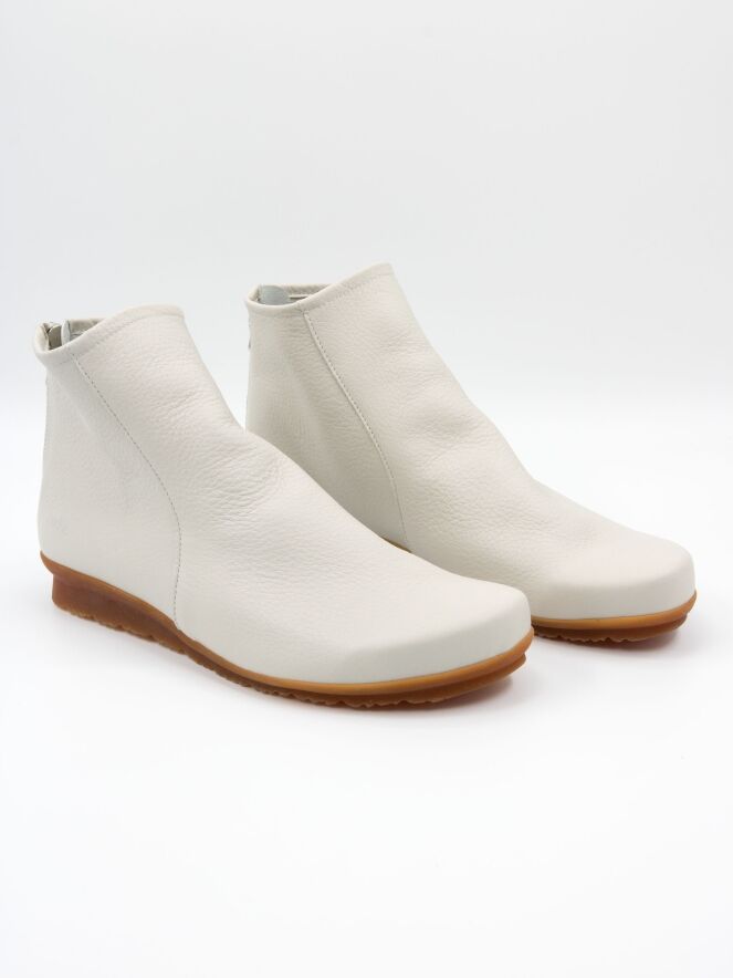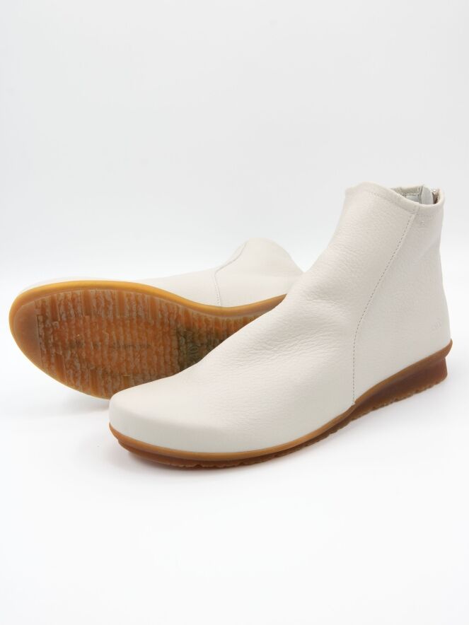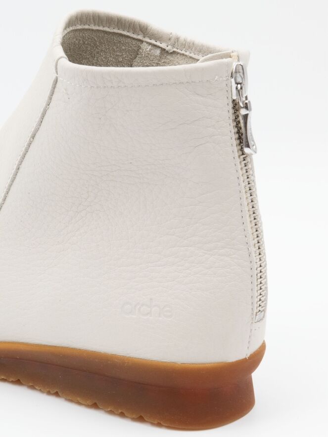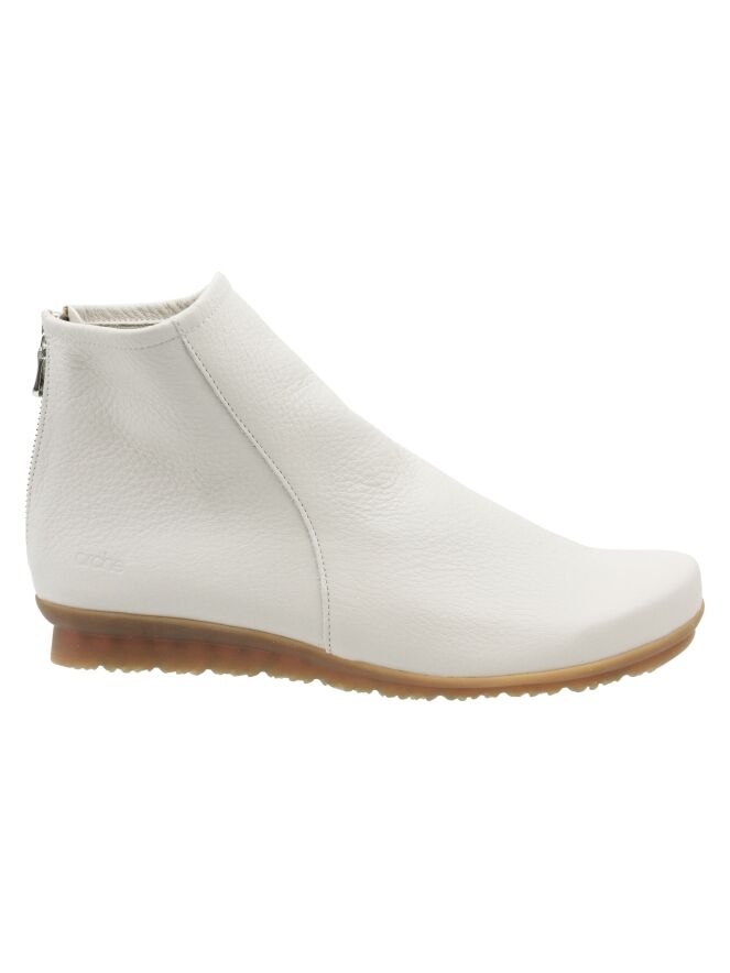 A short boot by Arche in mozzarella color. A zipper is placed at the heel. The interior is unlined, and the boot features a rounded toe. The sole is in a honey-colored finish.