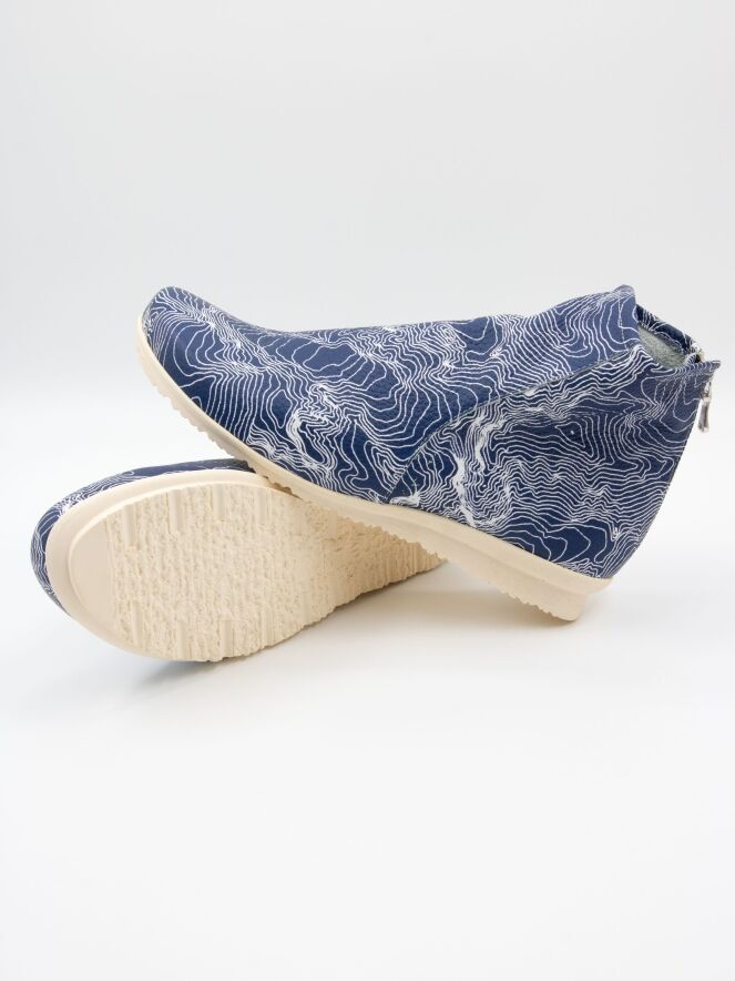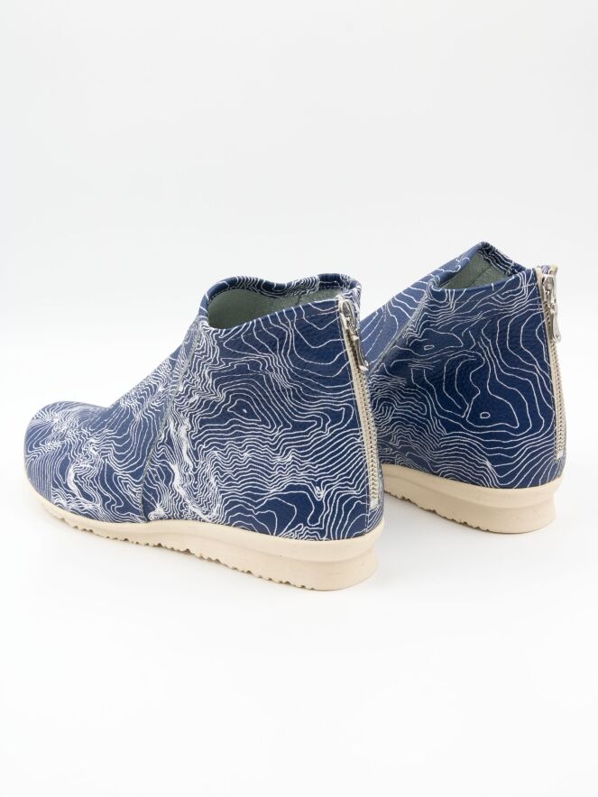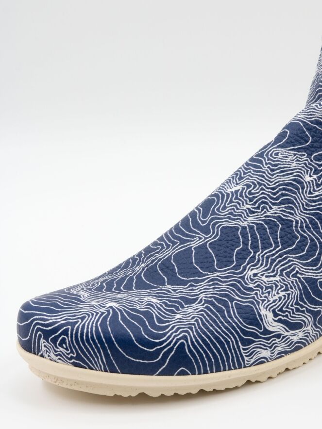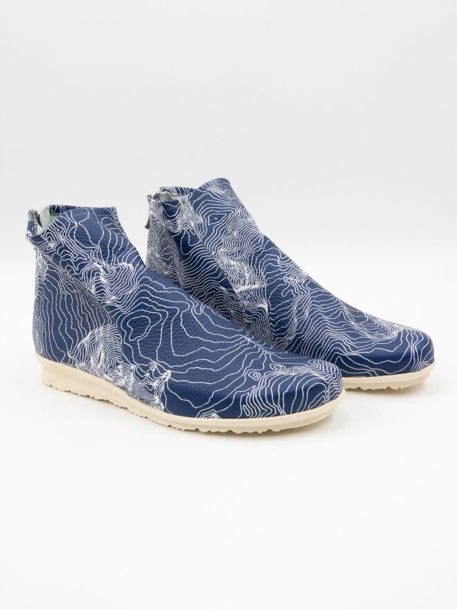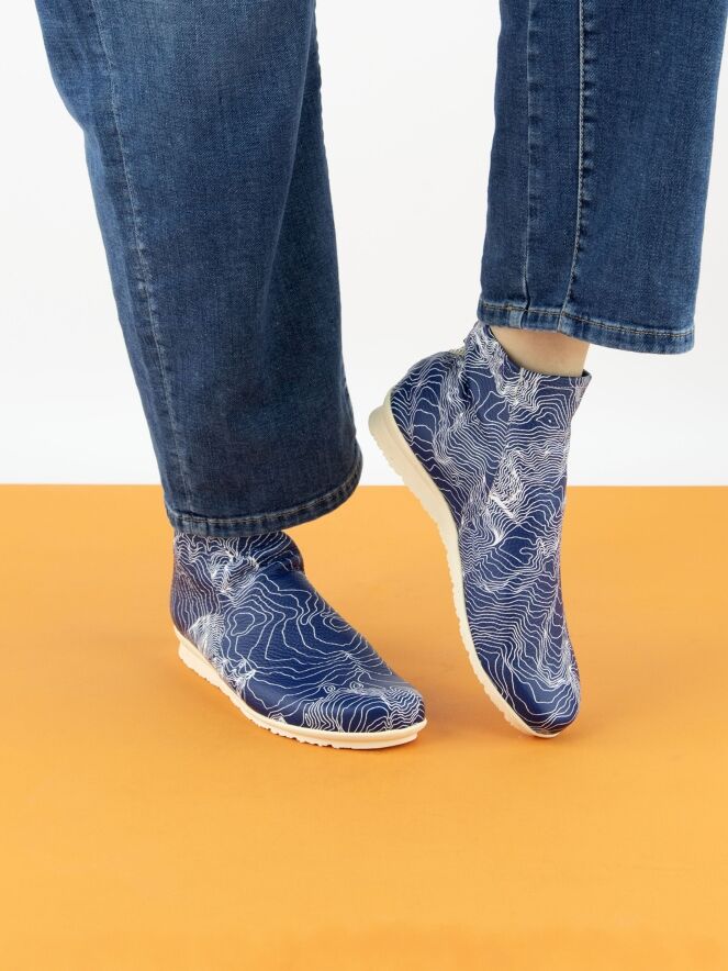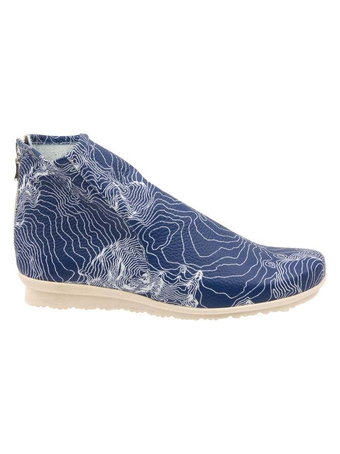 A short boot by Arche featuring a graphic print of white lines on a blue background. The zipper is placed at the heel. The boot is made from very soft leather with a subtle sheen and is unlined on the inside. The latex sole has a slight elevation at the back, enhancing comfort.