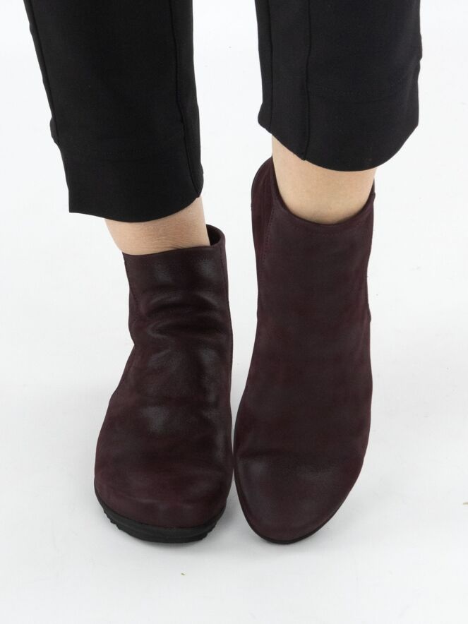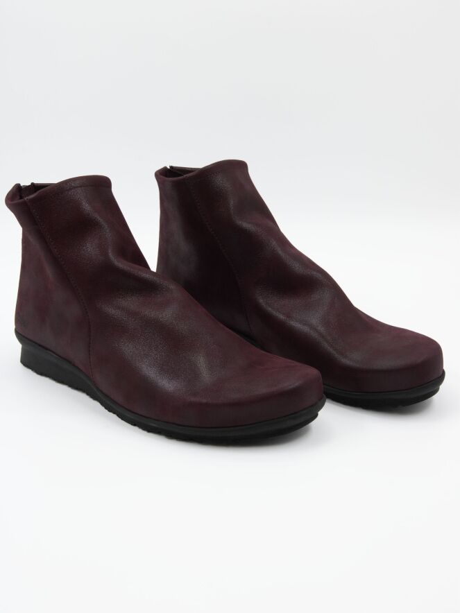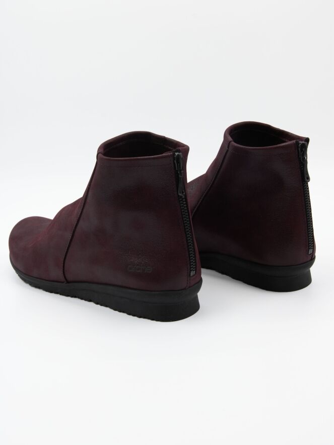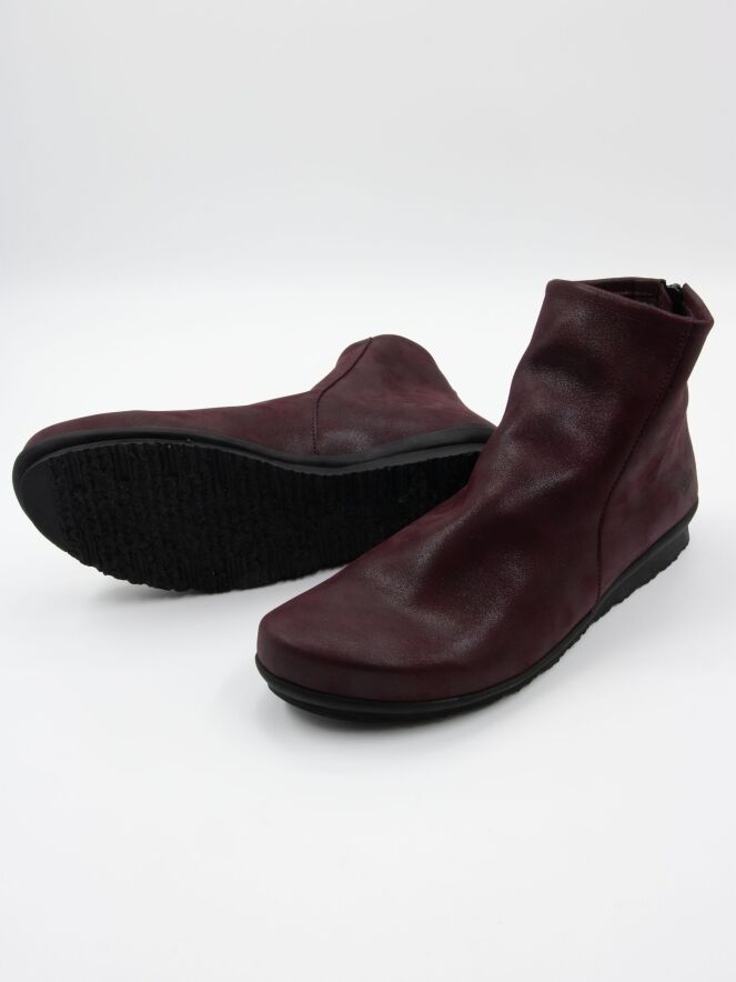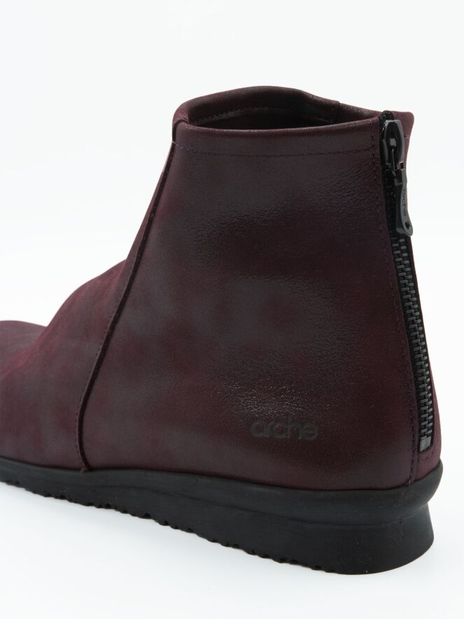 A short boot from the brand Arche in a Bordeaux red color with a zipper on the heel. The boot is made of very soft leather that has a slight sheen and is unlined on the inside. The sole is made of latex with a slight elevation at the back, enhancing the wearing comfort.
