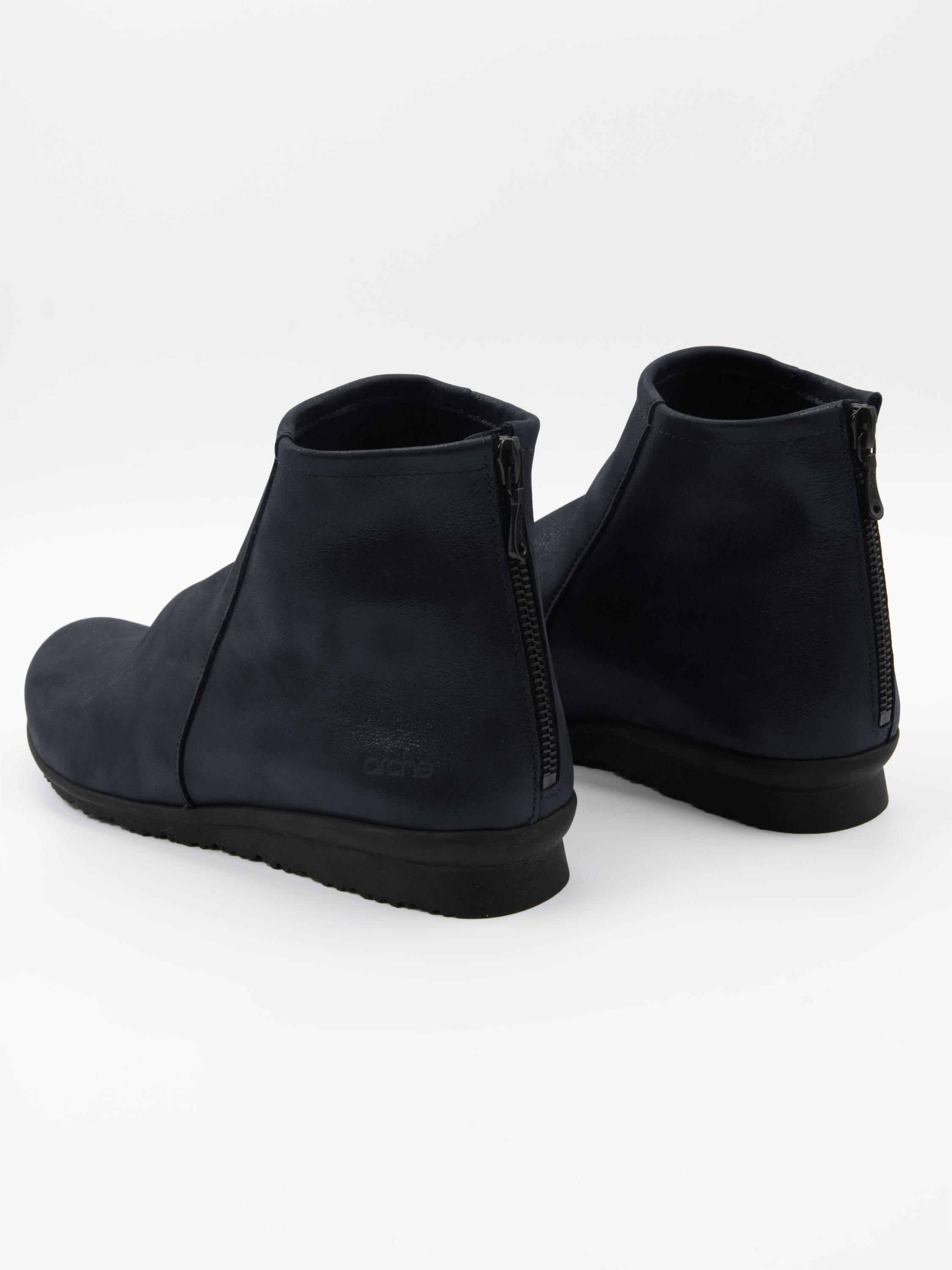 A short boot from the brand Arche in navy blue with a zipper on the heel. The boot is made from very soft leather that has a slight sheen and is unlined on the inside. The sole is made of latex with a slight elevation at the back, enhancing the comfort level.