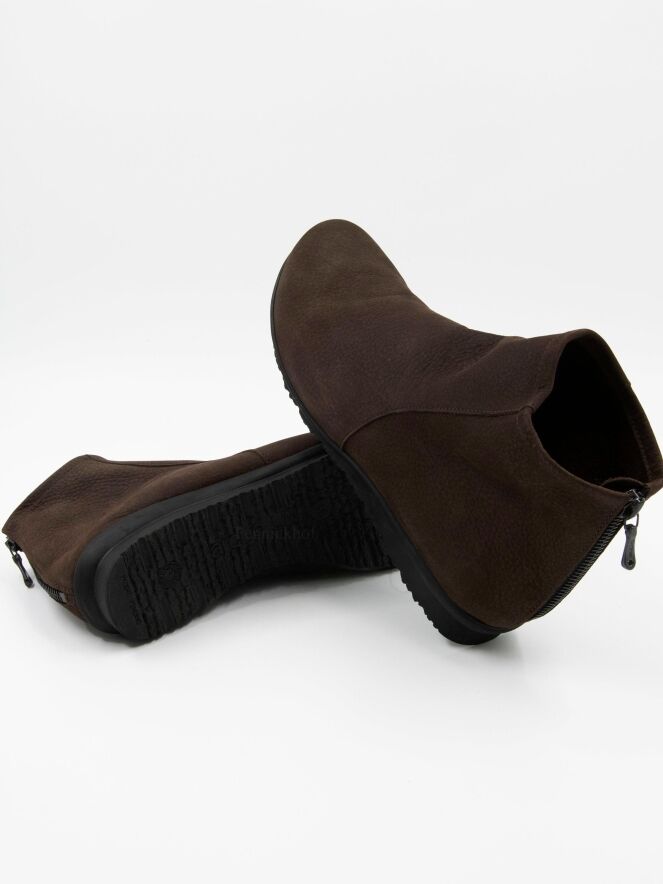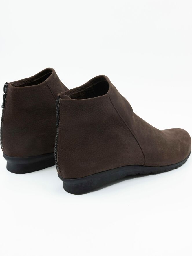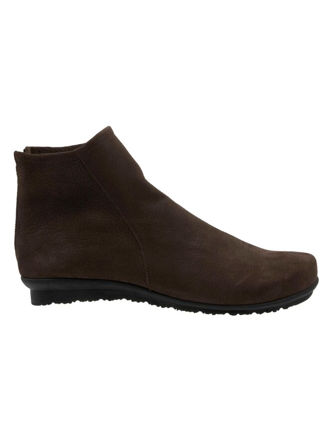 A short boot from Arche in the colour mocha brown. On the heel is a zip fastening. The inside is unlined and the boot has a round toe.
