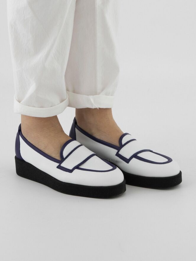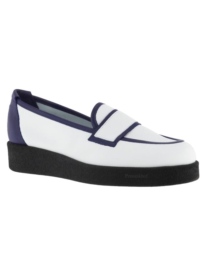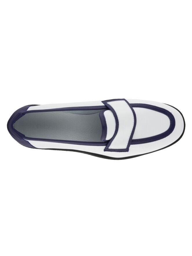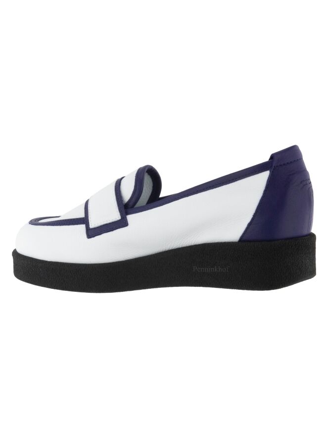A loafer from Arche in the color white. Across the forefoot and along the edge of the shaft is a dark purple leather trim. The heel is in a dark purple leather.