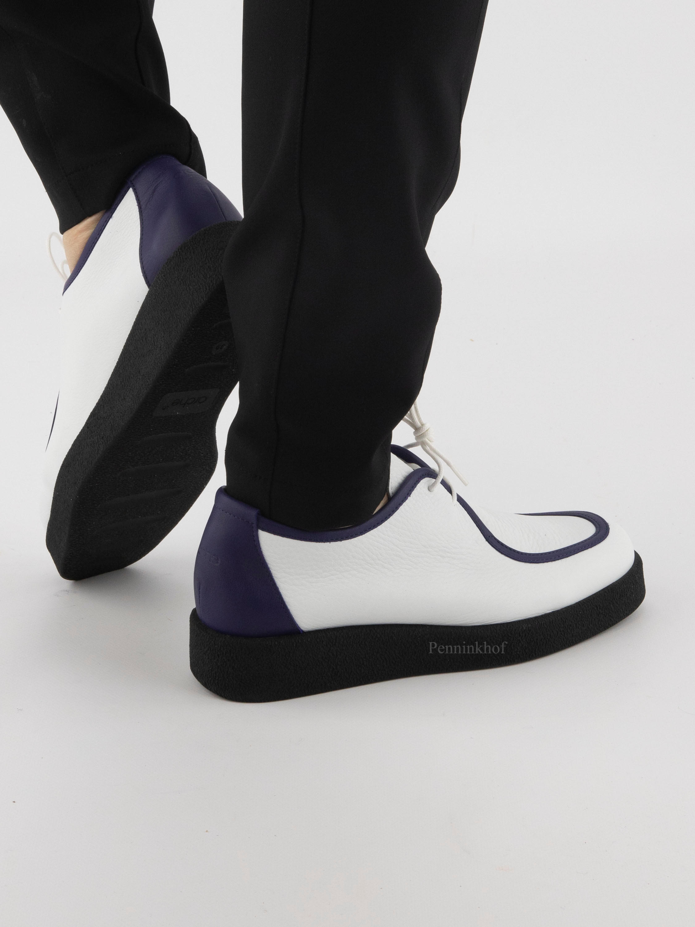 A loafer from Arche in the color white. Across the forefoot and along the edge of the shaft is a purple leather trim. On the forefoot is a decorative lace. The heel is in a purple leather.
