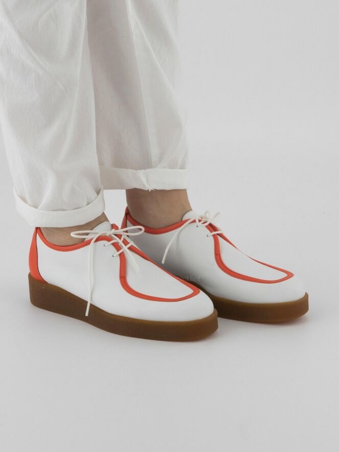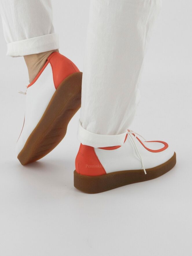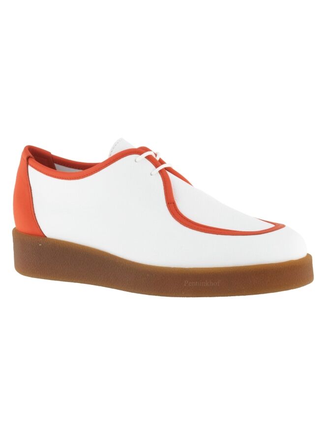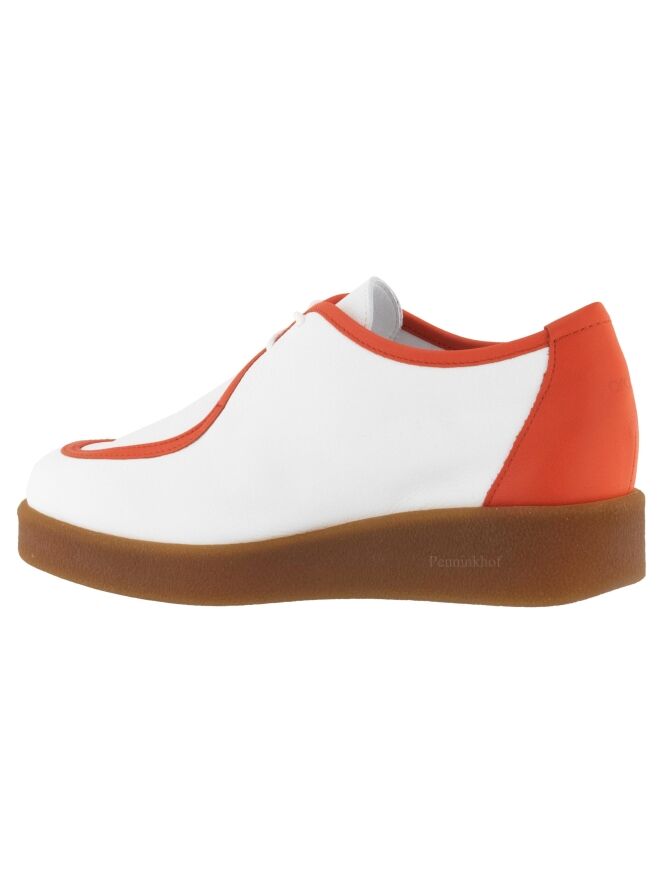 A loafer from Arche in the color white. Across the forefoot and along the edge of the shaft is an orange leather trim. On the forefoot is a decorative lace. The heel is in an orange leather.