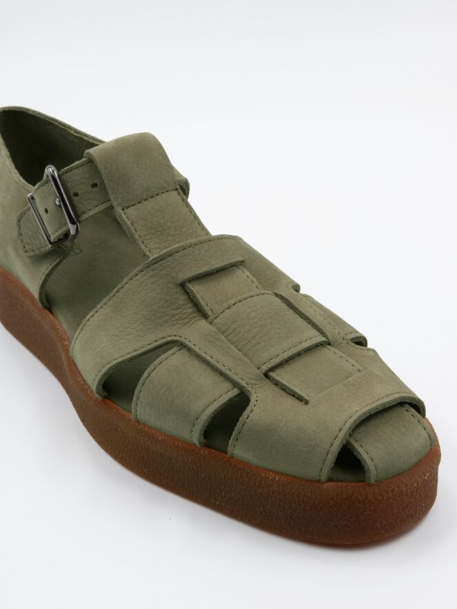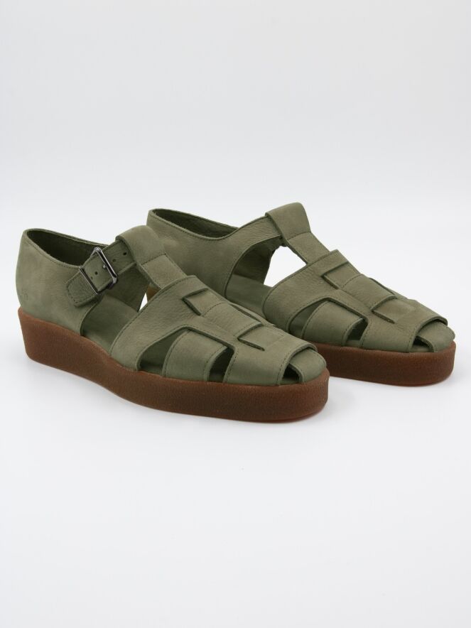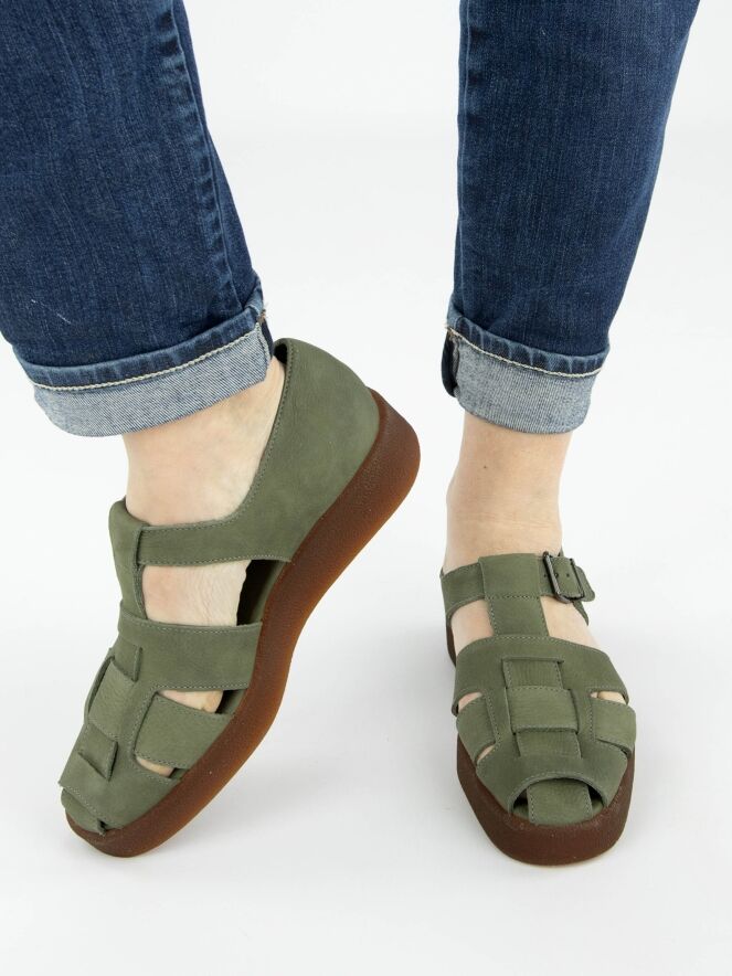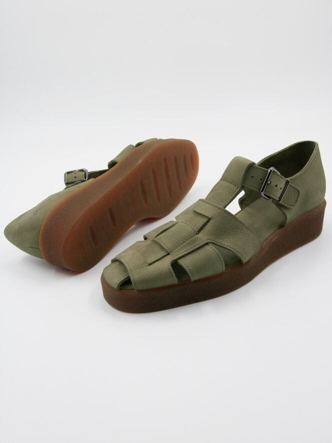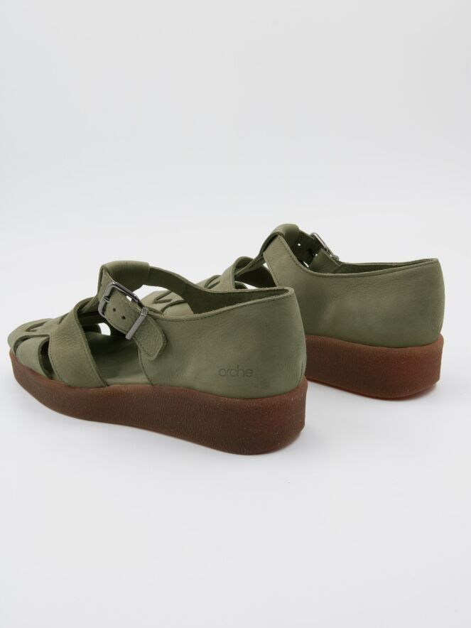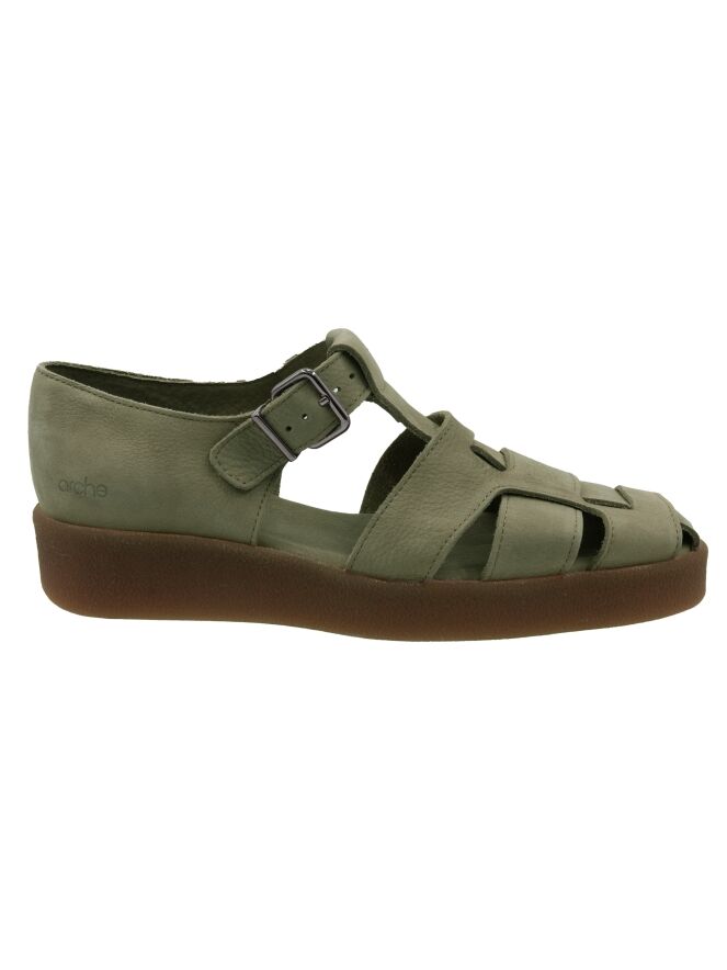 An open sandal from Arche in the color olive green. There are 3 straps over the forefoot with a central strap running from the toe to the instep. The sandal has an adjustable strap. The sole is in the color honey.