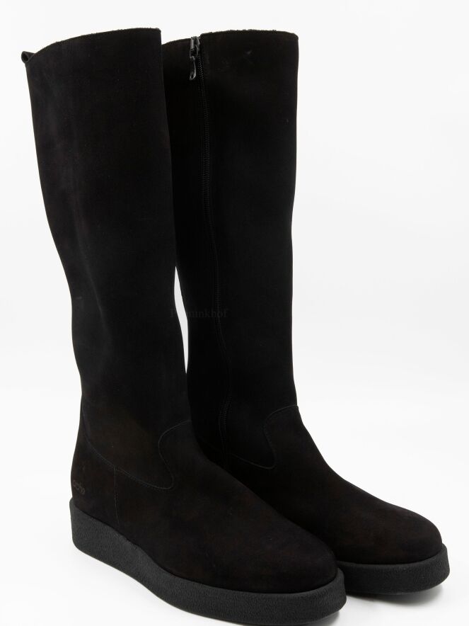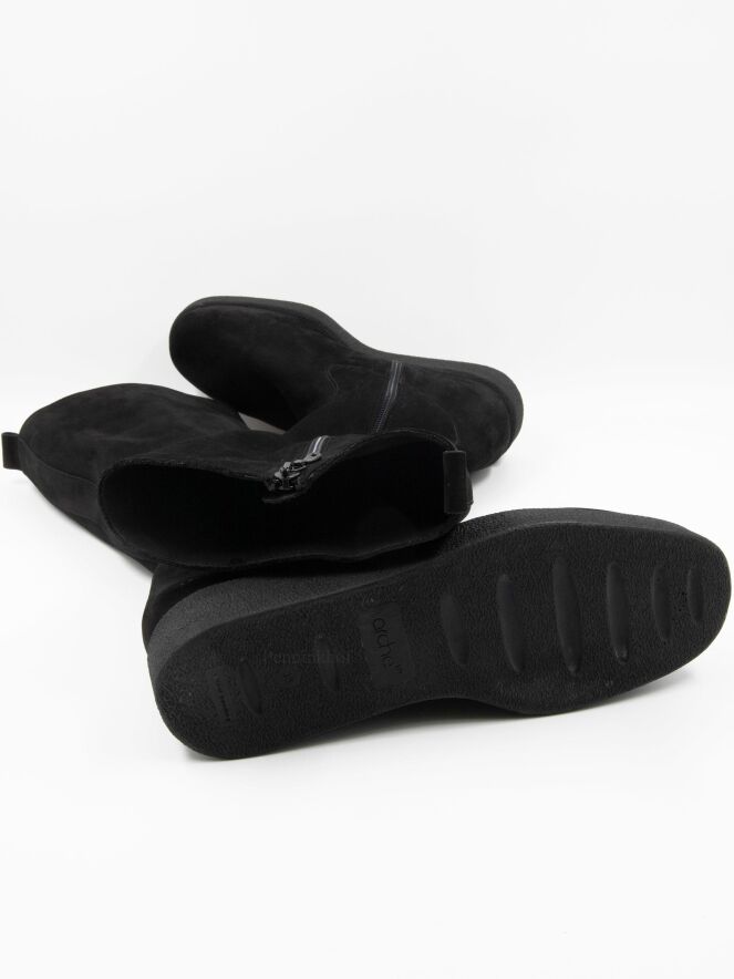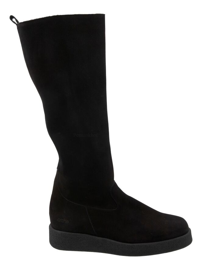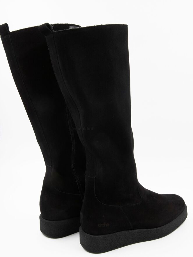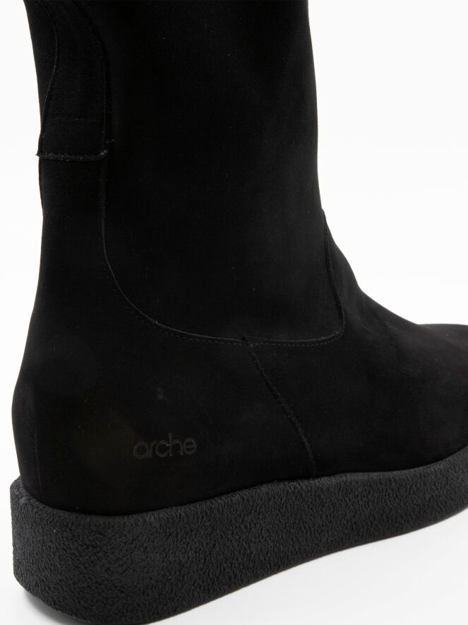 A tall boot by Arche in black color. There is a zipper on the inner side of the shaft. The sole is black. The interior is unlined.