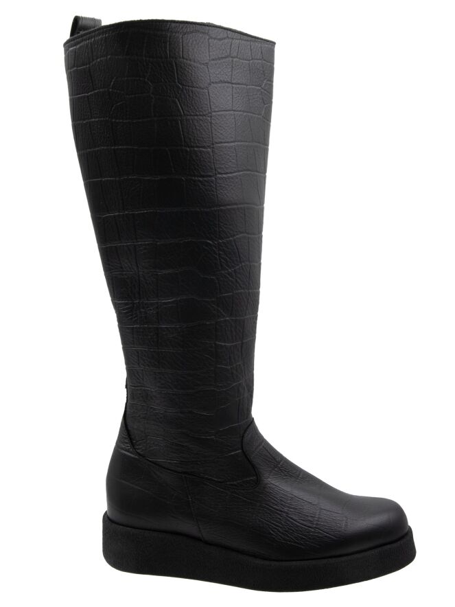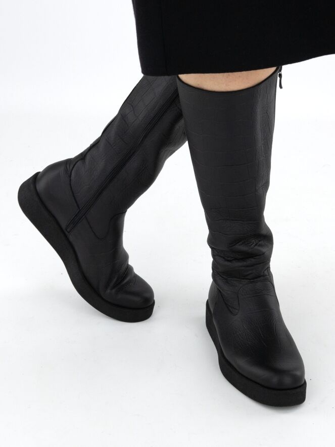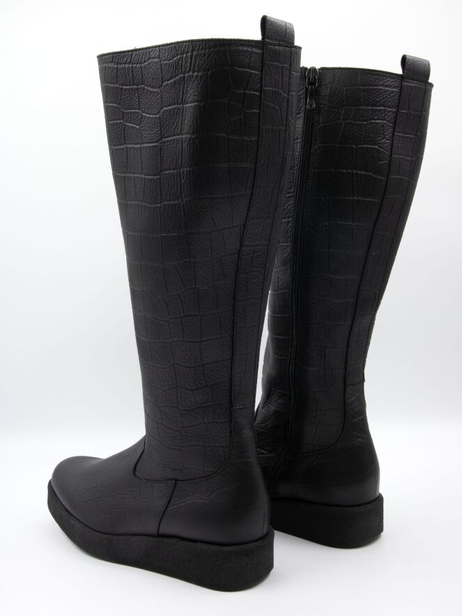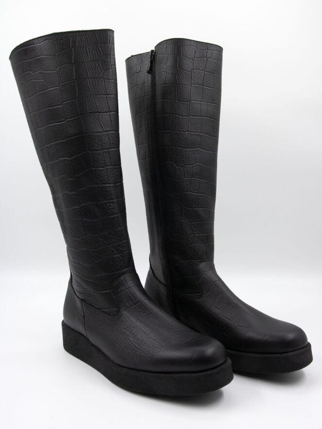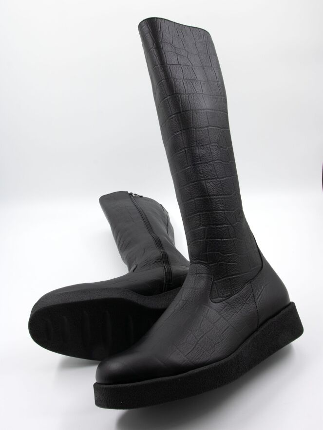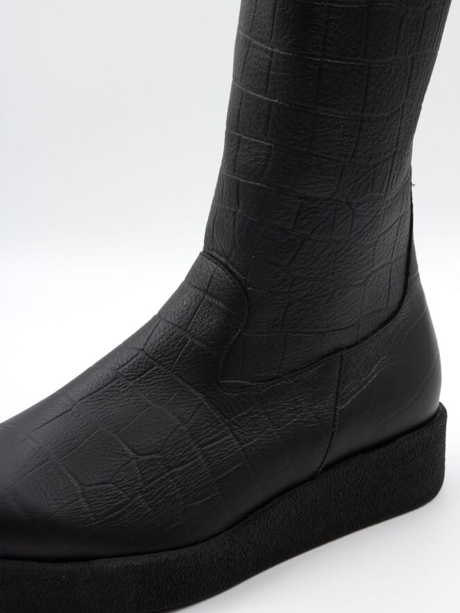 A high boot from Arche in black. The leather is embossed in an irregular chequered pattern. On the inside is a zip along the entire length of the shaft. The forefoot has a round toe and the shaft is unlined. The boot has a latex bacon sole.