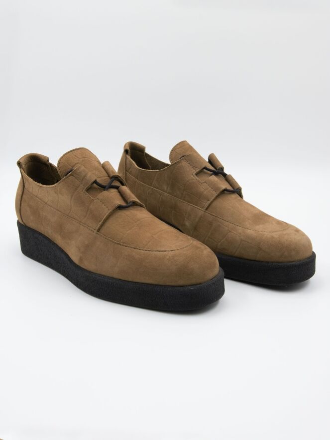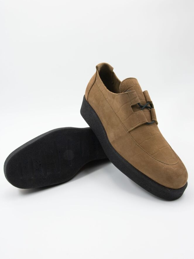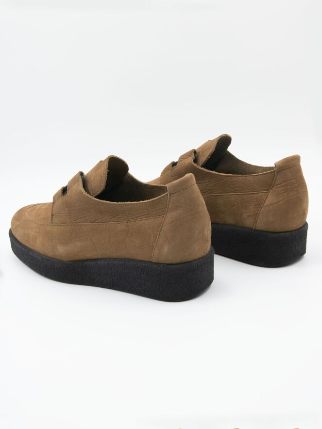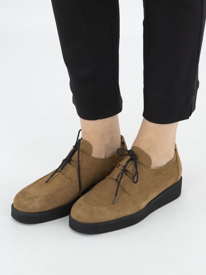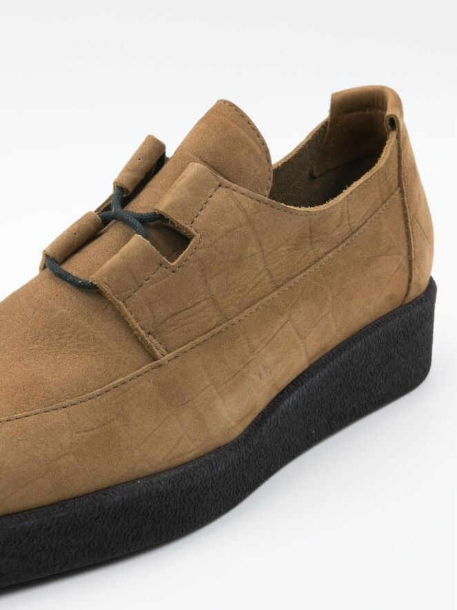 A lace-up shoe from Arche in camel color. The leather features an irregular block pattern. The shoe has four wide lace loops. The platform sole is black. The interior is unlined.