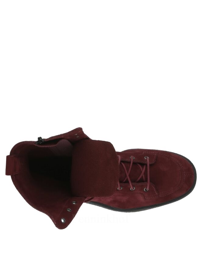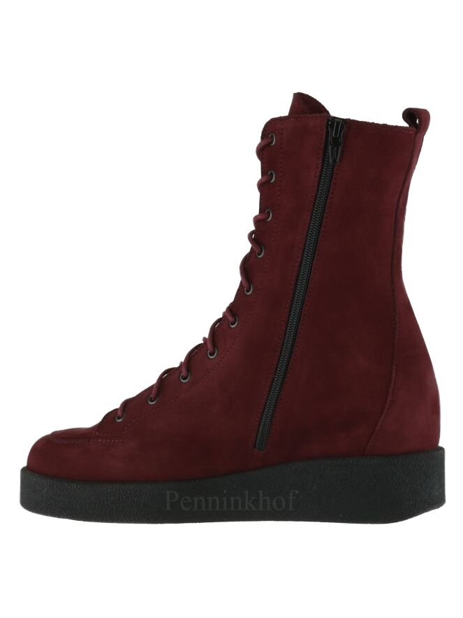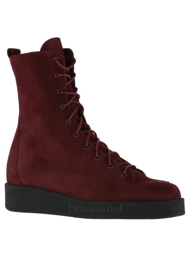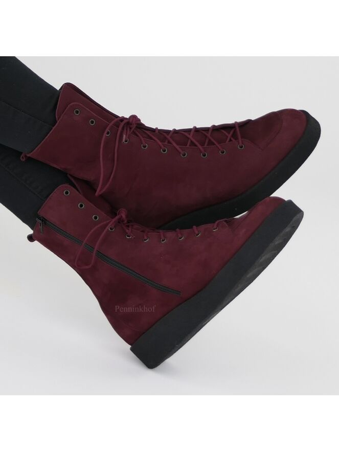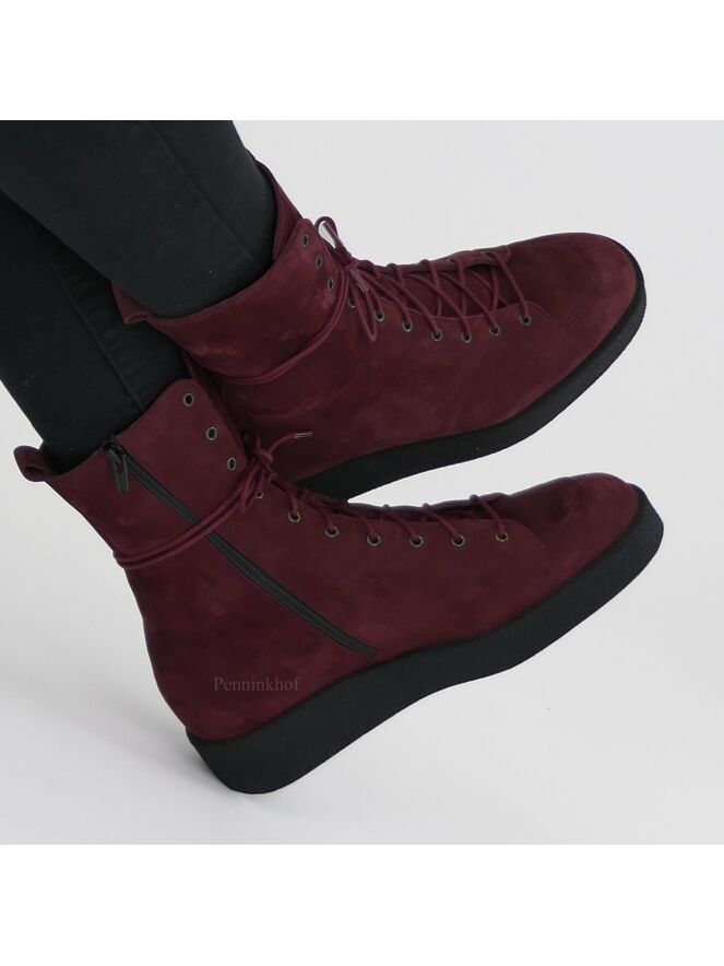 A lace-up boot from Arche in the color burgundy red. On the inside is a cognac colored zipper. The sole is black and the inside is unlined.