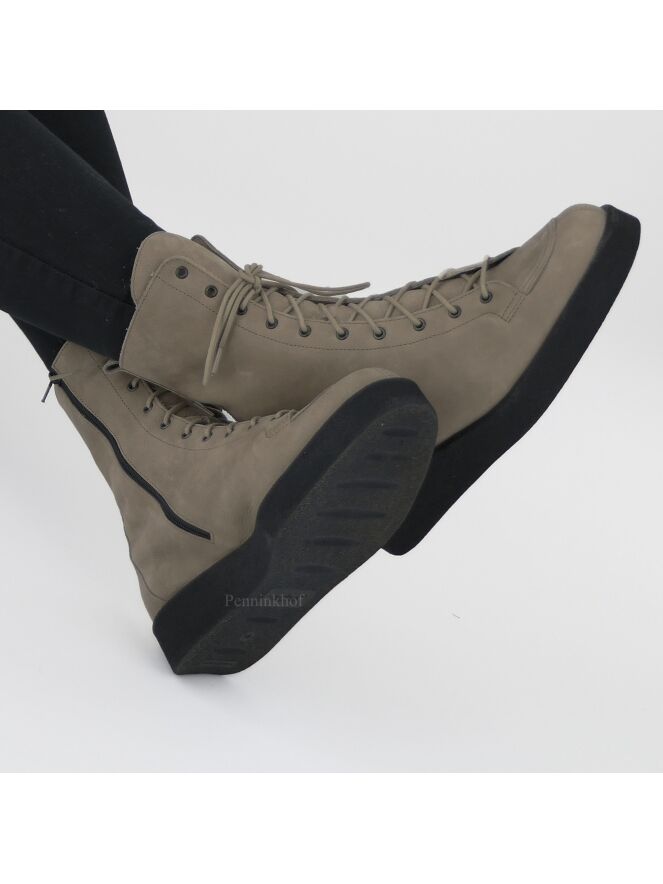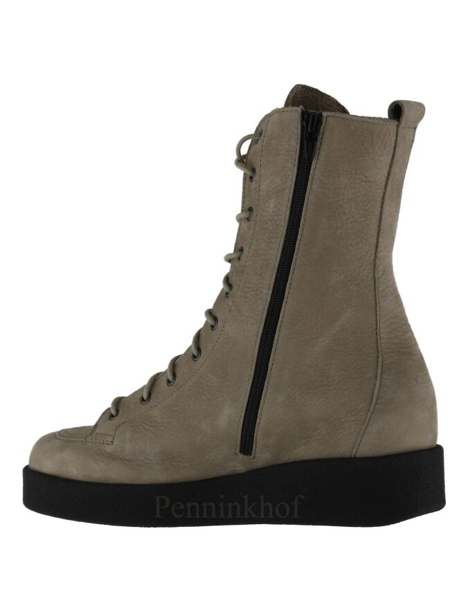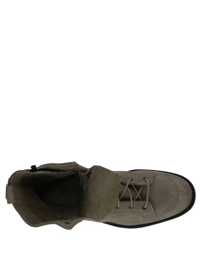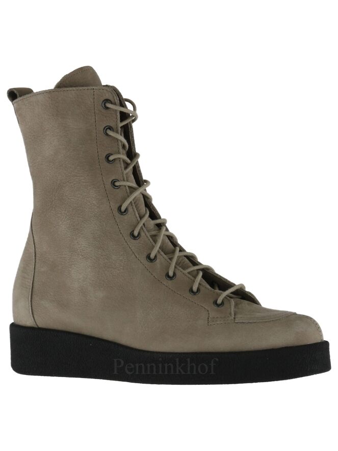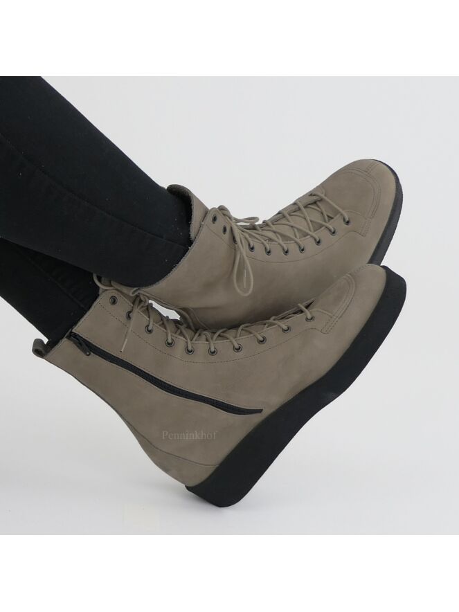 A lace-up boot from Arche in the color taupe. There is a black zipper on the inside. The sole is black and the inside is unlined.
