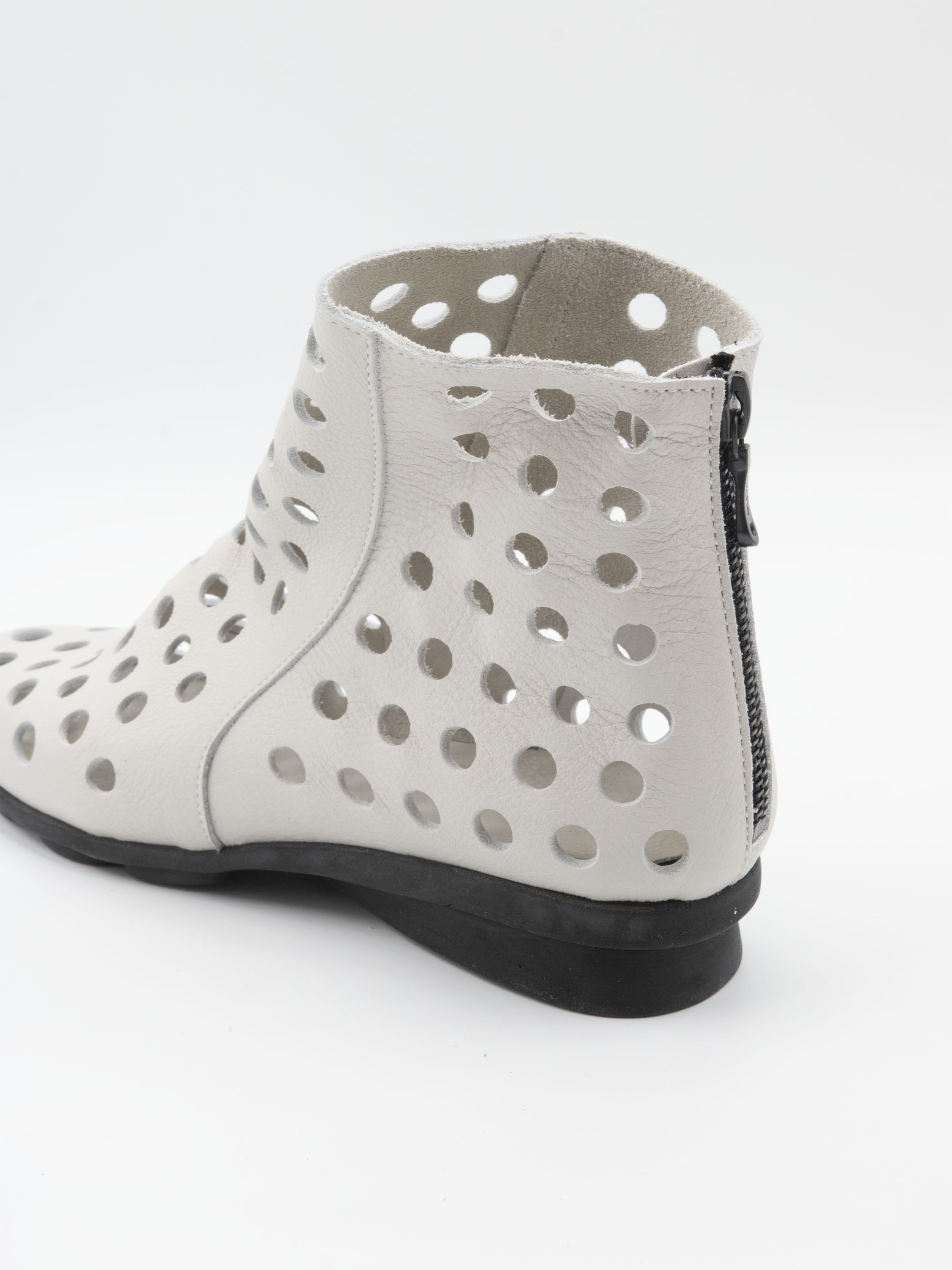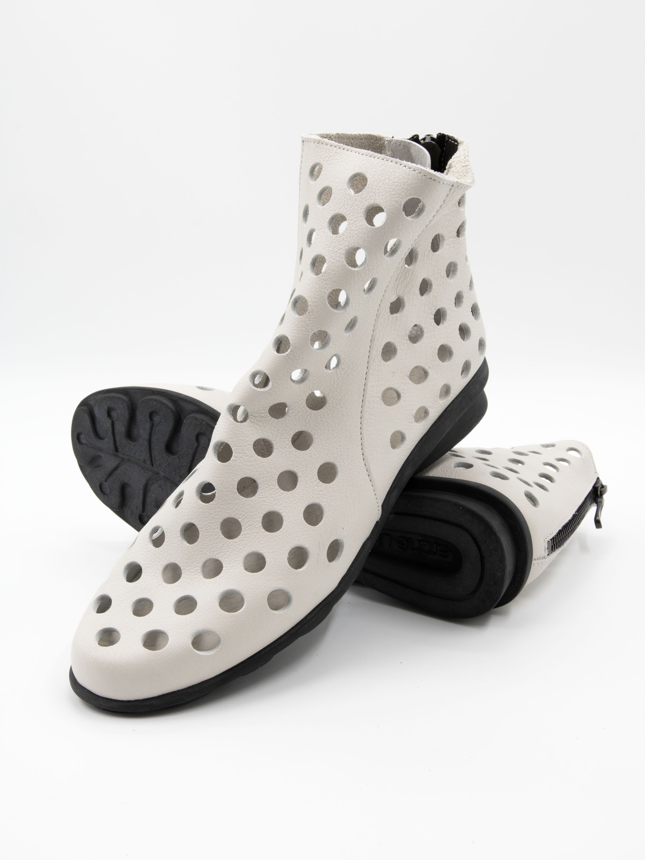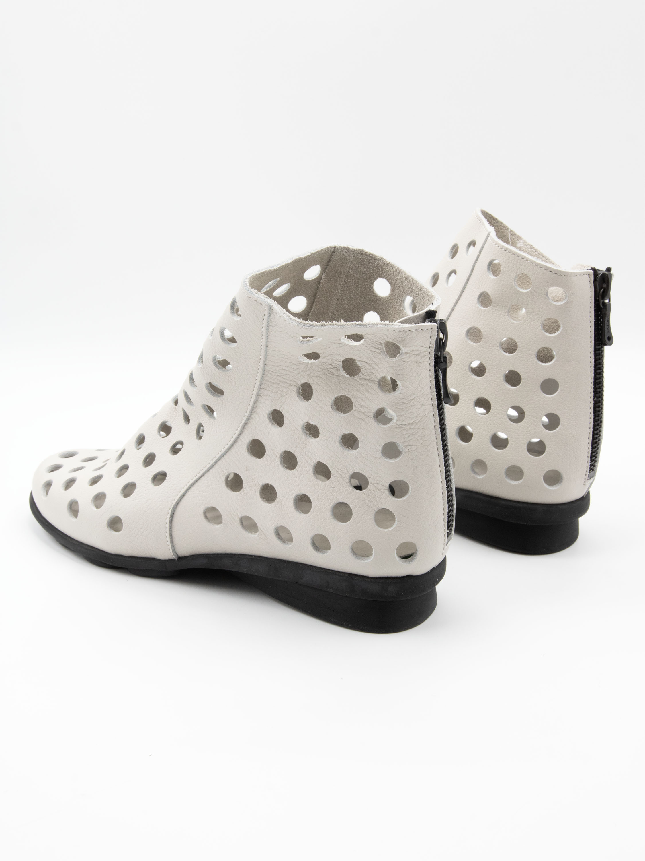 Short perforated slip-on ankle boot by Arche in a chalk white shade. The exceptionally supple leather ensures a soft and comfortable fit. A discreet zip at the back allows for easy on and off. The black latex sole provides lightweight flexibility, while the unlined interior offers a natural and breathable feel.