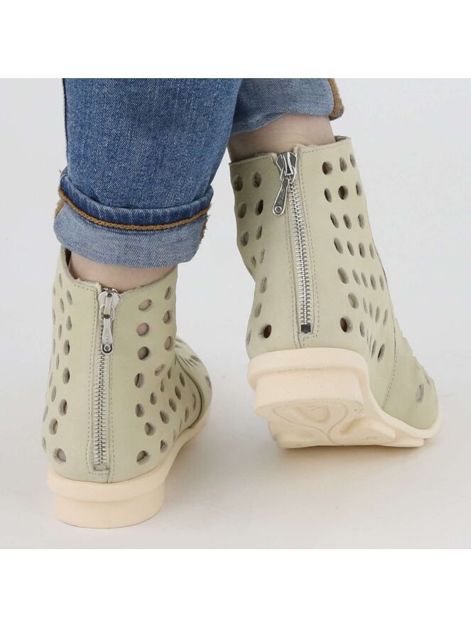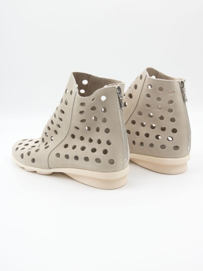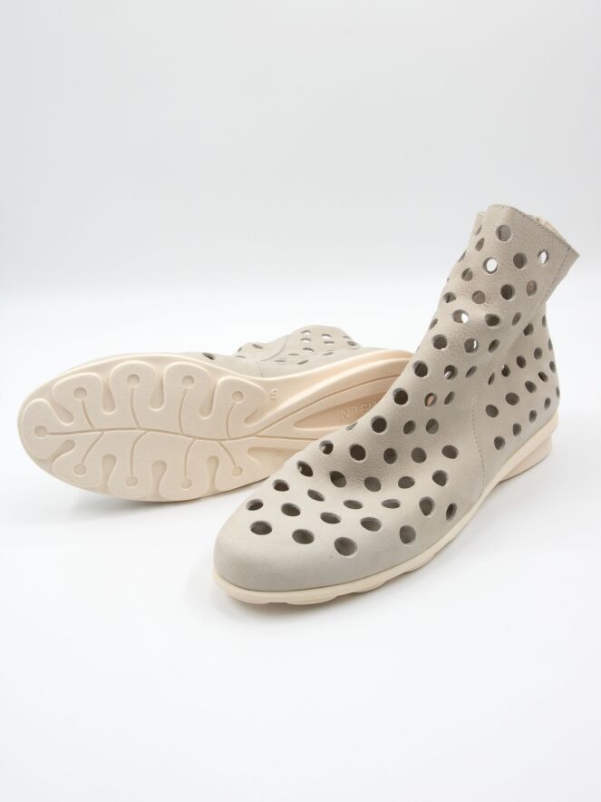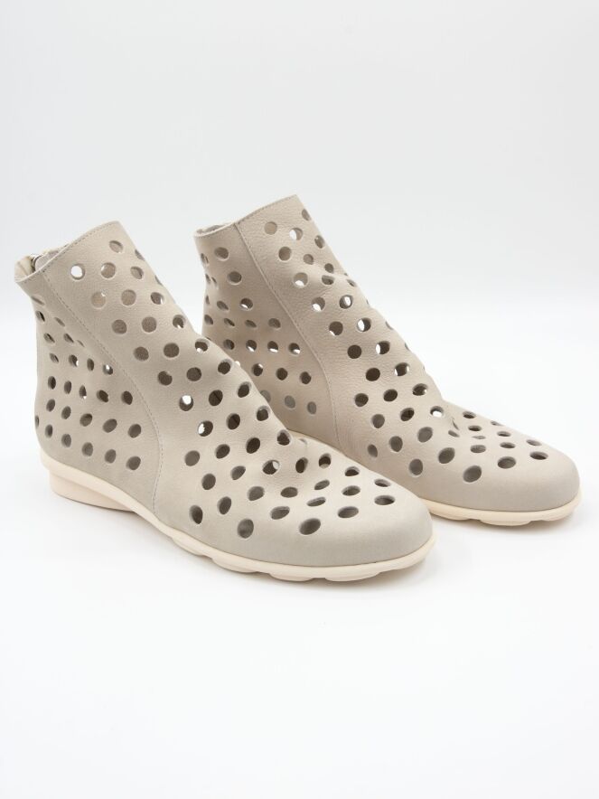 A short perforated slip-on boot from Arche in a creamy white color. The leather is very supple and there is a zipper at the back of the boot. The sole is made of latex in a white color and the inside is unlined.