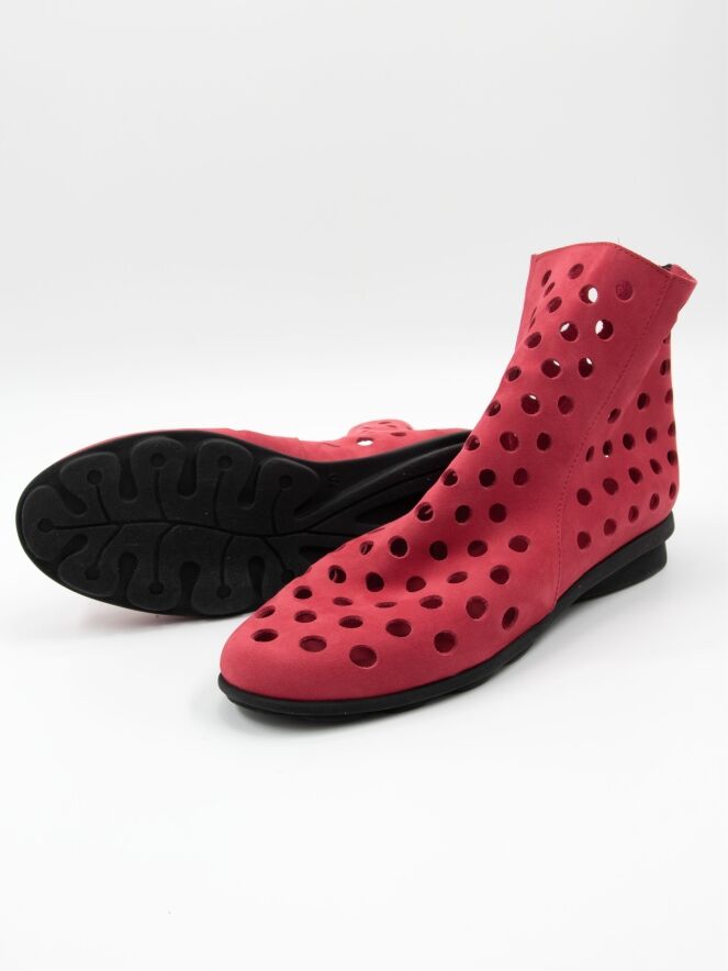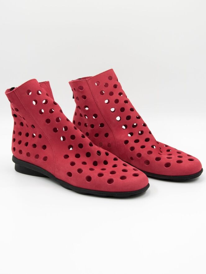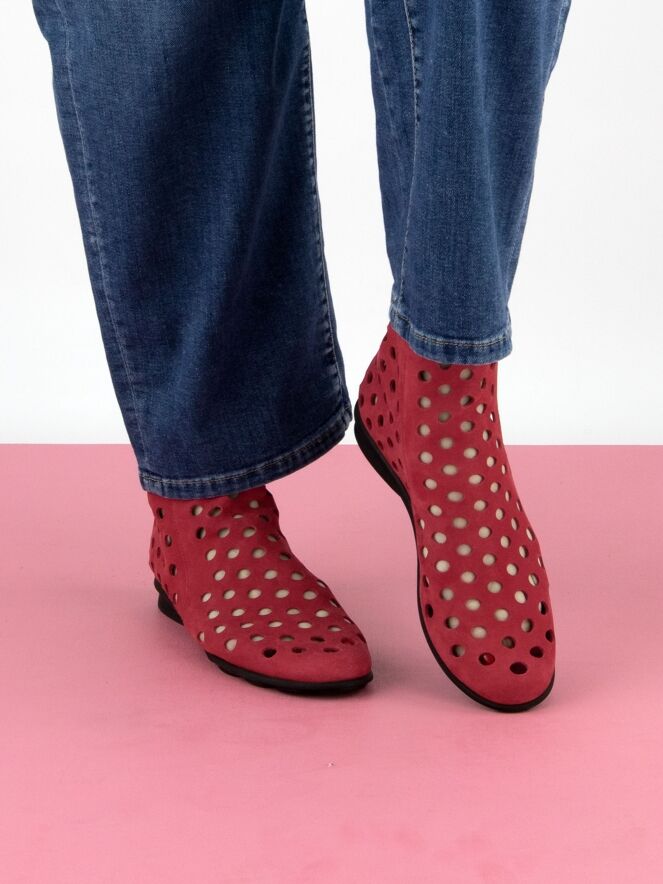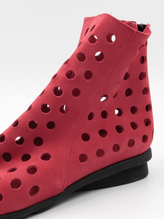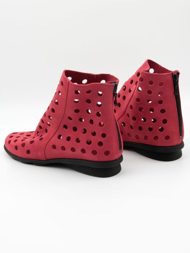 A short perforated slip-on boot by Arche in raspberry red. The leather is exceptionally supple, and a zipper is placed at the back of the boot. The sole is made of black latex, and the interior is unlined.