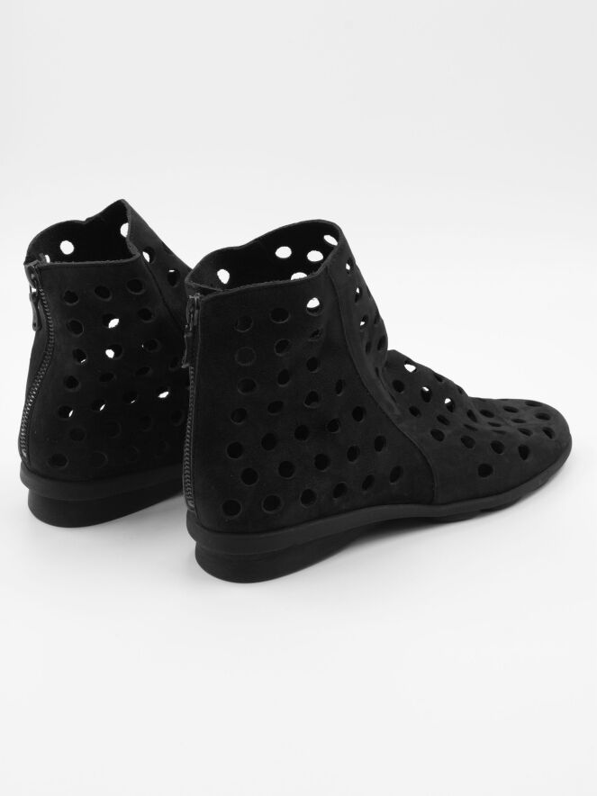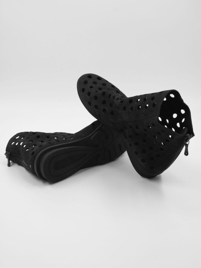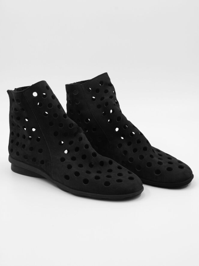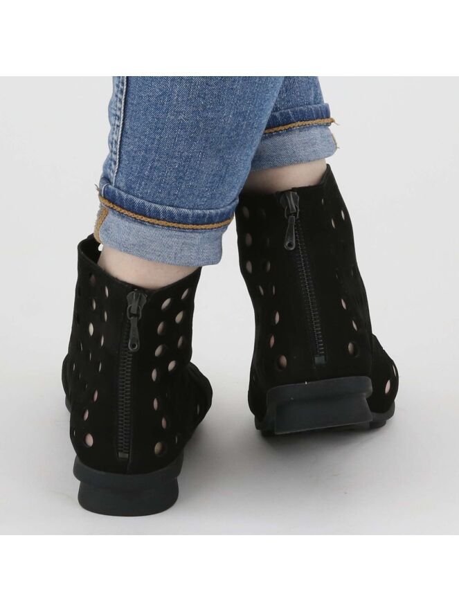 A short perforated slip-on boot from Arche in a black color. The nubuck suede is very supple and there is a zipper at the back of the boot. The sole is made of latex in a black color and the inside is unlined.