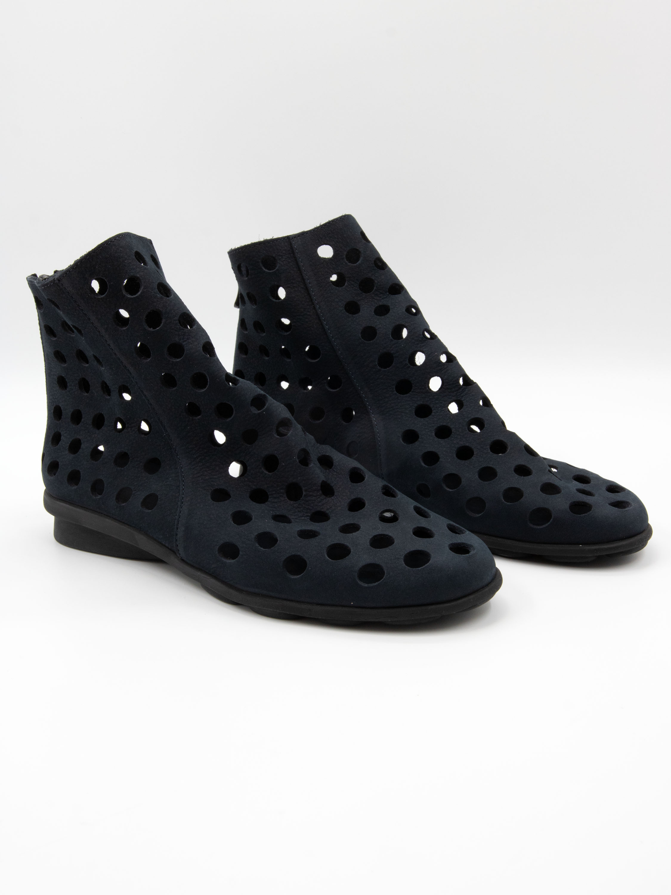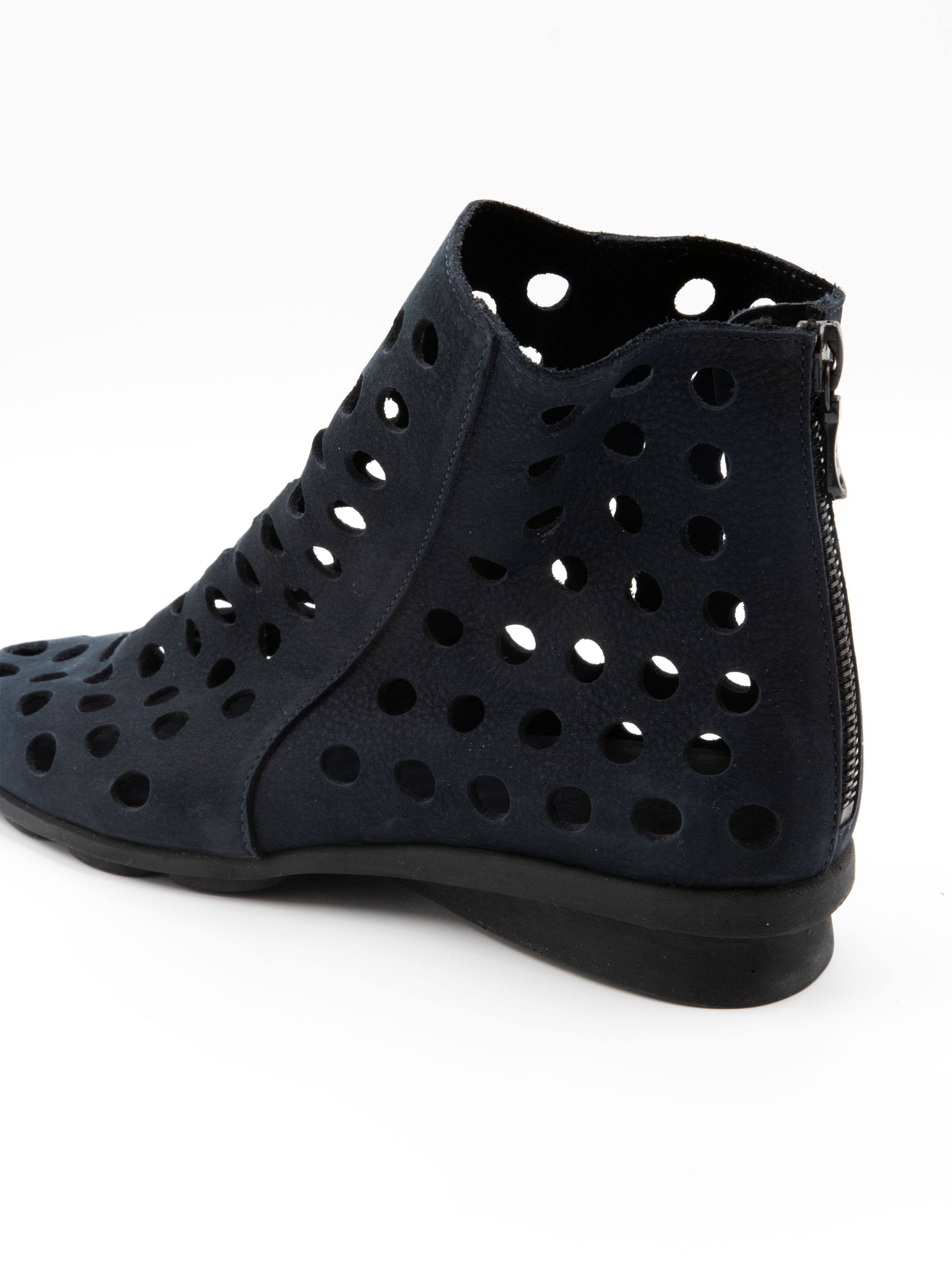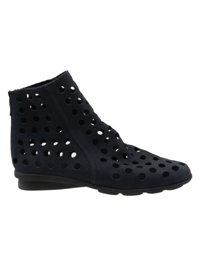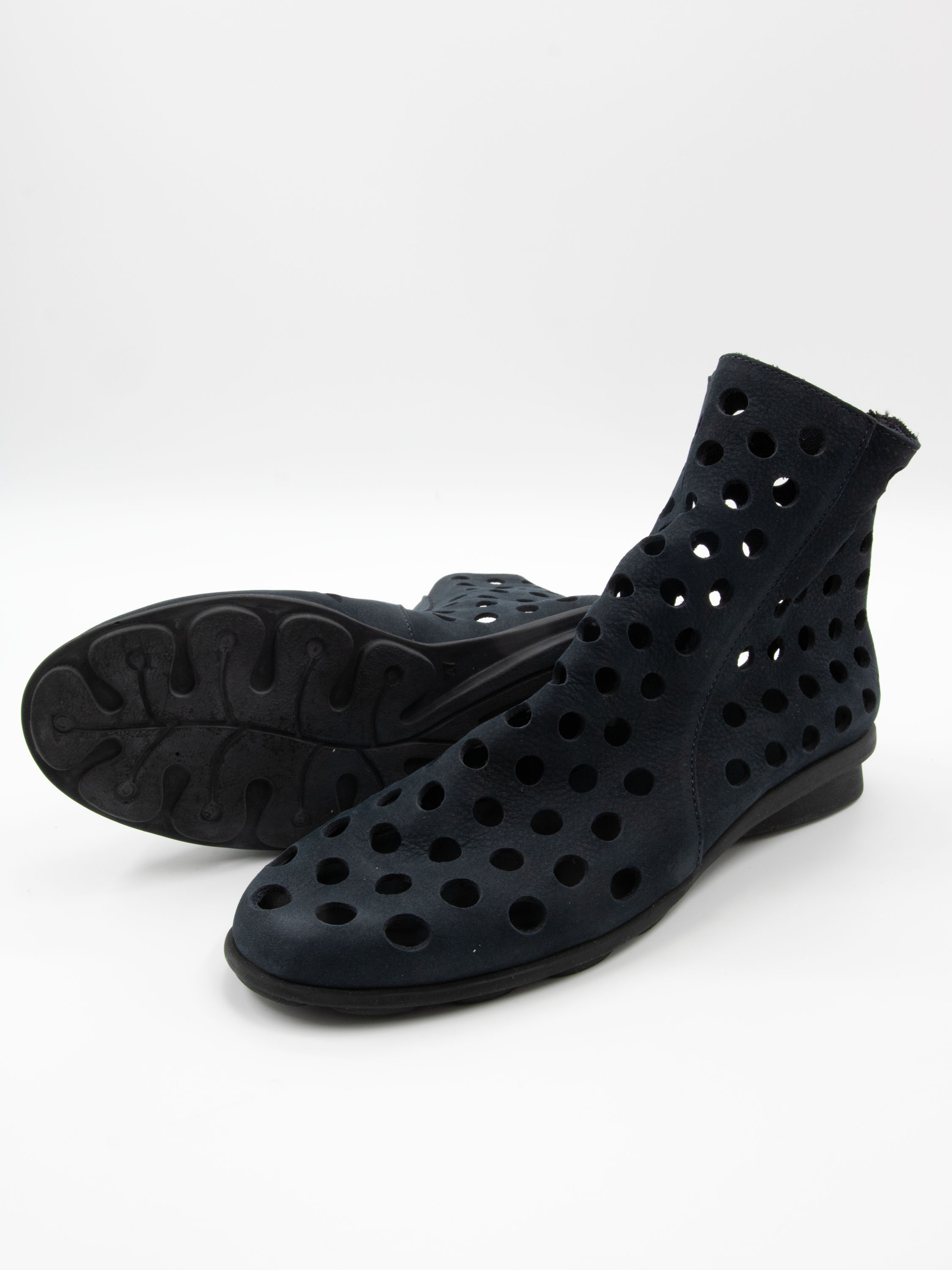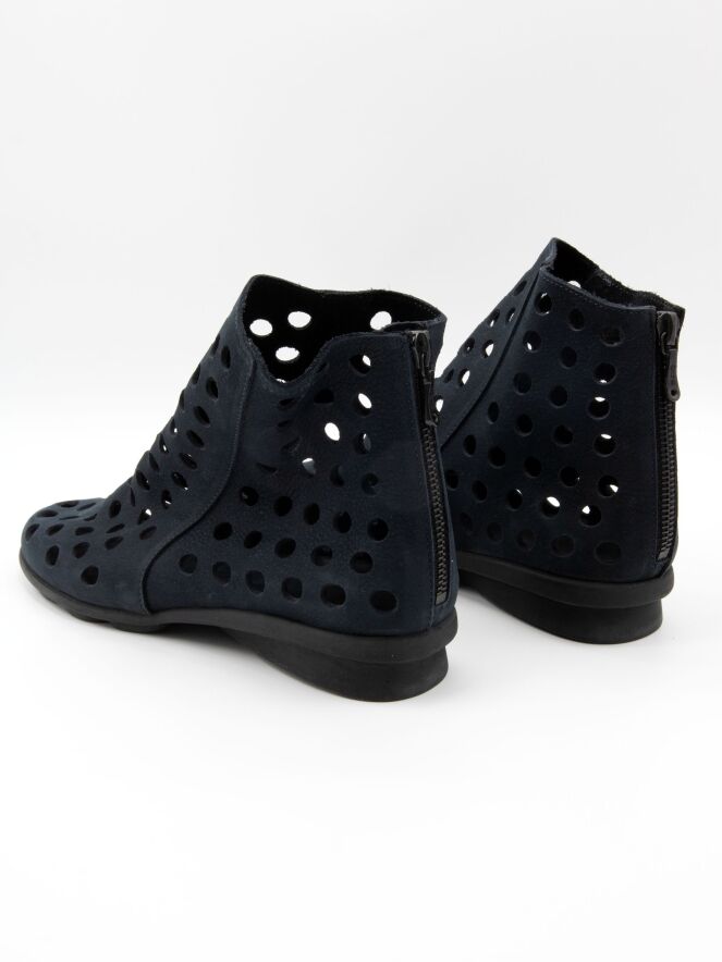 Short perforated slip-on ankle boot by Arche in an elegant navy blue shade. The exceptionally supple leather ensures outstanding comfort. A small zip at the back allows for easy entry. The black latex sole provides flexibility and cushioning, while the interior remains unlined for a light and natural fit.