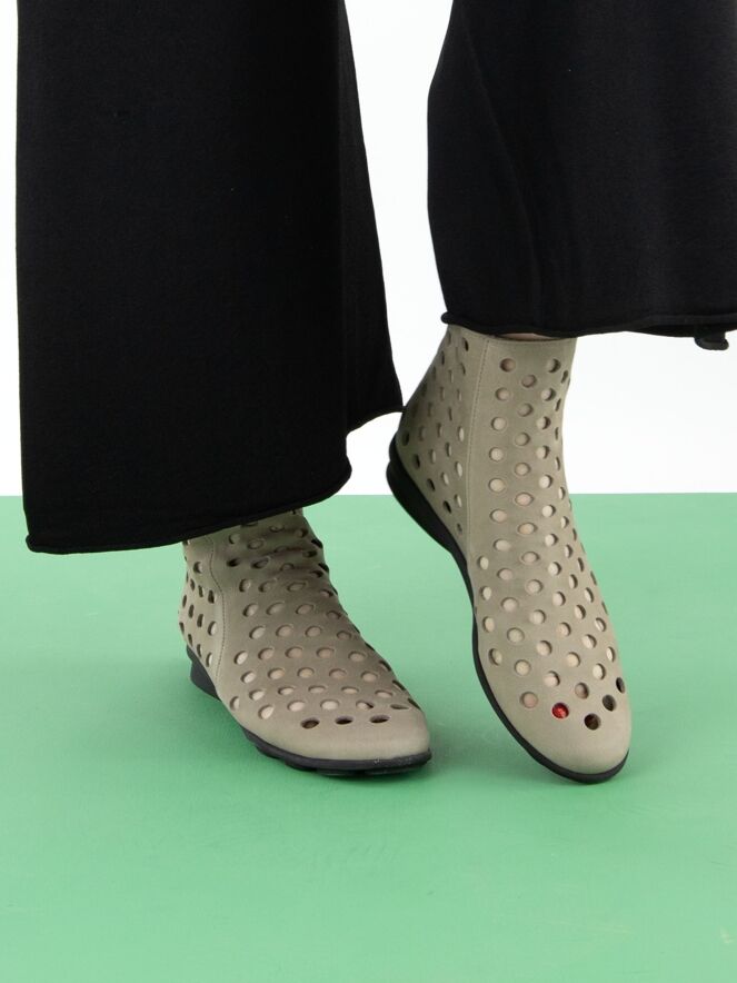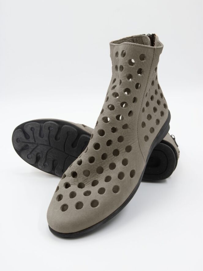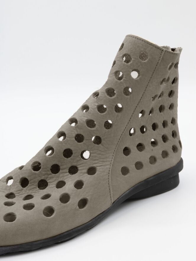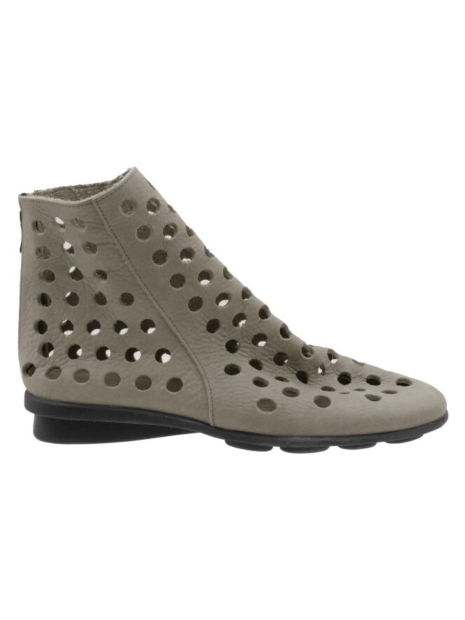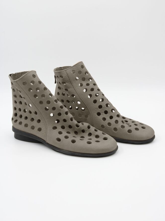 A short perforated slip-on boot by Arche in grey. The leather is exceptionally supple, and a zipper is placed at the back of the boot. The sole is made of black latex, and the interior is unlined for added flexibility and comfort.