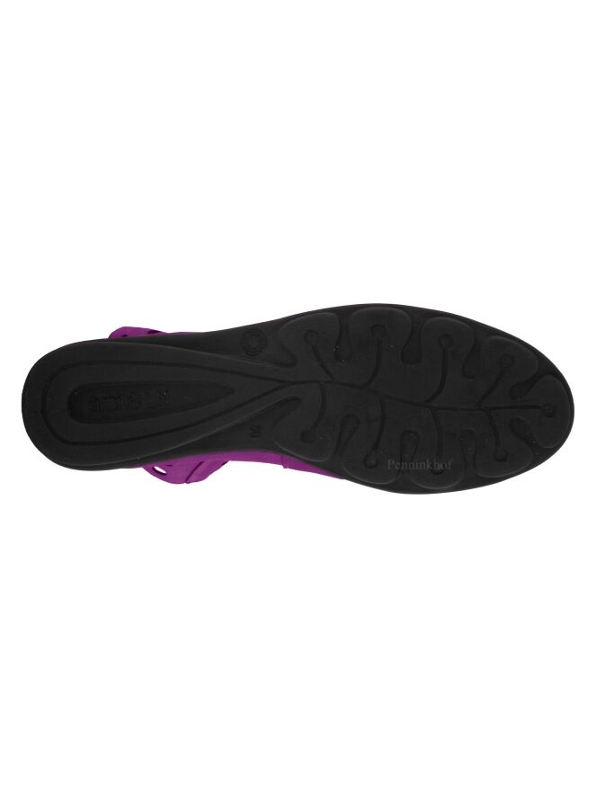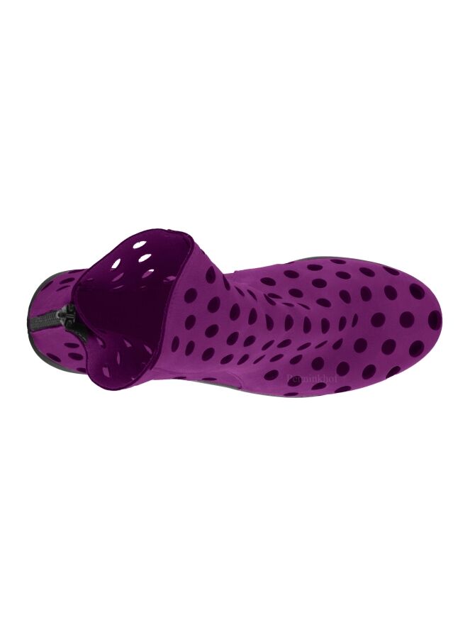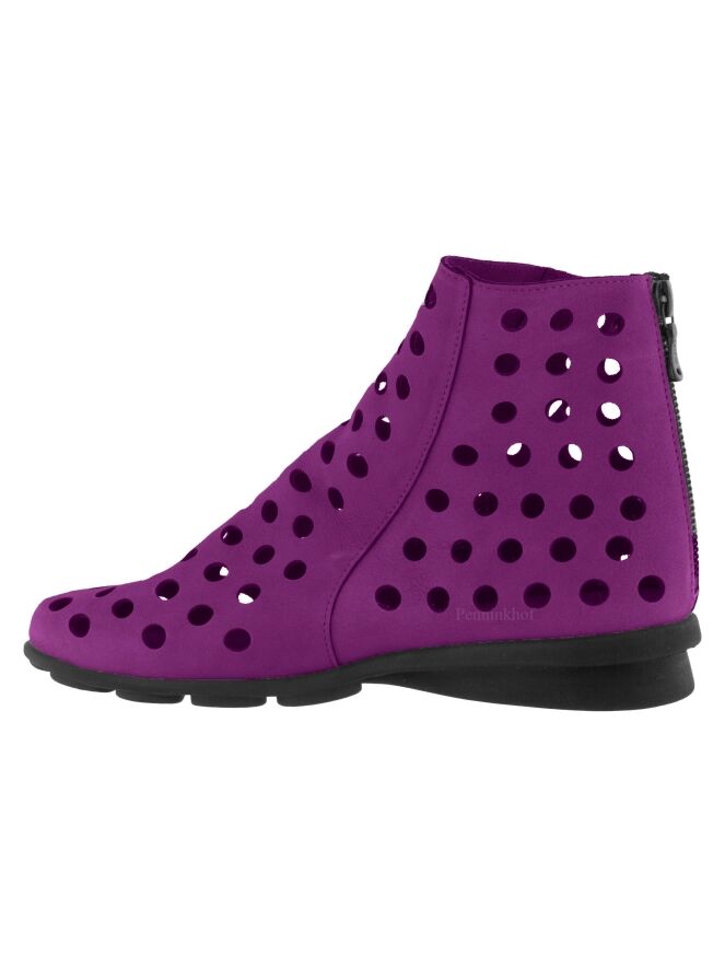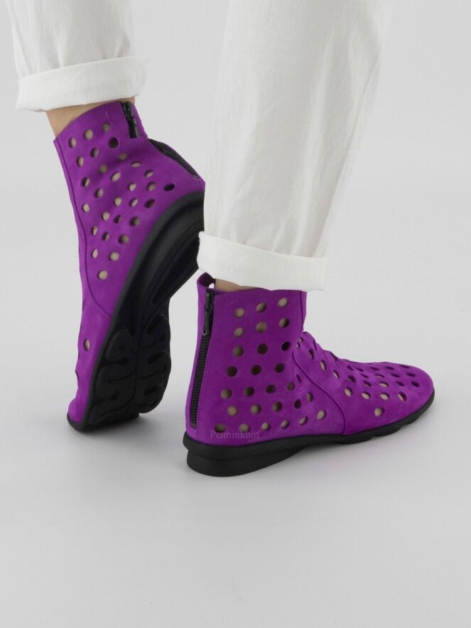 A short perforated slip-on boot from Arche in a purple color. The suede is very supple and there is a zipper at the back of the boot. The sole is made of latex in a black color and the inside is not lined.