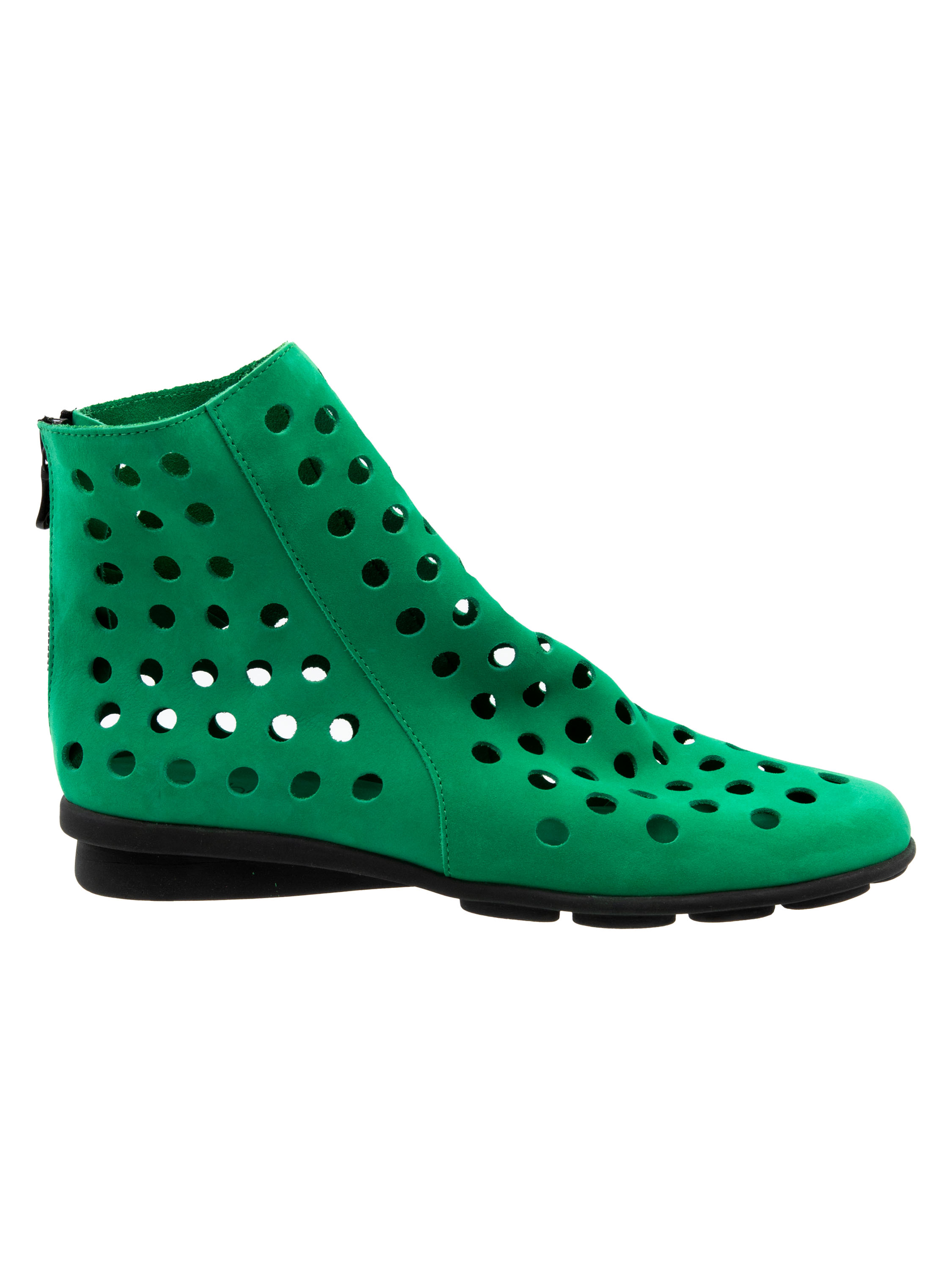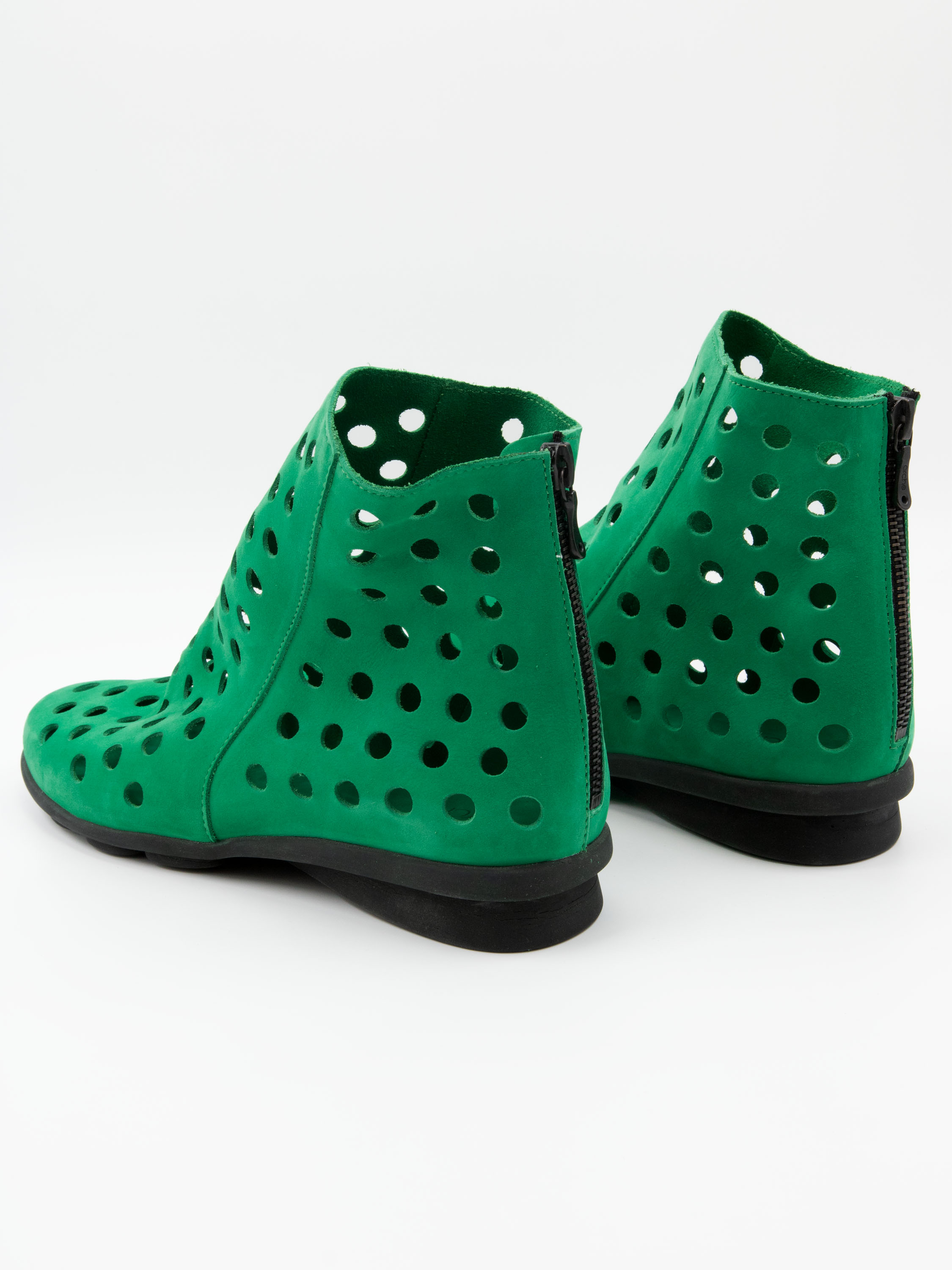 A short perforated slip-on boot by Arche in emerald green. The nubuck suede is exceptionally supple, and a zipper is placed at the back of the boot. The sole is made of black latex, and the interior is unlined for added flexibility and comfort.