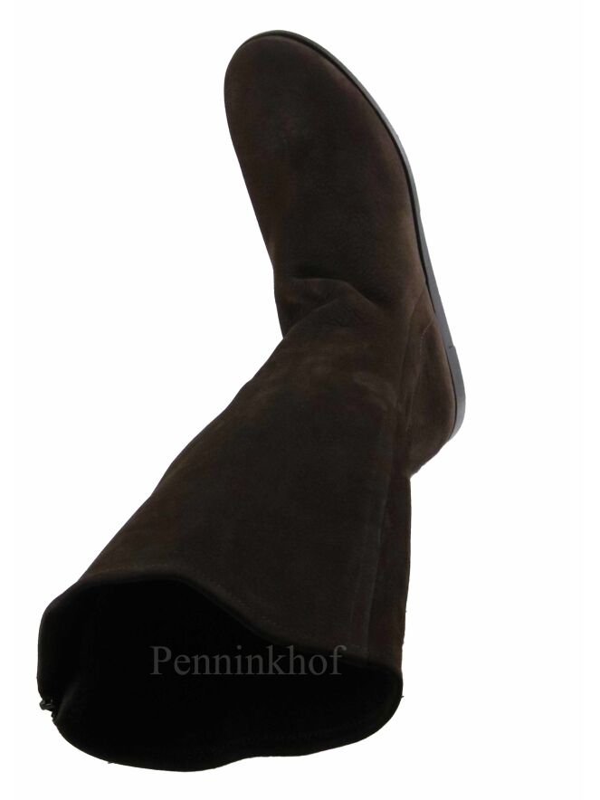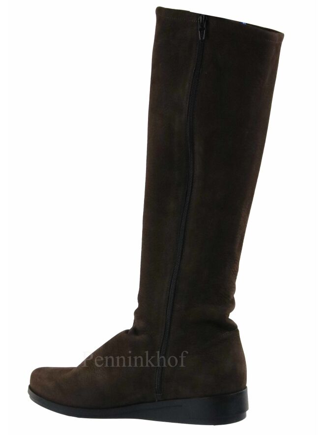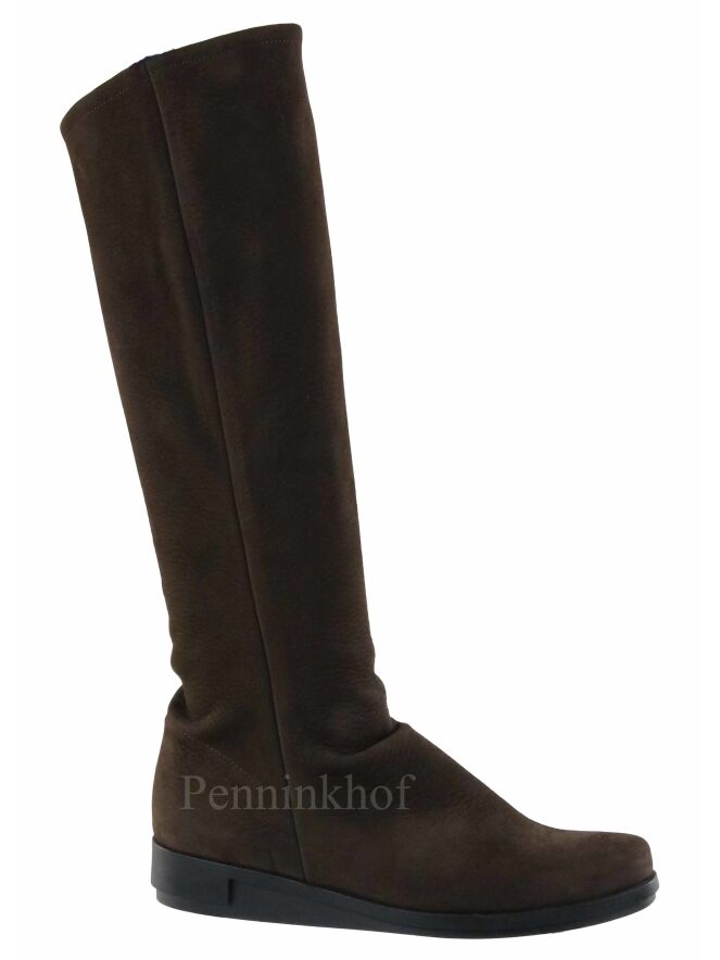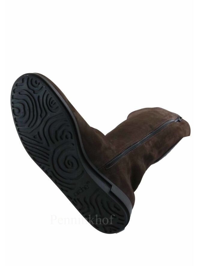 An Arche boot in the color mocha brown. The black sole is slightly raised. On the inside is a black zipper. The boot has a round toe and the inside is unlined.