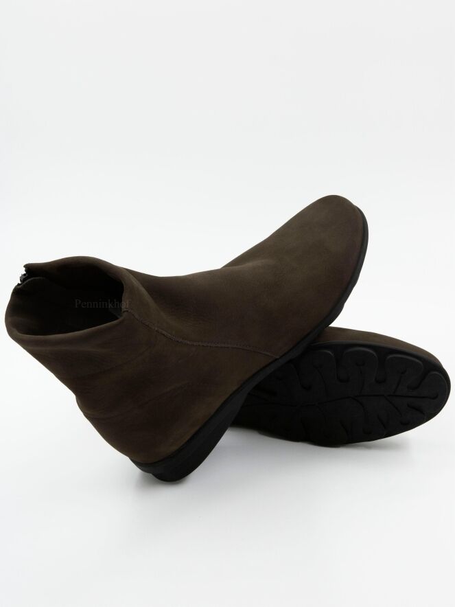 A short boot in the colour mocha brown. The boot has a round toe and a zip on the inside of the shaft. The latex sole is slightly raised at the heel. The inside is unlined.