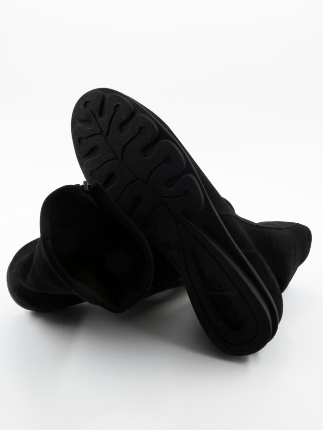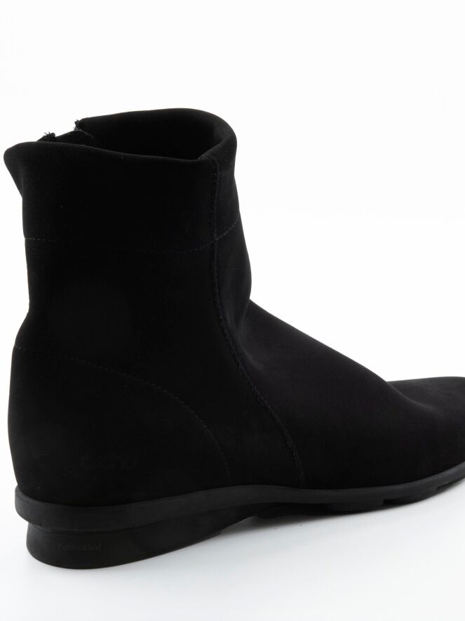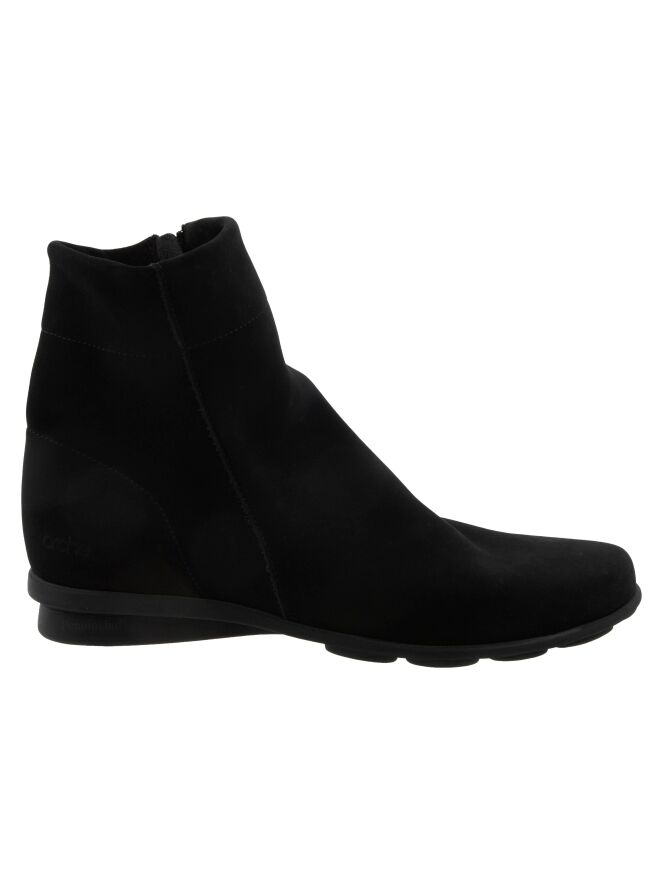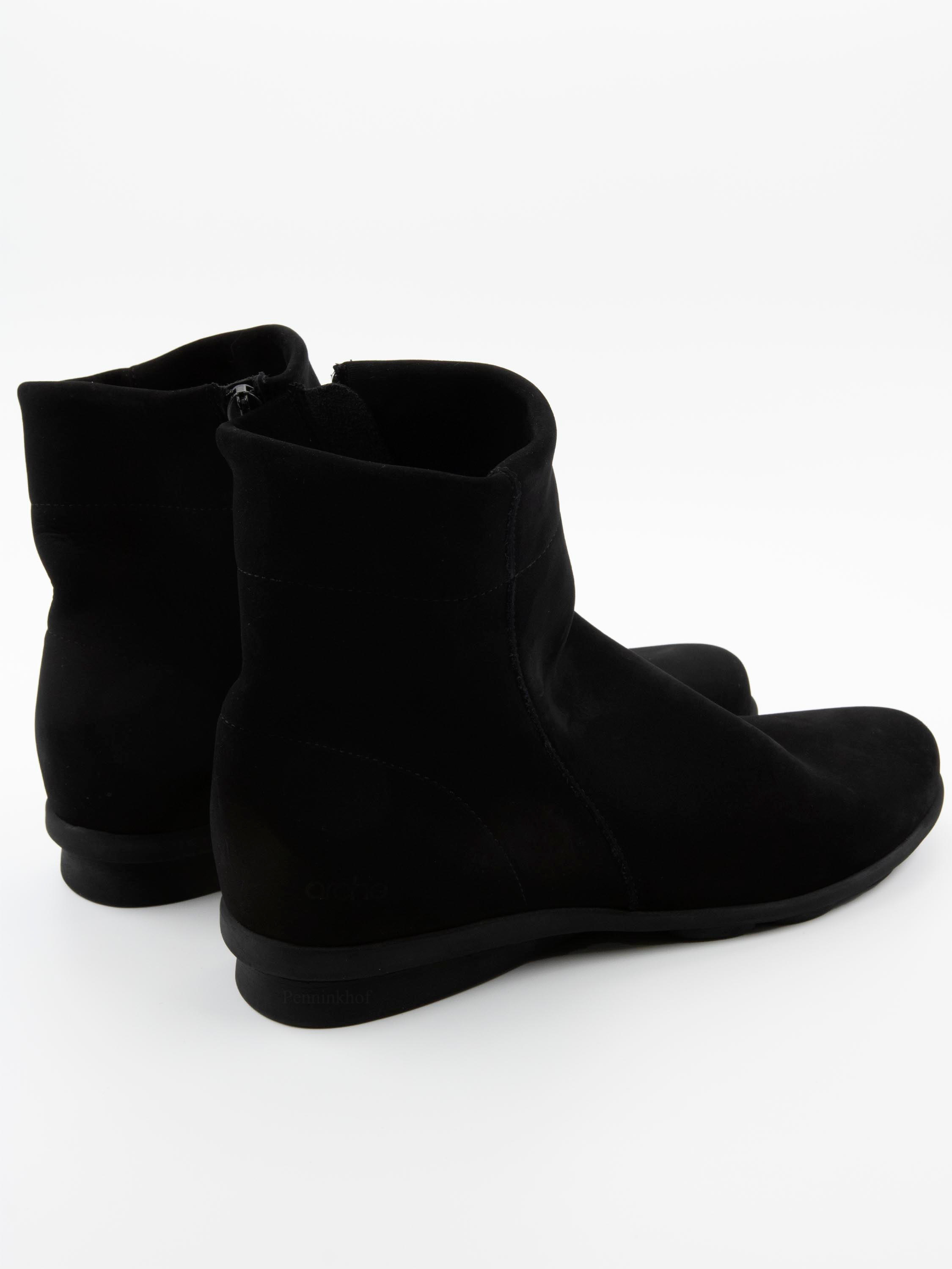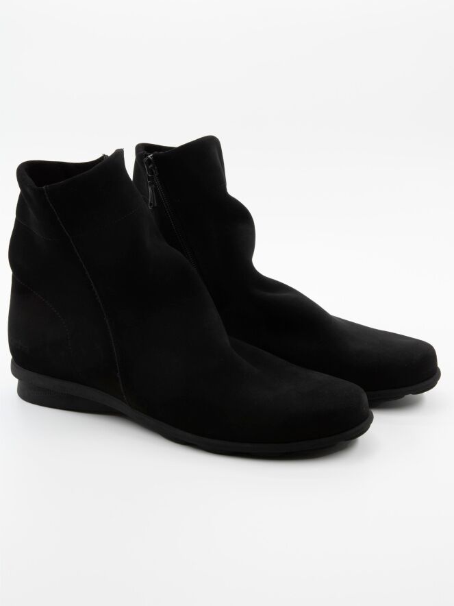 A short bootie in the colour black. The boot has a round toe and a zip on the inside of the shaft. The latex sole is slightly raised at the heel. The inside is unlined.