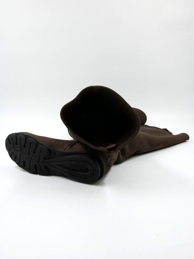 A boot by Arche in mocha brown. On the inside of the shaft runs a black zipper along its entire length. The inside of the shaft is unlined.