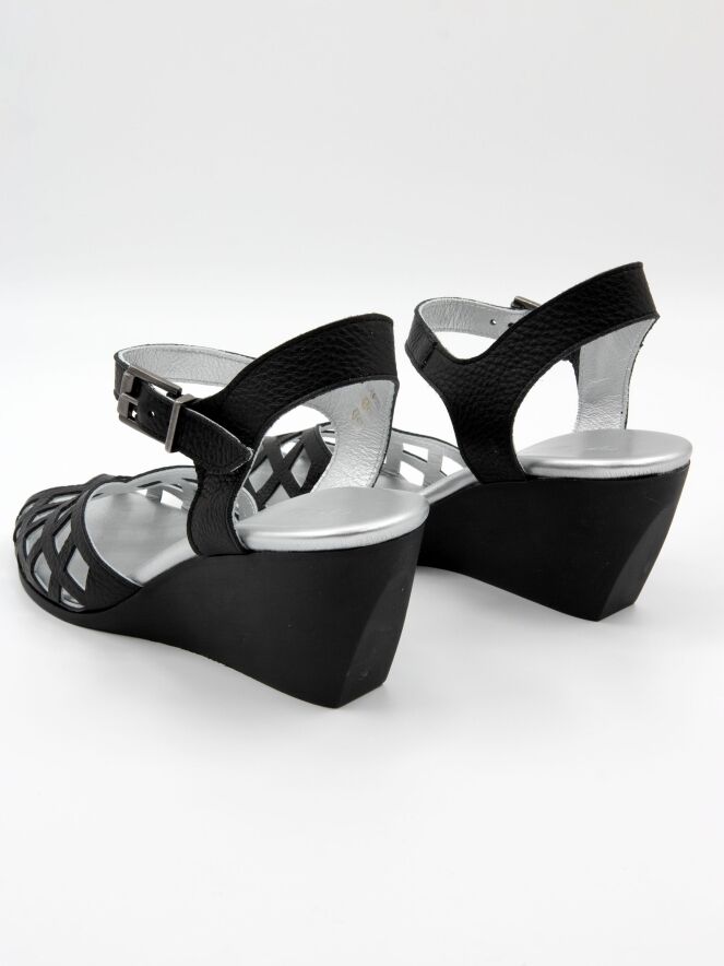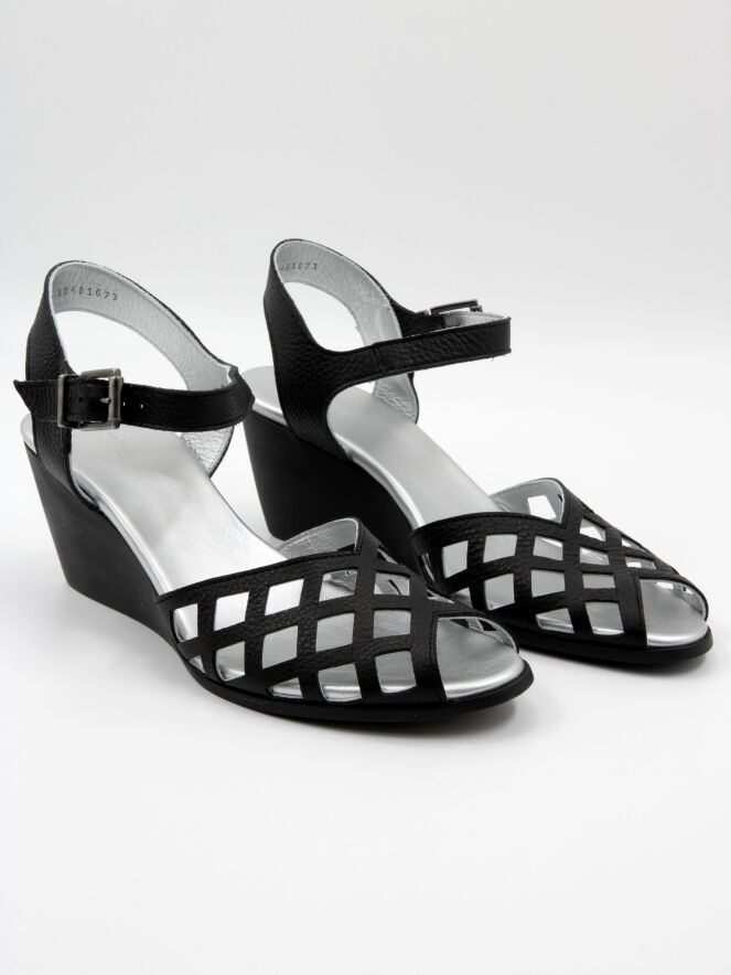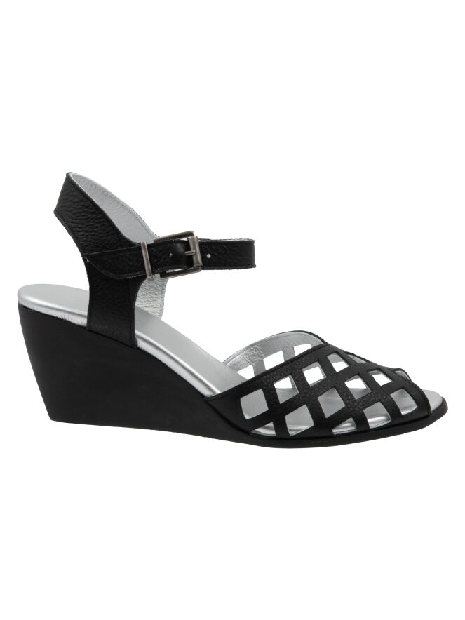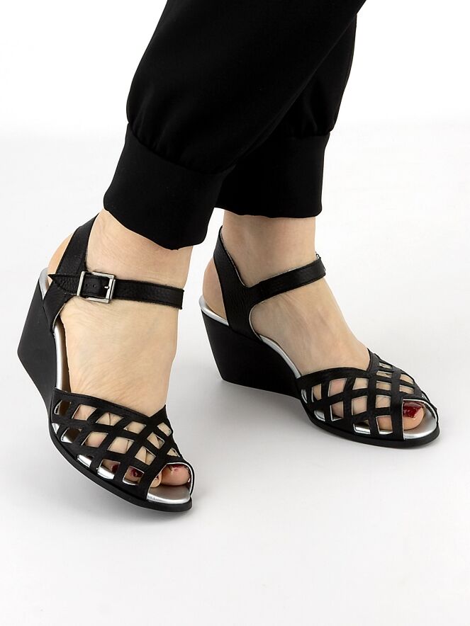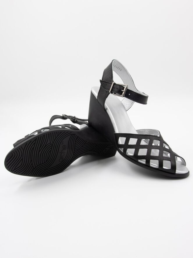 An open-toe pump by Arche in black color with open leather over the forefoot cut in a diamond pattern. The footbed is in a silver color. The pump features an open toe and a wedge heel in black color. The ankle strap is adjustable.