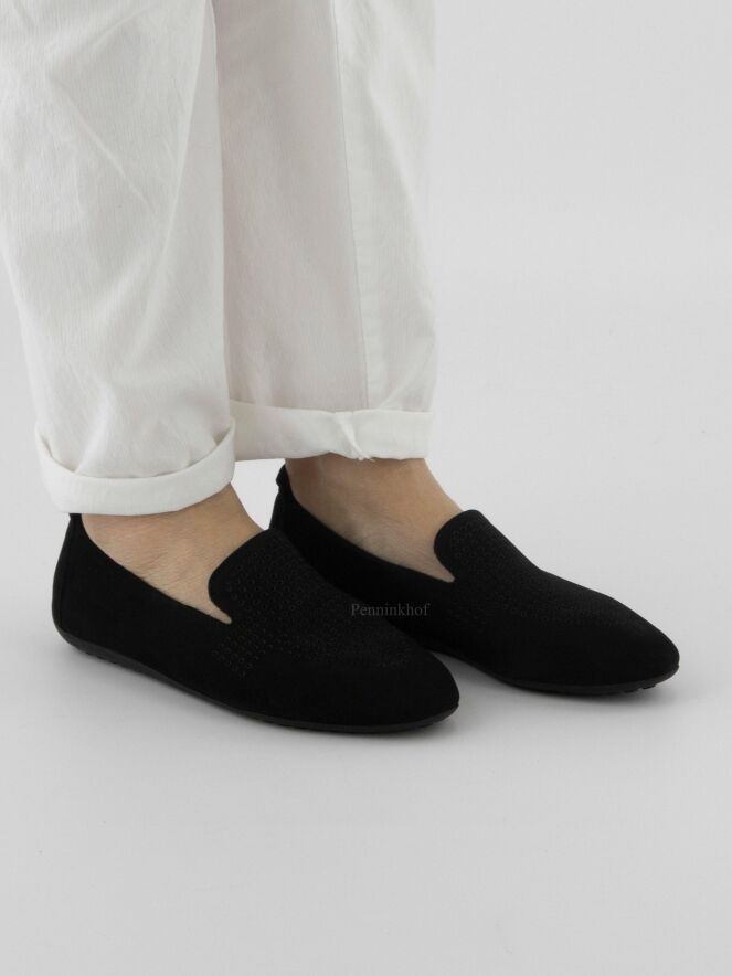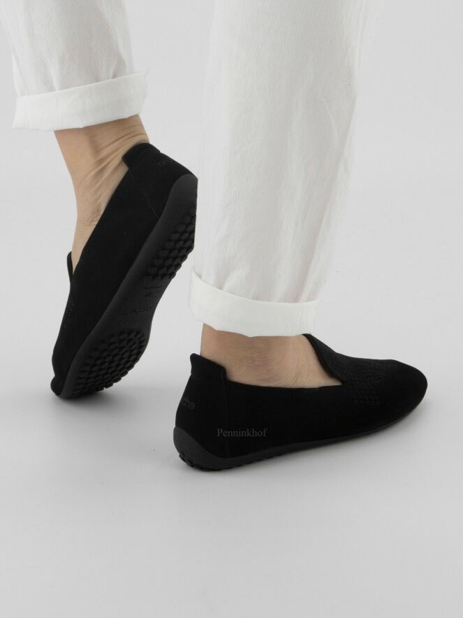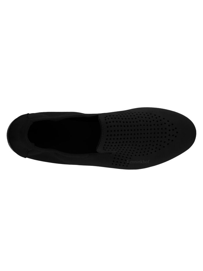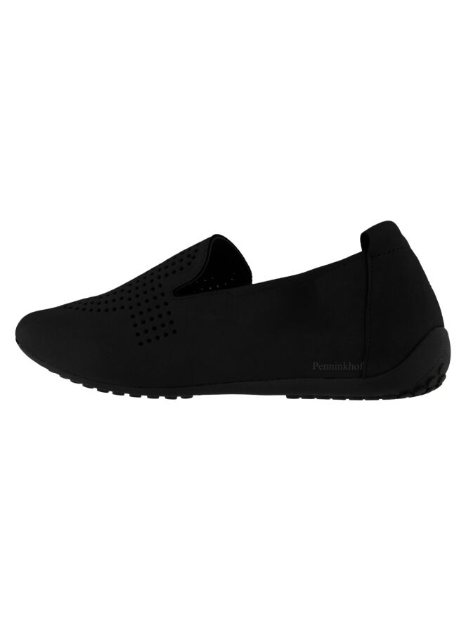 A slip-on shoe by Arche in black. The leather on the forefoot is finely perforated. The sole is also black. The interior is unlined, providing extra flexibility and comfort.