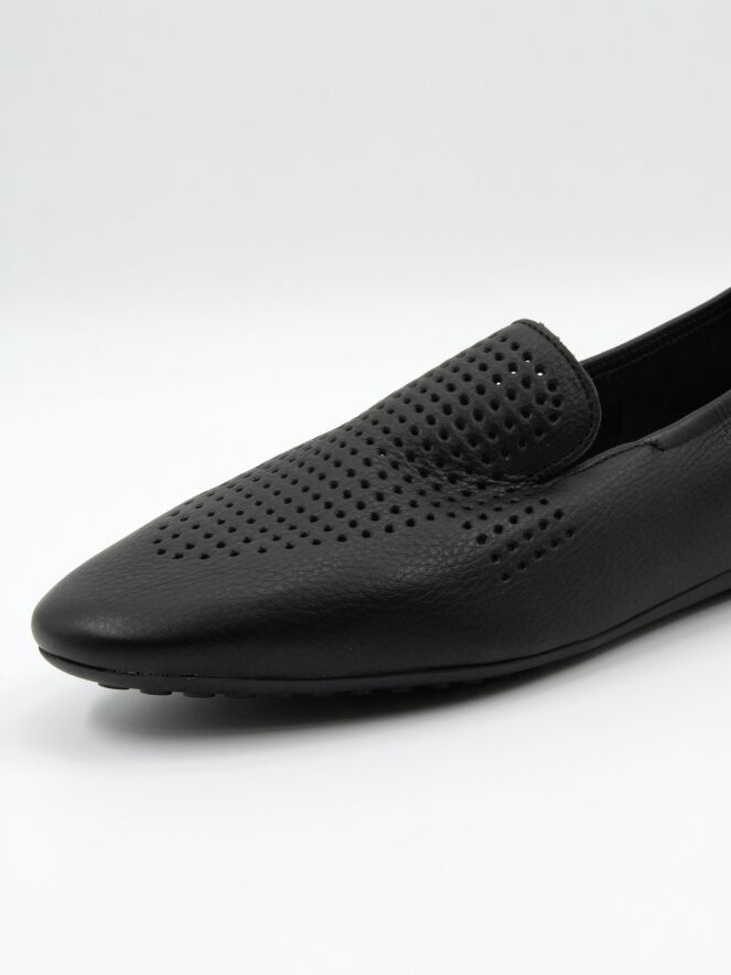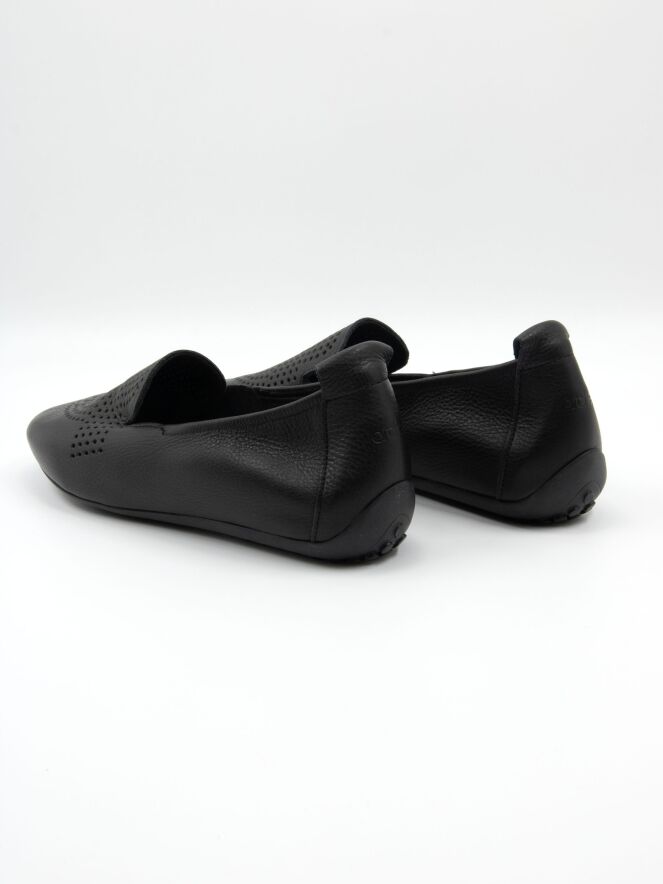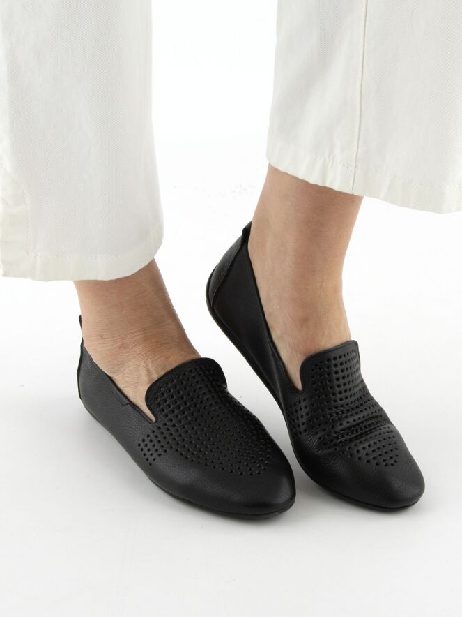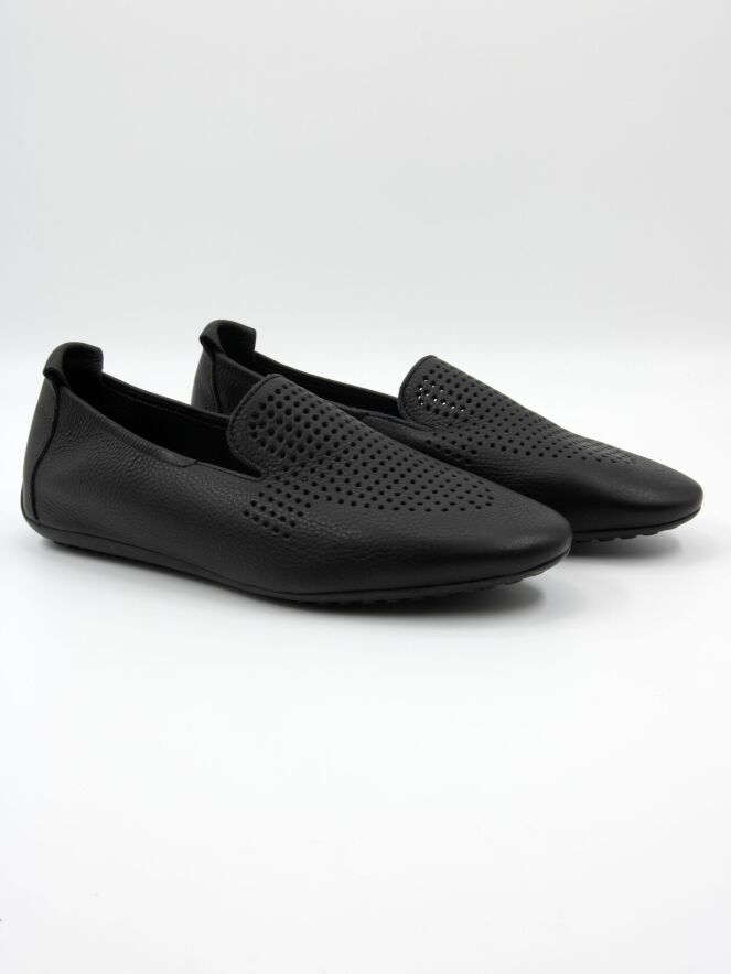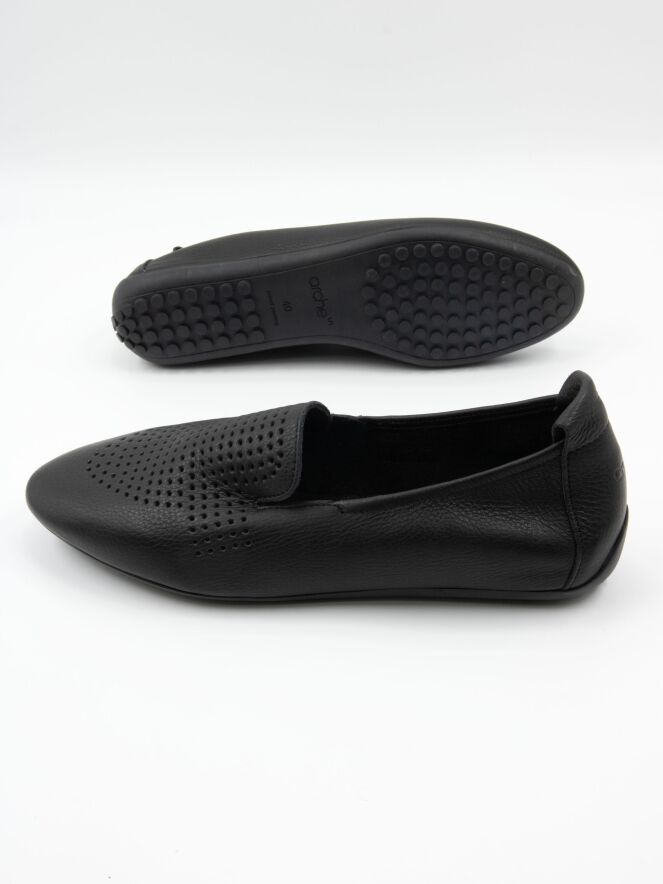 A slip-on shoe by Arche in black. The leather on the forefoot is finely perforated. The sole is finished in black. The interior is unlined, providing extra flexibility and comfort.