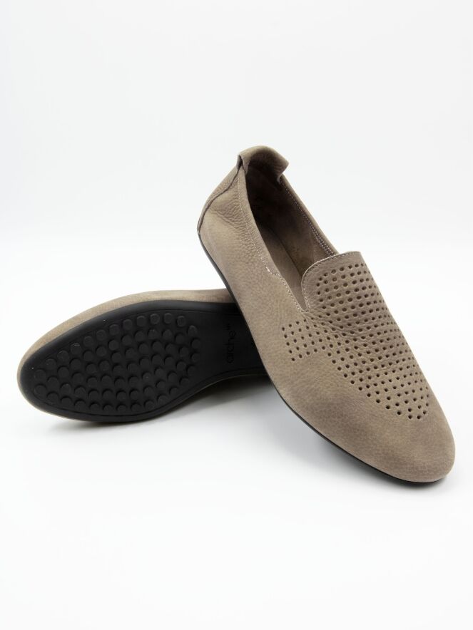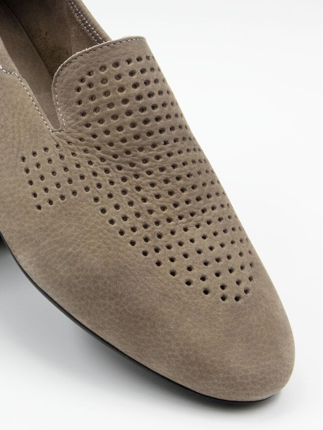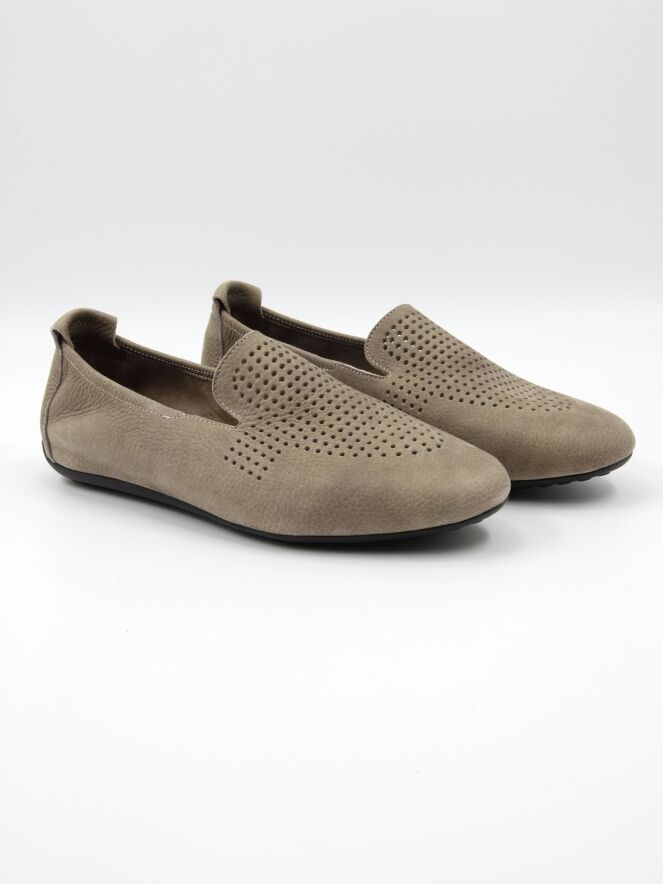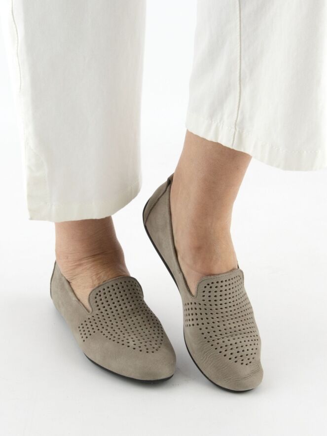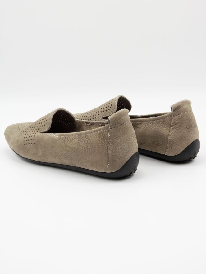 A slip-on by Arche in grey. The leather on the forefoot is finely perforated. The sole is black. The interior is unlined for added flexibility.