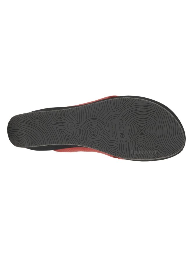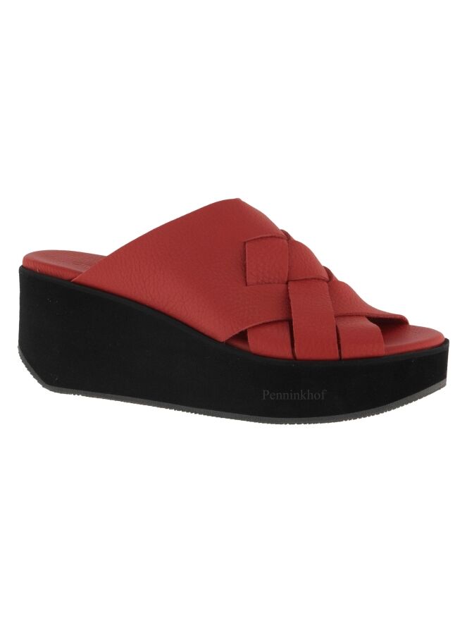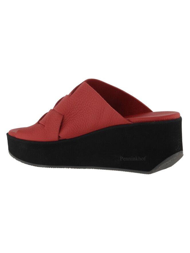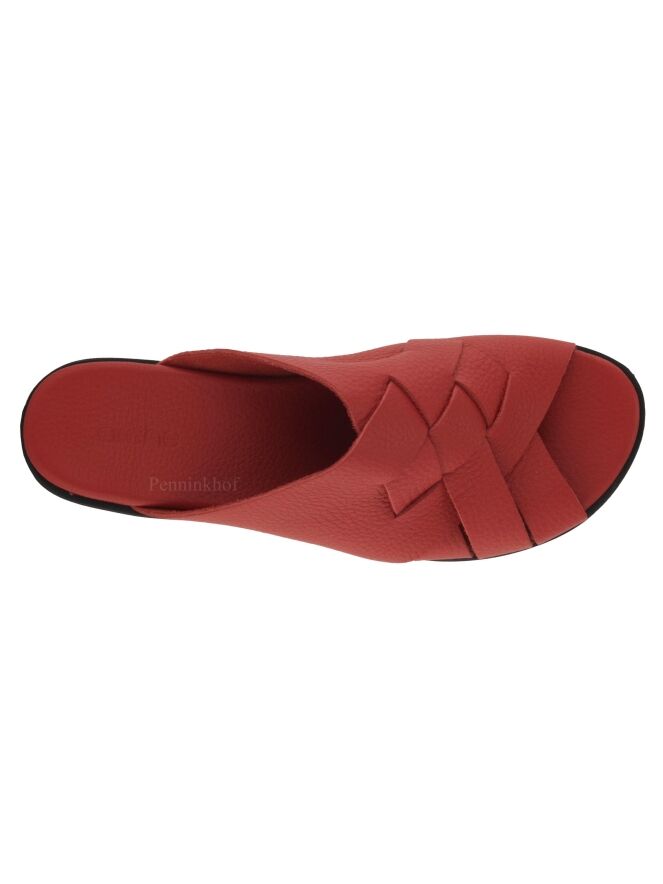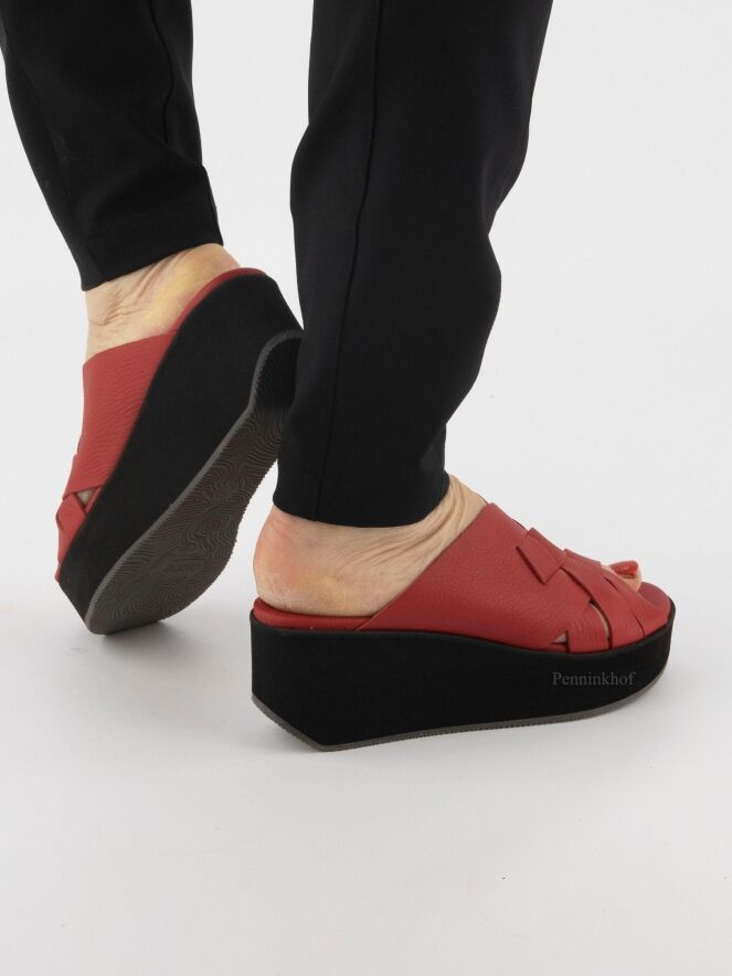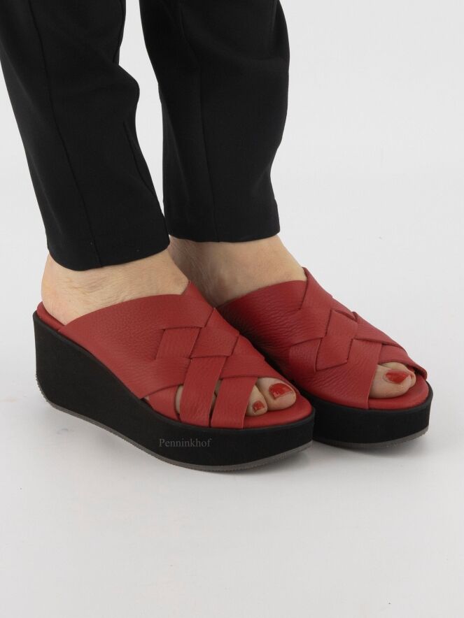 A platform slipper from Arche in the color red. The leather on the forefoot is braided. The footbed is in the same material and color as the leather over the forefoot.