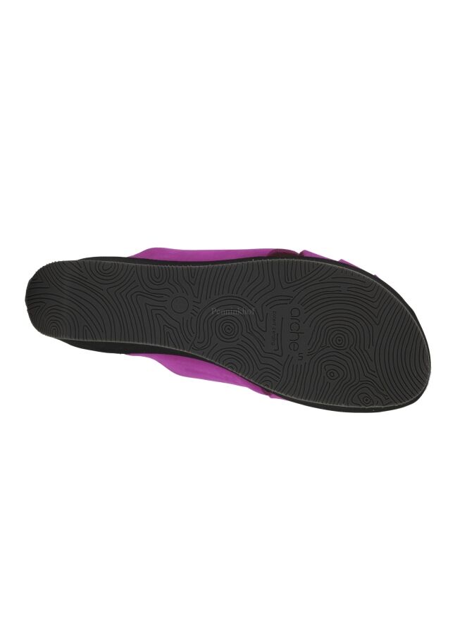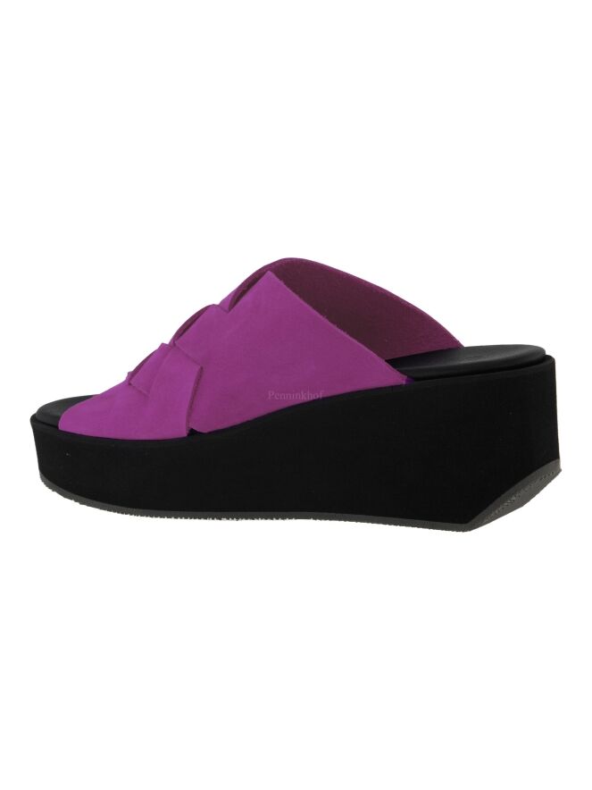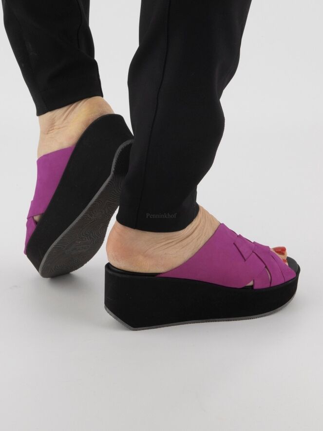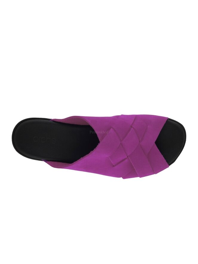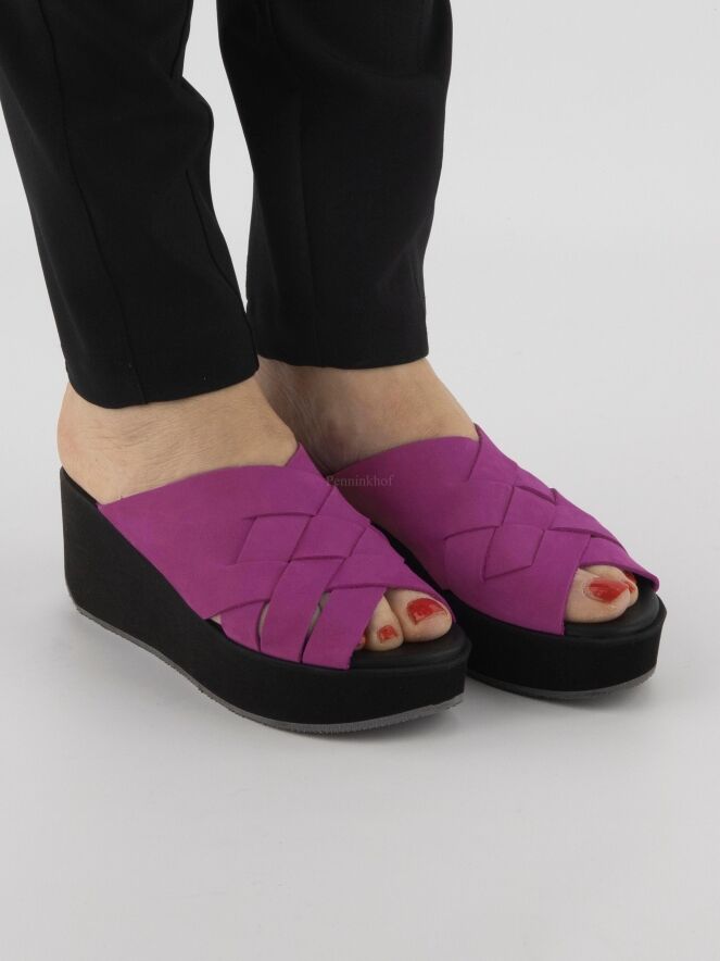 A platform slipper from Arche in the color fuchsia. The nubuck suede on the forefoot is braided. The footbed is in the same material and color as the leather over the forefoot.