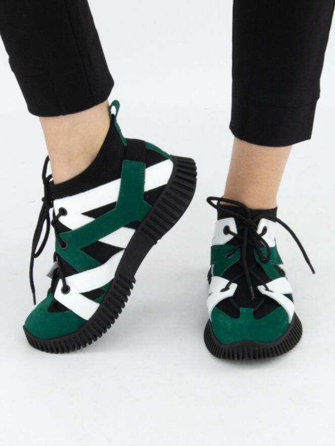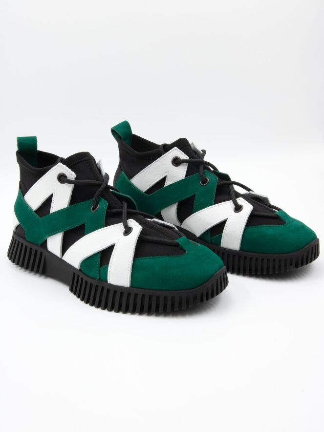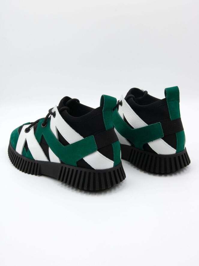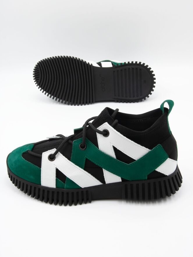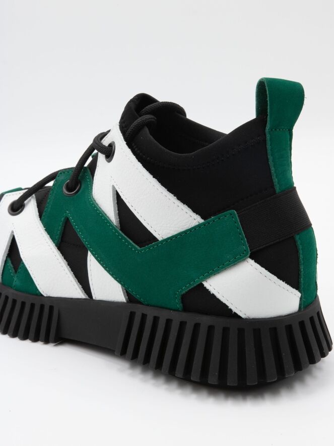 A designer sneaker from Arche in leather with a waterproof black sock. The leather is in white and green in diagonal stripes along the sides, with a round toe. The leather at the back is secured with an elastic band. The black sole is ribbed.