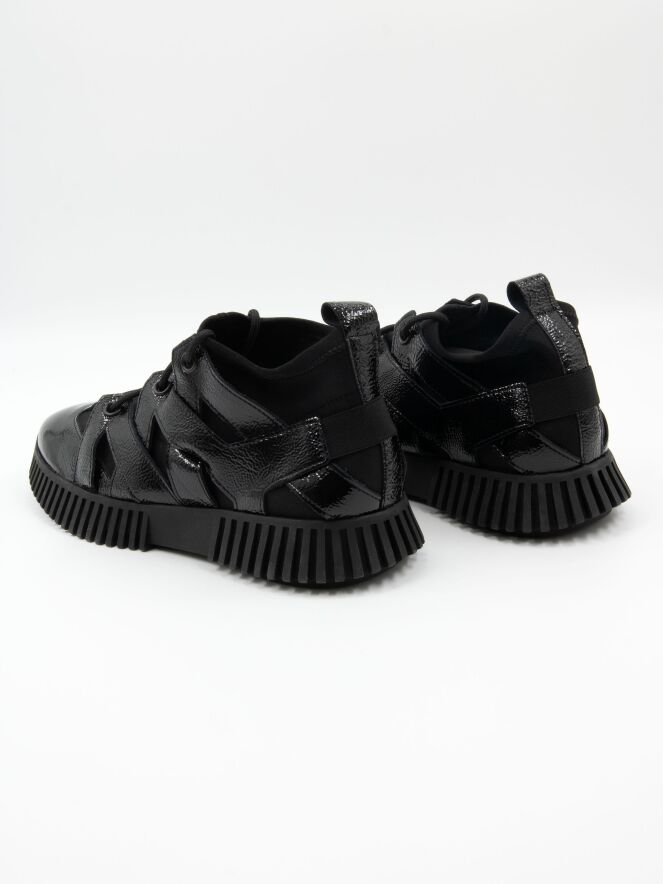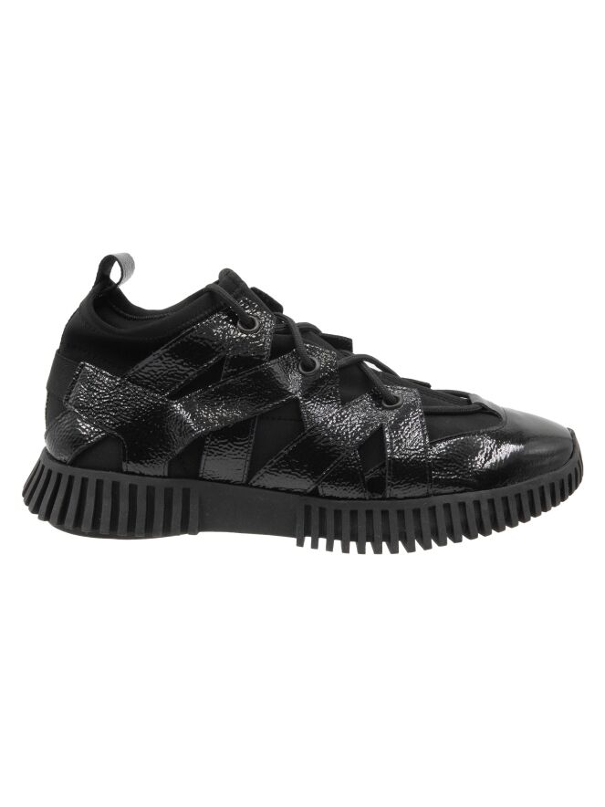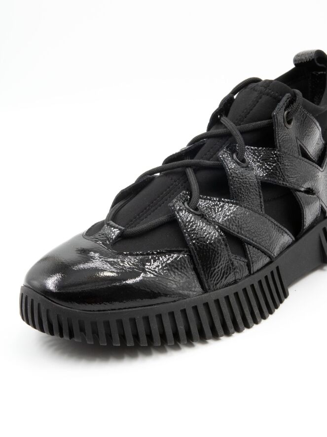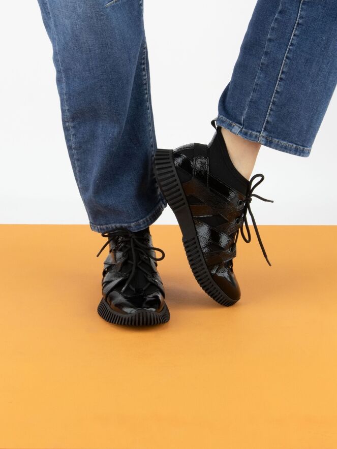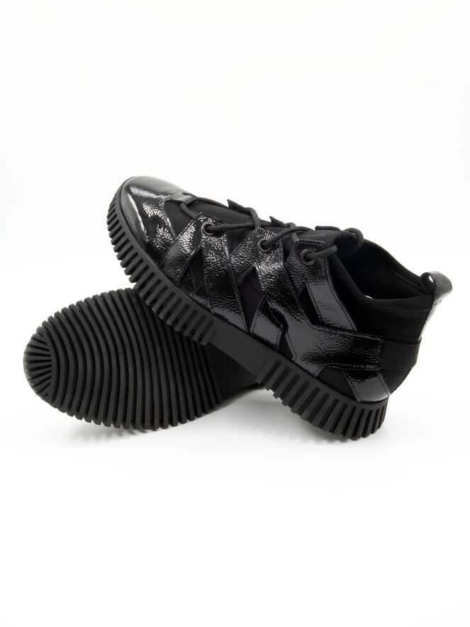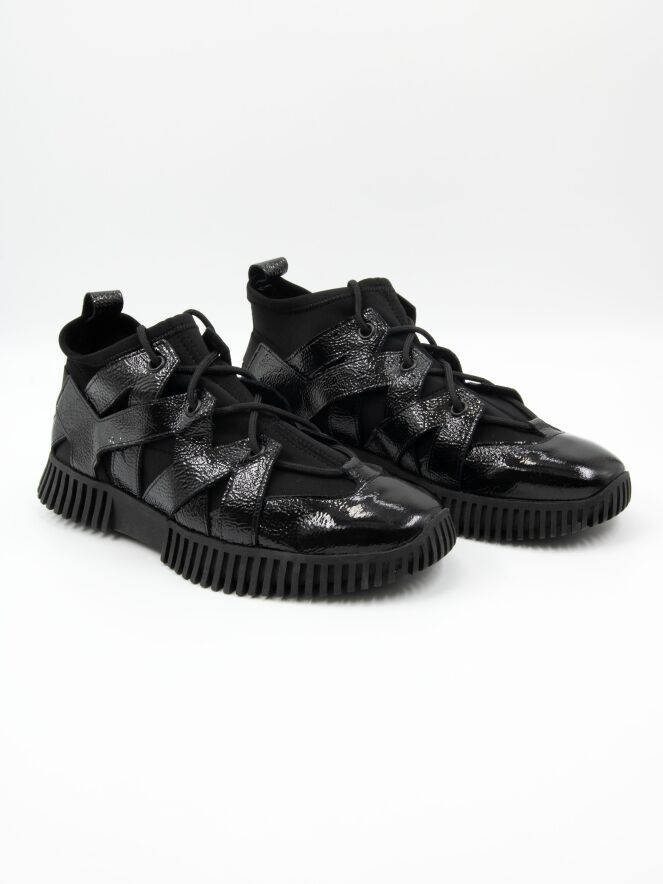 A designer sneaker by Arche in patent leather with a waterproof black sock insert. The patent leather is arranged in diagonal panels along the sides and features a rounded toe. At the back, the leather is connected with an elastic band. The black sole is ribbed.