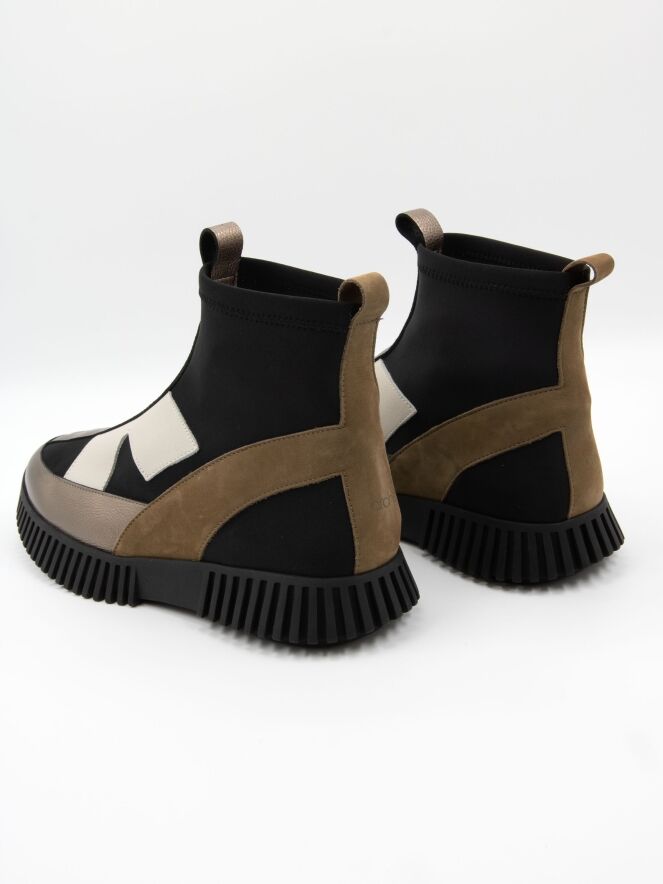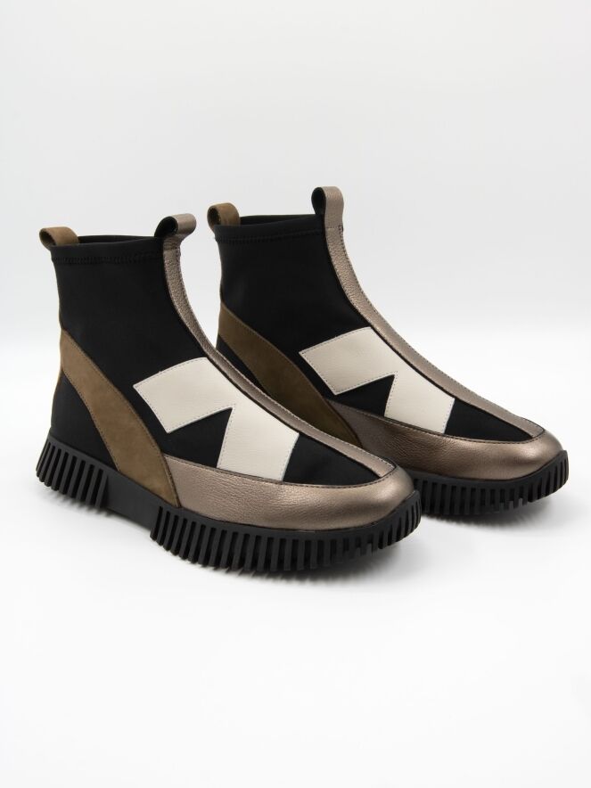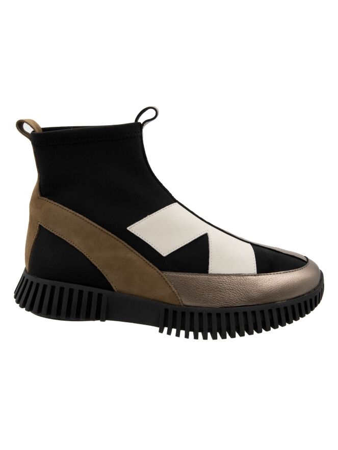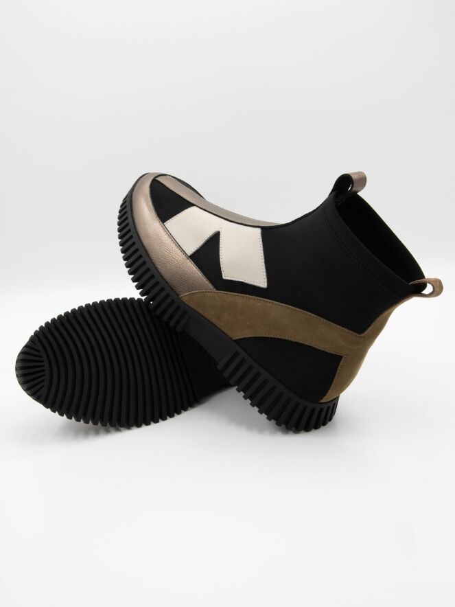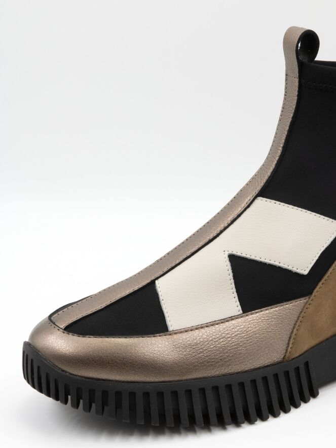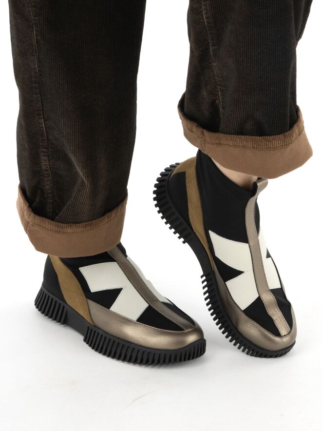 A high-design sneaker by Arche in leather and nubuck, featuring bronze, off-white and camel tones on a black background. The sneaker is crafted from soft timber leather, nubuck, and an elastic fabric. The black sole has a straight ridged profile.