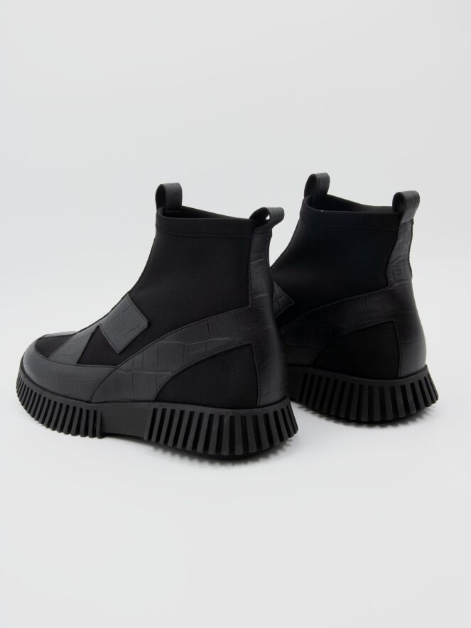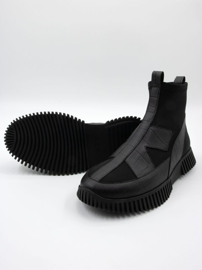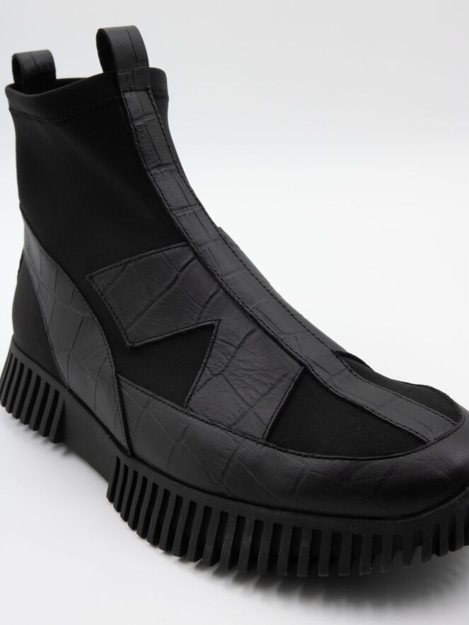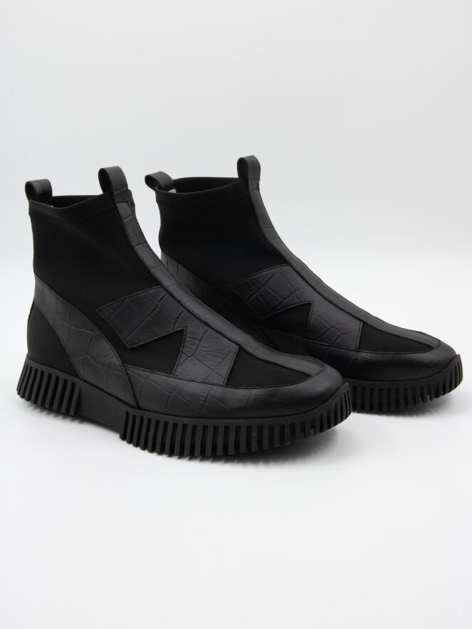 A high design sneaker from Arche in leather with an irregular chequered pattern embossed with black elastic. The sneaker is made of soft ‘timber leather’ and an elasticated fabric. The black sole is straight edged.
