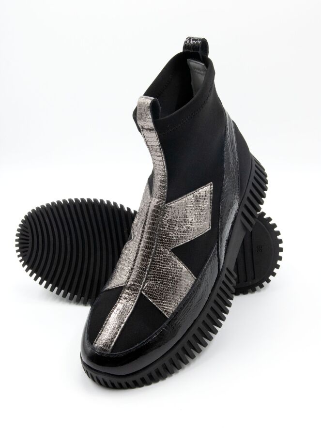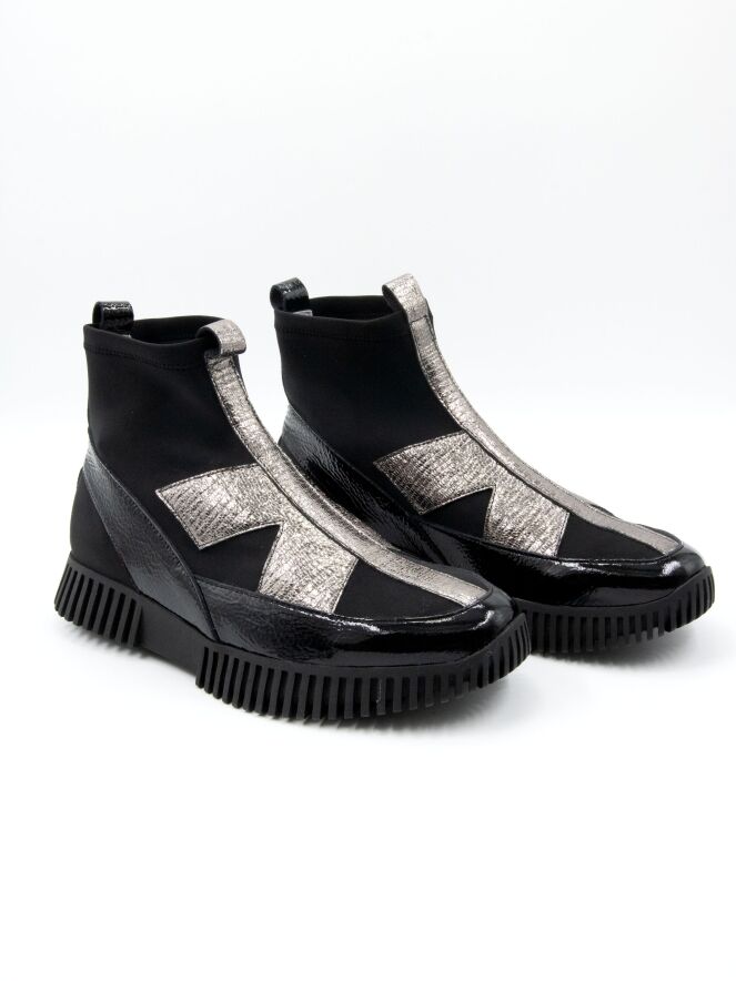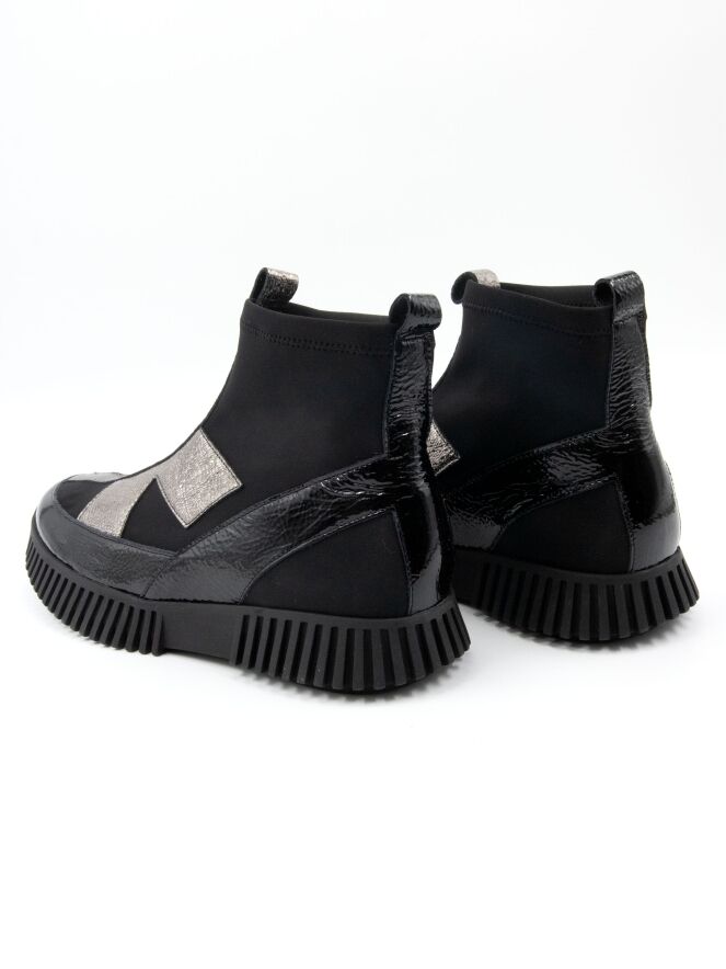 A high-top designer sneaker by Arche in silver color with black elastic and black patent leather. The sneaker is made of soft timber leather and elastic fabric. The black sole has a straight tread.