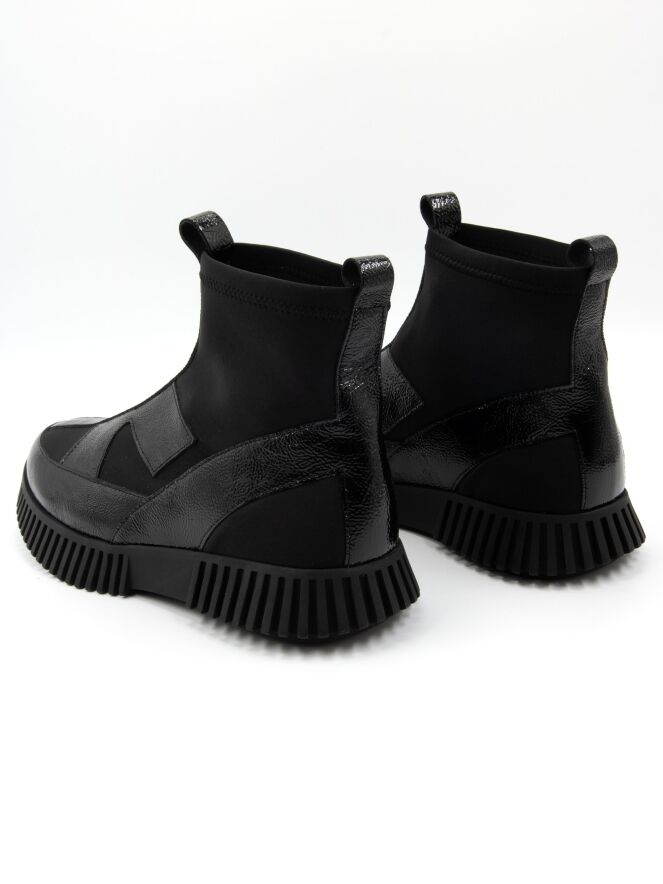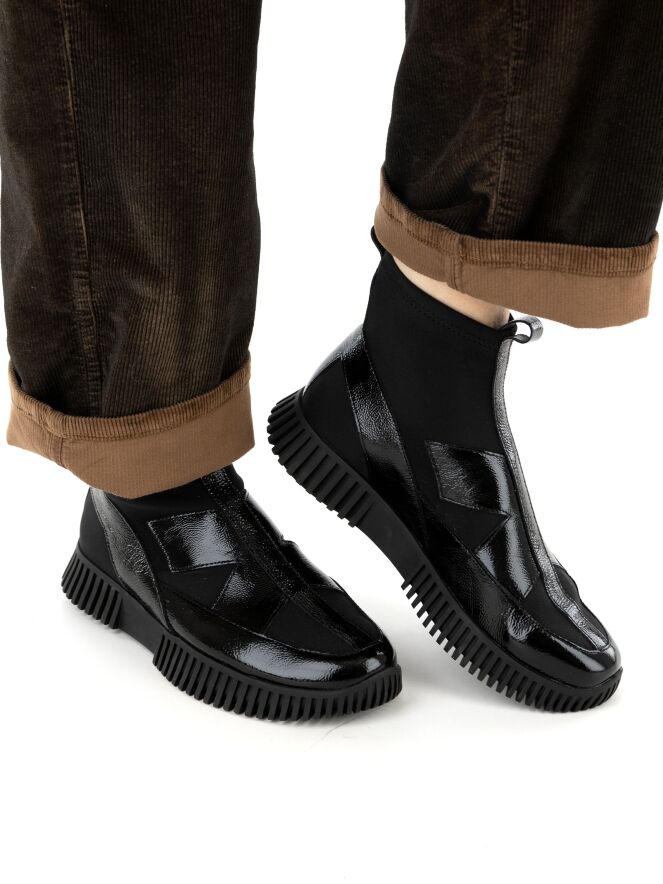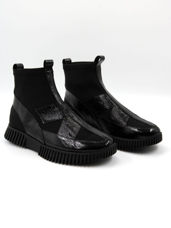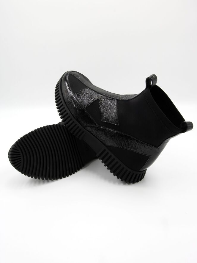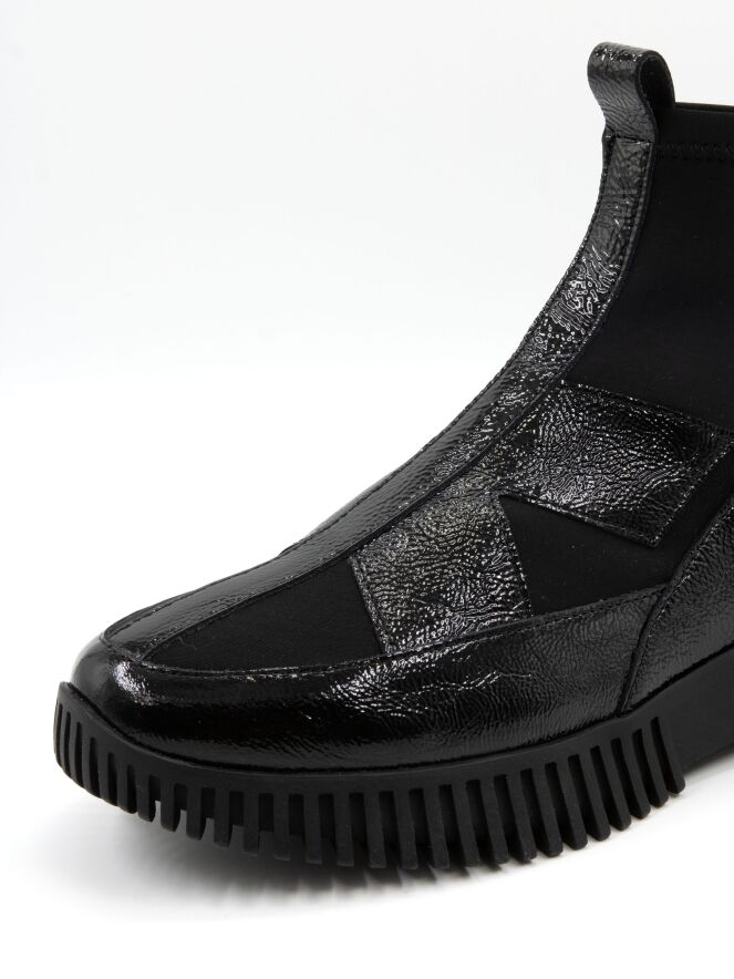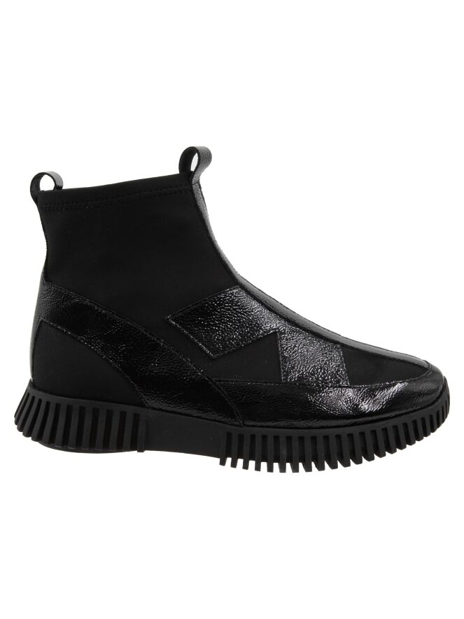 A high-design sneaker by Arche in crinkled patent leather with black elastic. The black sole has a straight ridged profile.