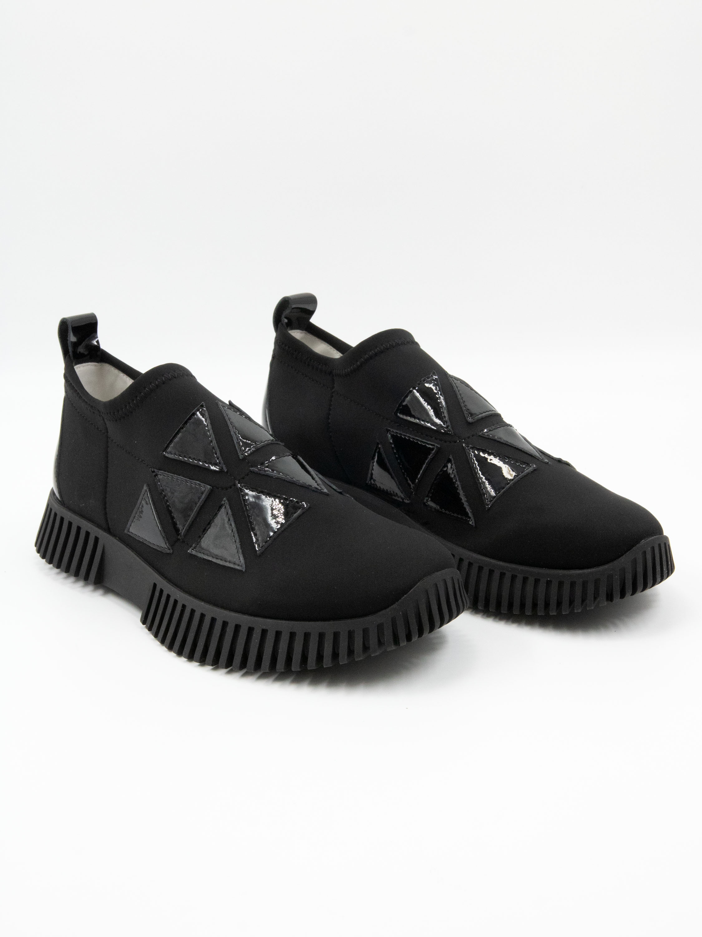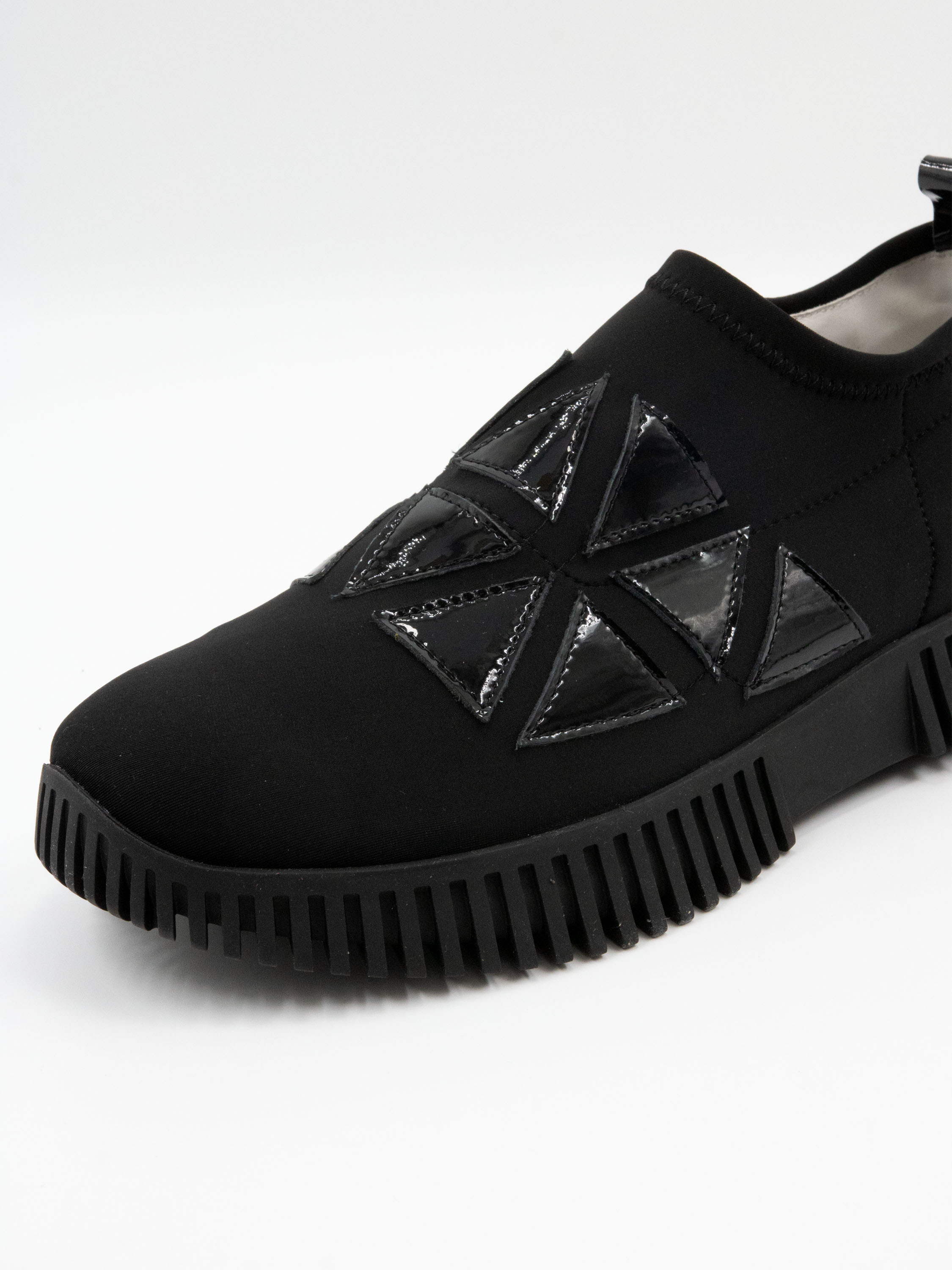 A slip-on by Arche in black fabric, featuring a geometric pattern of triangles in black patent leather. The heel is also finished in black patent leather. The black sole is ribbed.