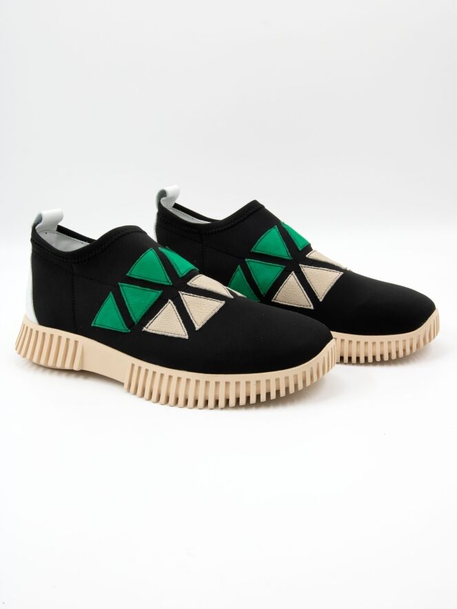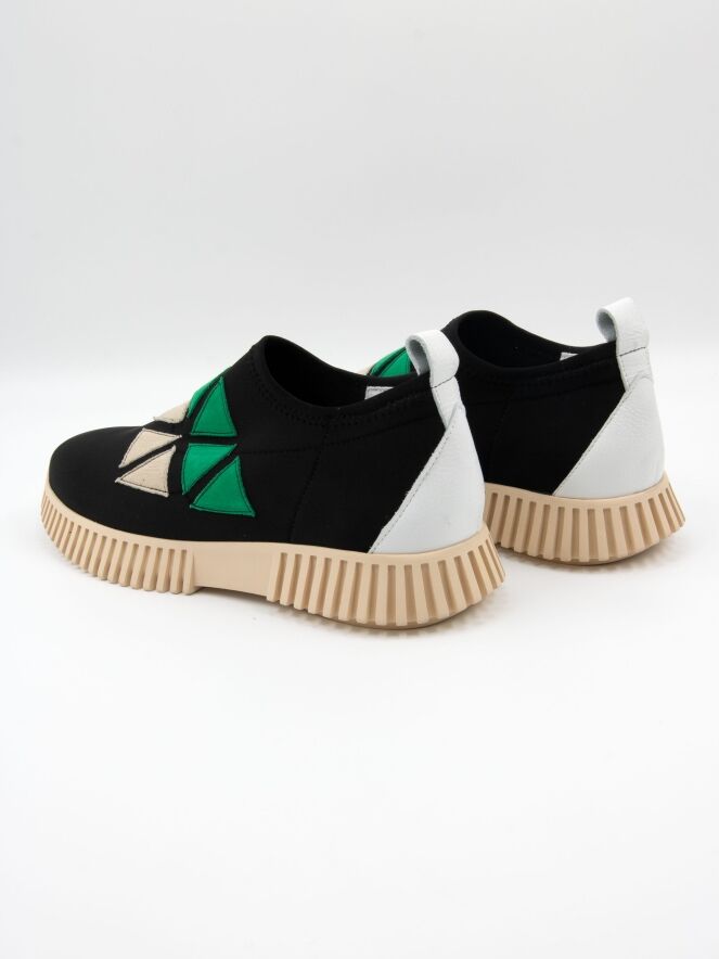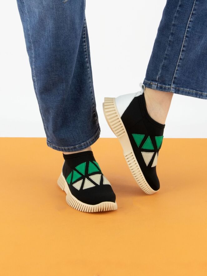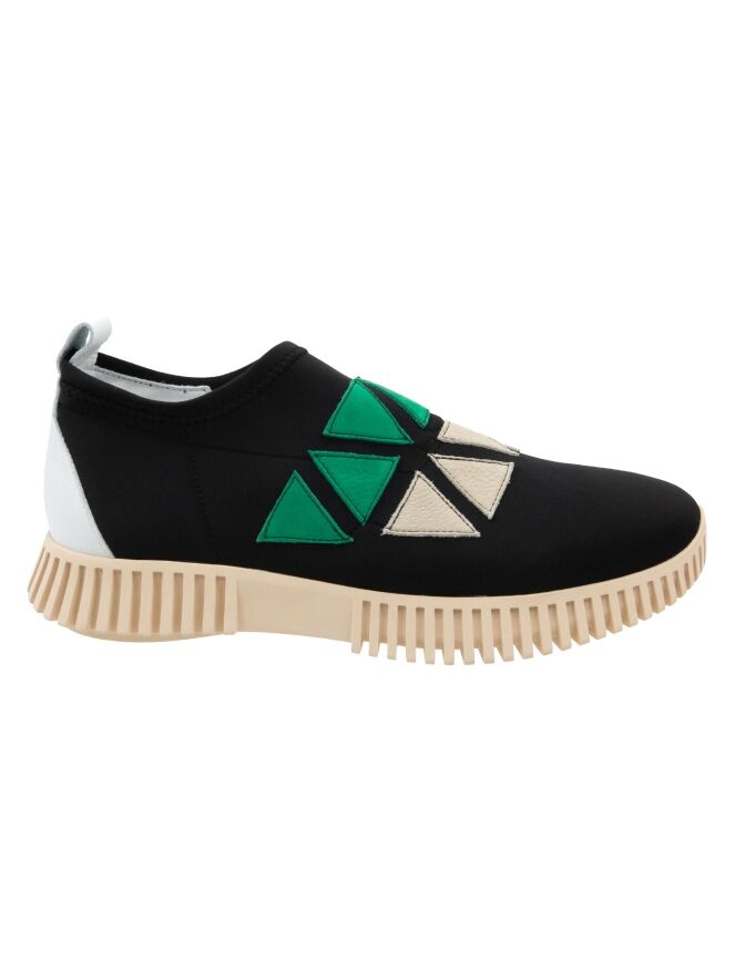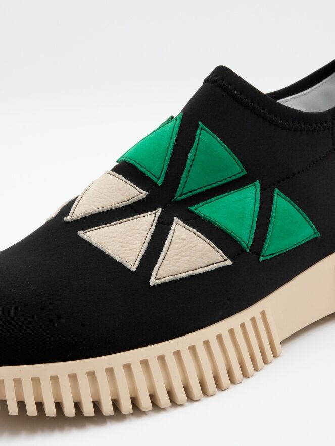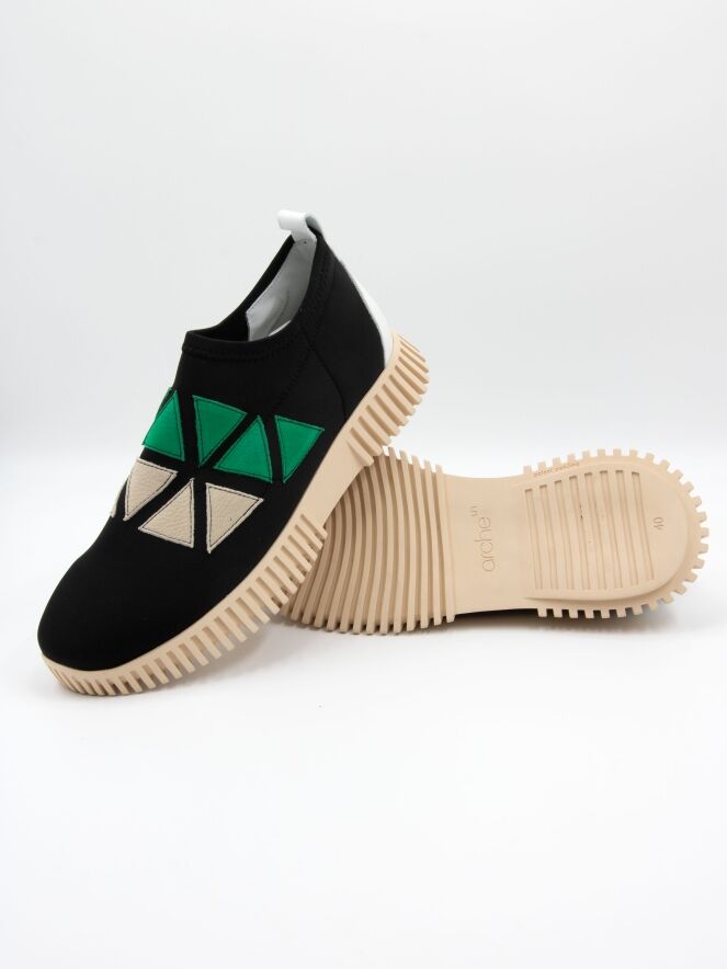 A slip-on shoe by Arche with a black fabric base, featuring a triangular pattern with off-white and green leather triangles. The heel is made of white leather. The off-white sole is ribbed.
