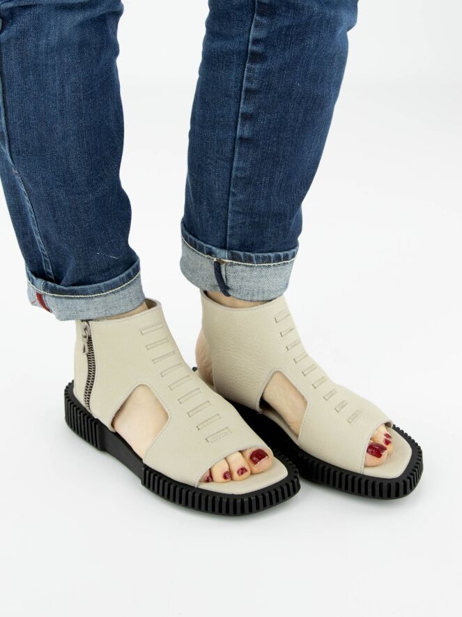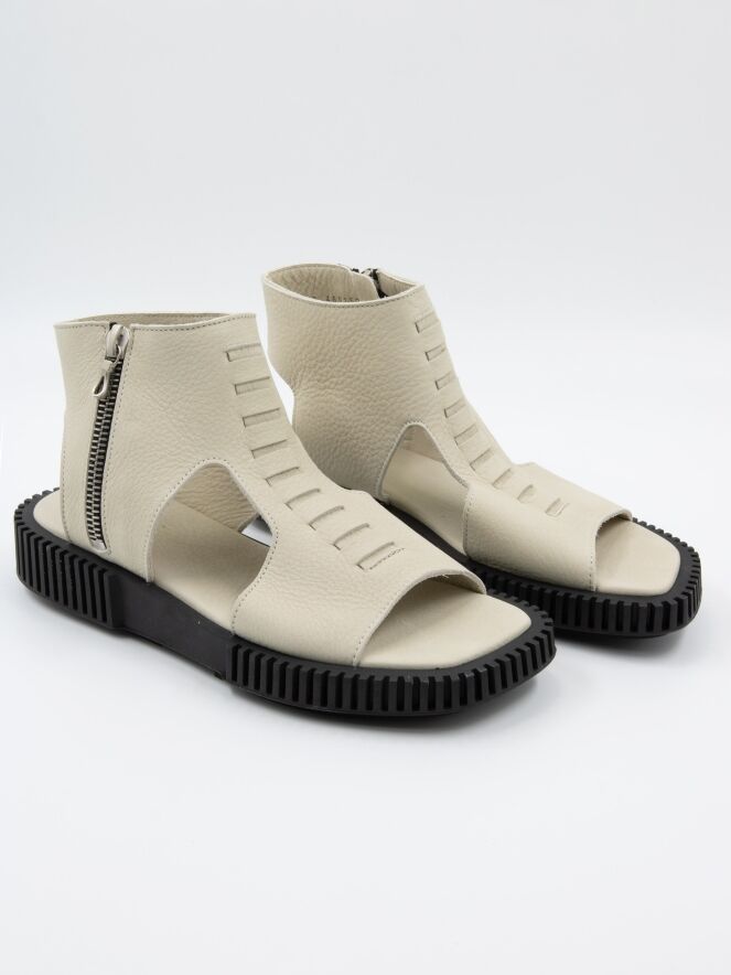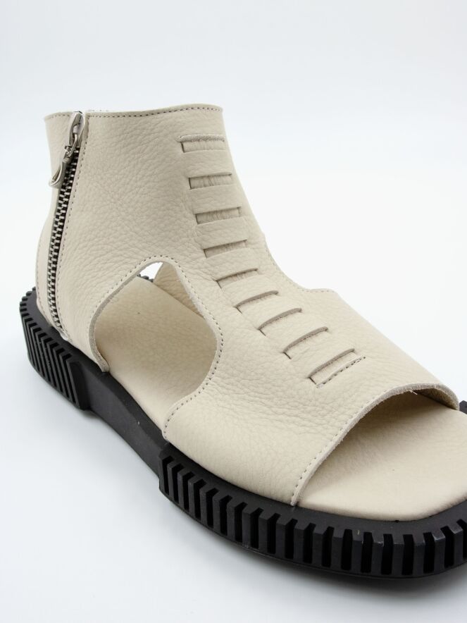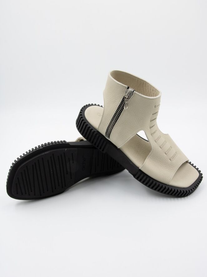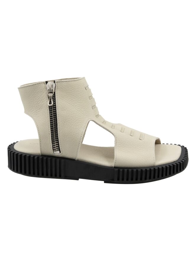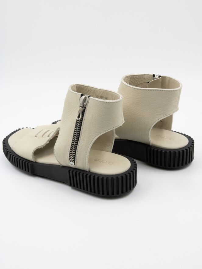A cream white sandal from Arche. The sandal features stripe-shaped openings across the middle of the forefoot, threaded with a leather strip. There is a silver zipper on the outer side. The sandal has an open heel and the edge of the sole is ribbed.