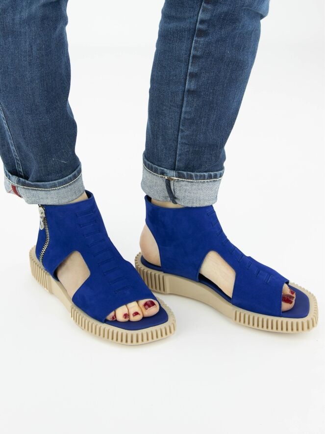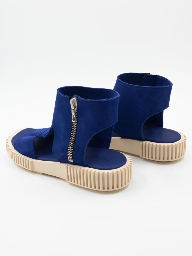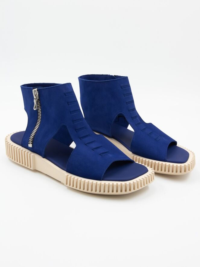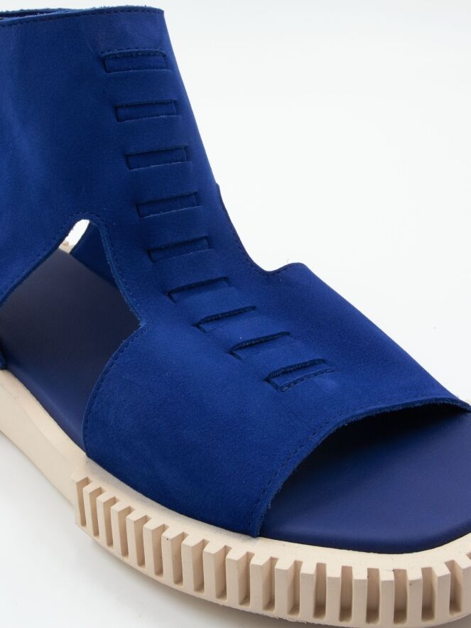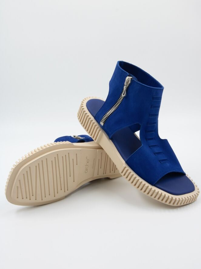 A cobalt blue sandal from Arche. The sandal features stripe-shaped openings across the middle of the forefoot, threaded with a leather strip. There is a silver zipper on the outer side. The sandal has an open heel and the edge of the sole is ribbed.