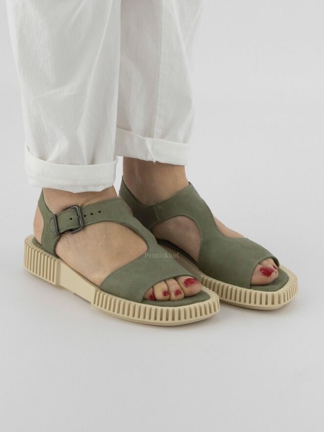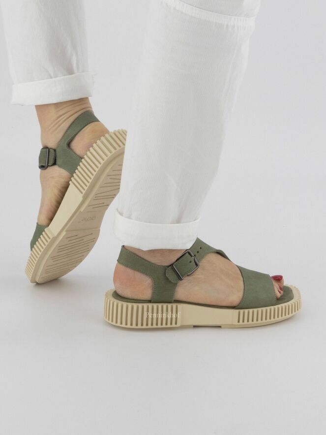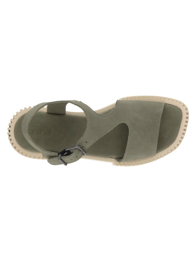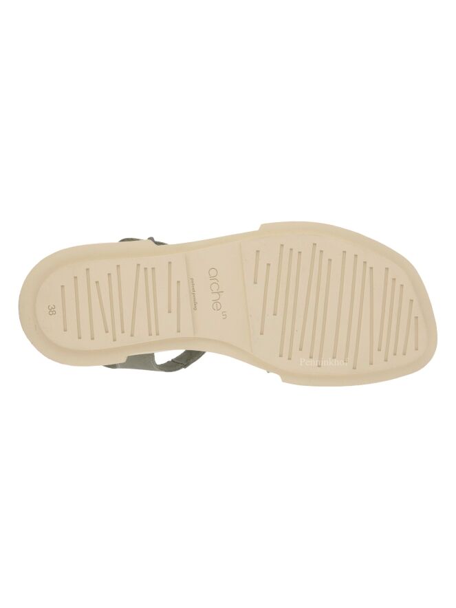An open sandal from Arche in the color olive green. The strap over the forefoot is adjustable with a buckle. The creamy white sole is serrated.