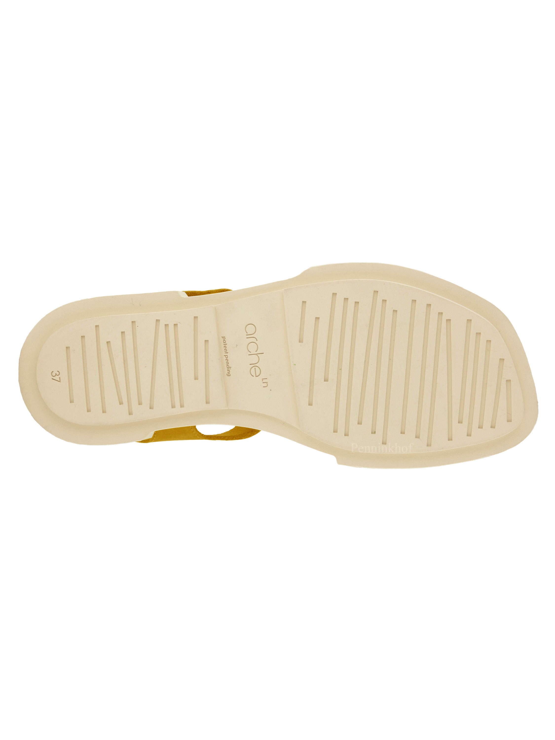 A sandal from Arche in an ocher yellow color. The sole is ribbed in straight lines. The closure around the foot is adjustable with Velcro.