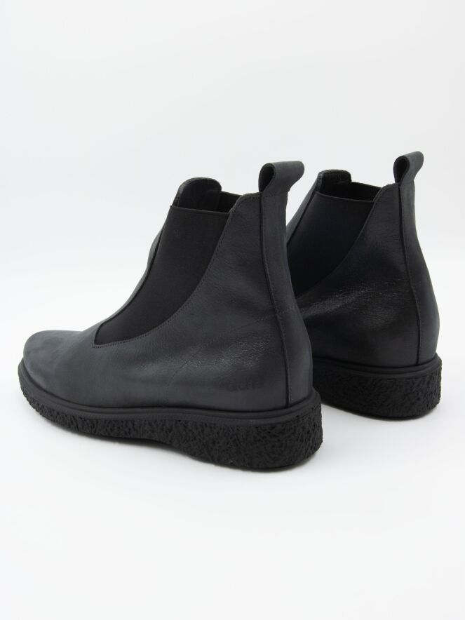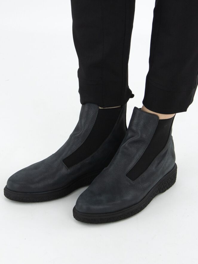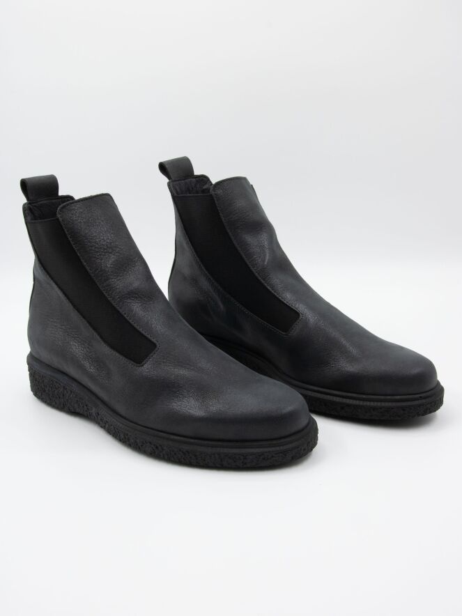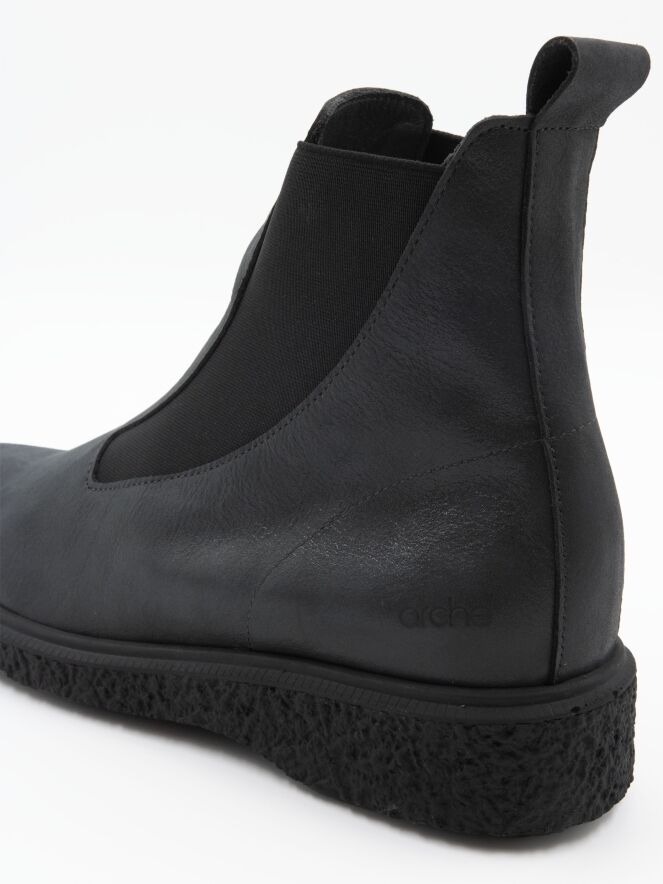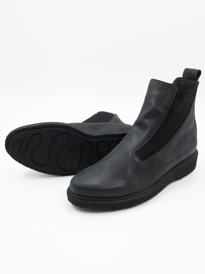 An ankle boot from Arche in dark grey. On both sides of the forefoot is an elastic fabric that is shaped to conform to the forefoot extending to the shaft. The interior is unlined.