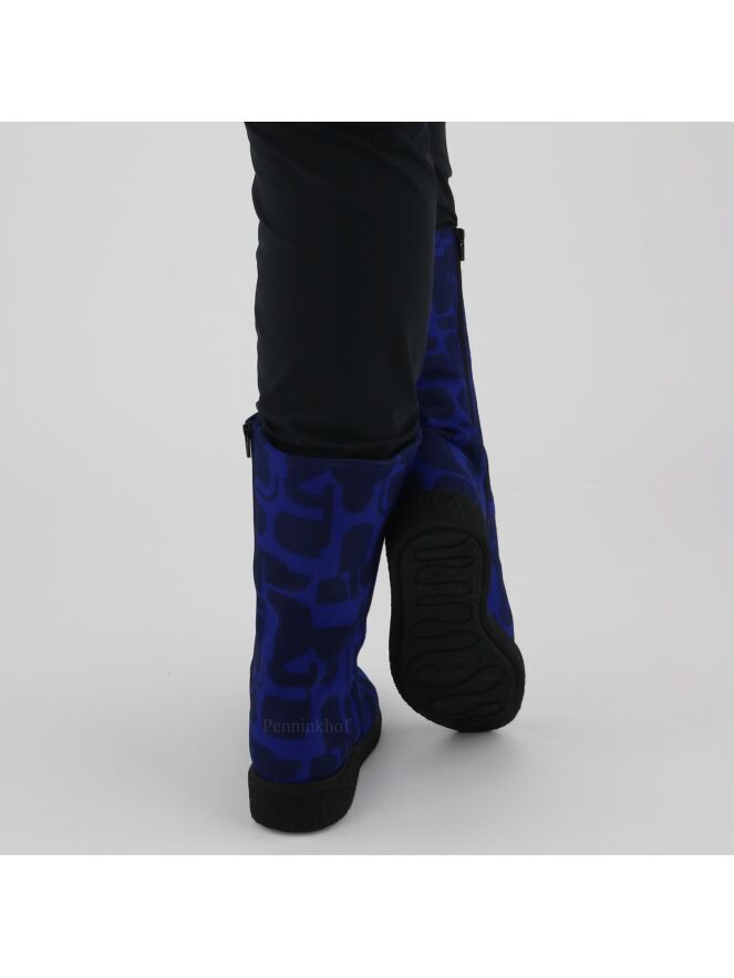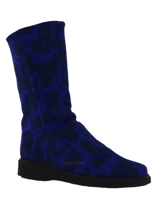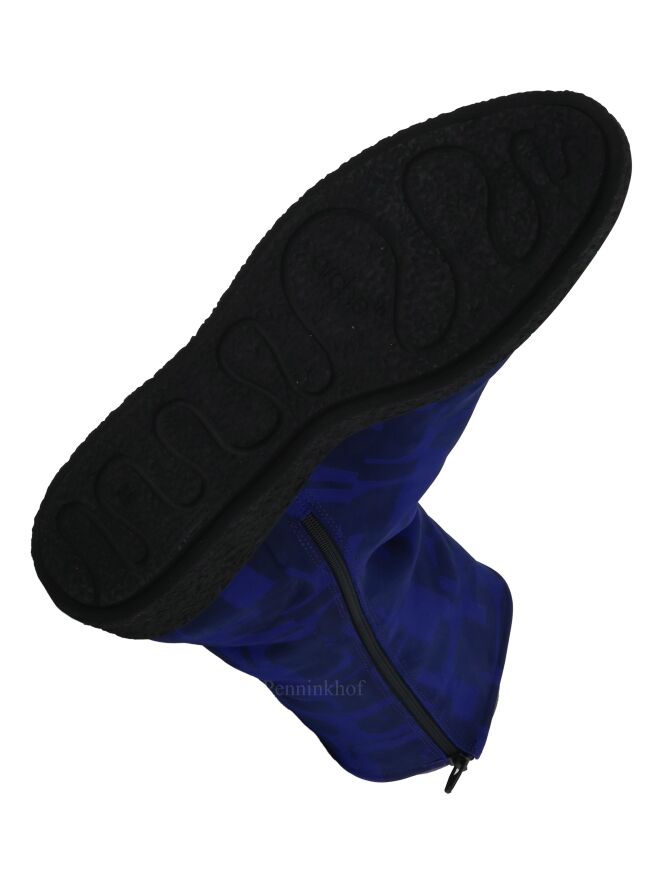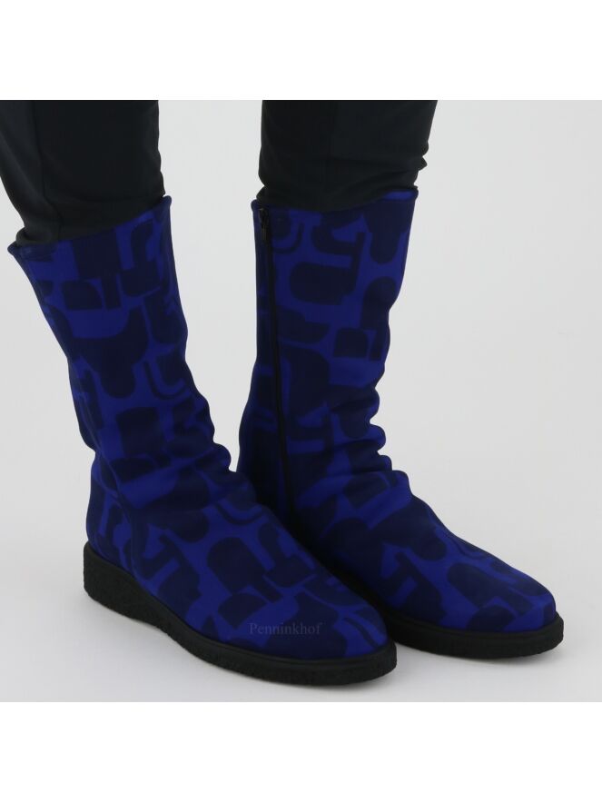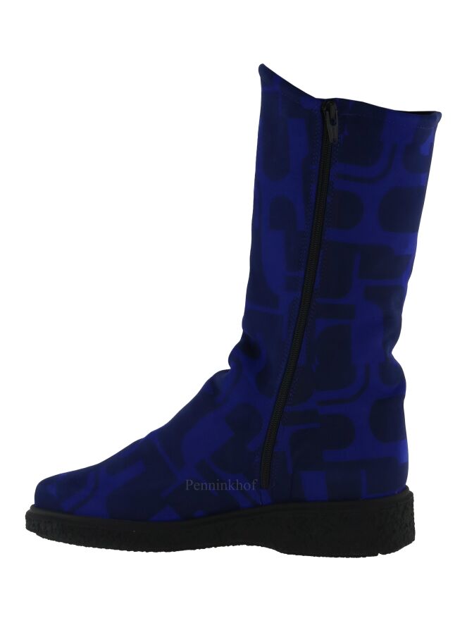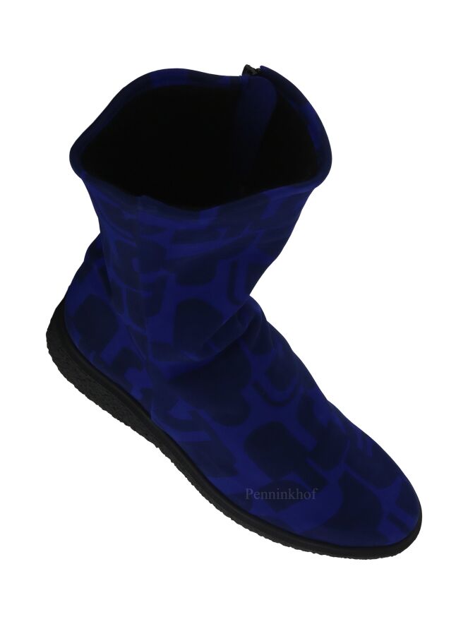 A half high boot from Arche in a graphic print with the colors cobalt blue and black. There is a black zipper on the inside. The sole is ribbed. The boot has a round toe and the inside is lined with boiled wool.